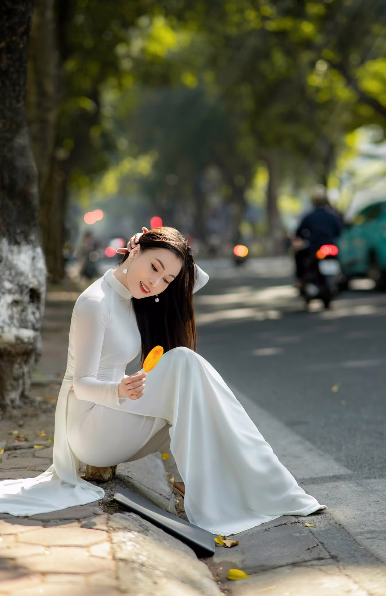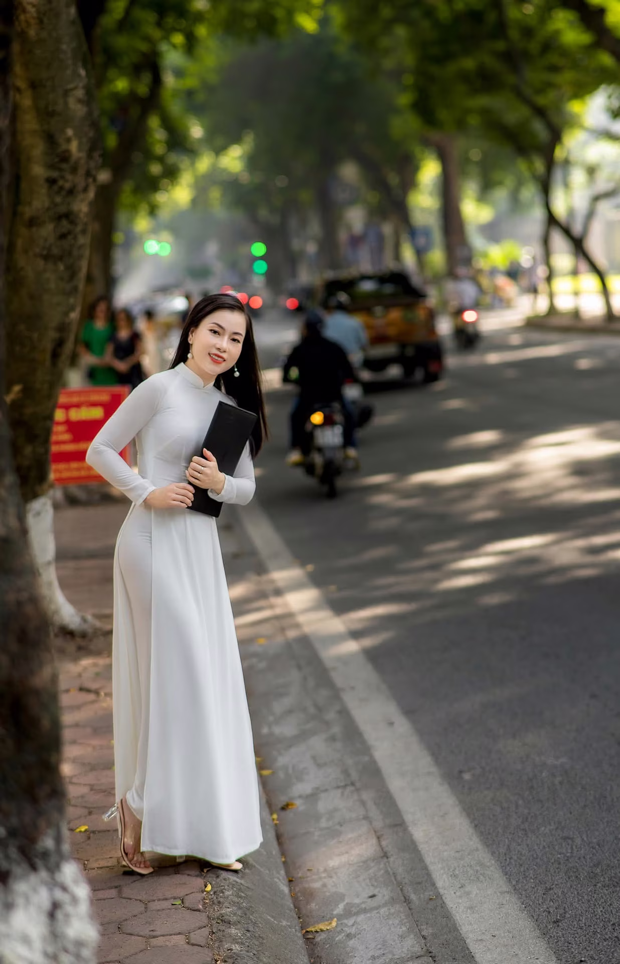 This VGU No.106 photograph captures the exquisite beauty of a graceful Vietnamese woman, radiating elegance and charm. She dons a vibrant red attire, subtly evoking traditional aesthetics with a modern flair. Her poised stance and captivating gaze perfectly complement the poetic scenery of Hoan Kiem Lake, the iconic heart of Hanoi. In the background, the serene lake reflects the gentle sunlight, alongside the characteristic red bridge and distant city skyline, creating a harmonious blend of heritage and urban development. This image not only celebrates the allure of Vietnamese women but also serves as an invitation to explore the rich culture and distinctive landscapes of Hanoi, offering an unforgettable experience for anyone who beholds it. #Vietnamese #pretty #charmVGU No.105: Serene Beauty A Vietnamese Girl in Elegant White Áo Dài