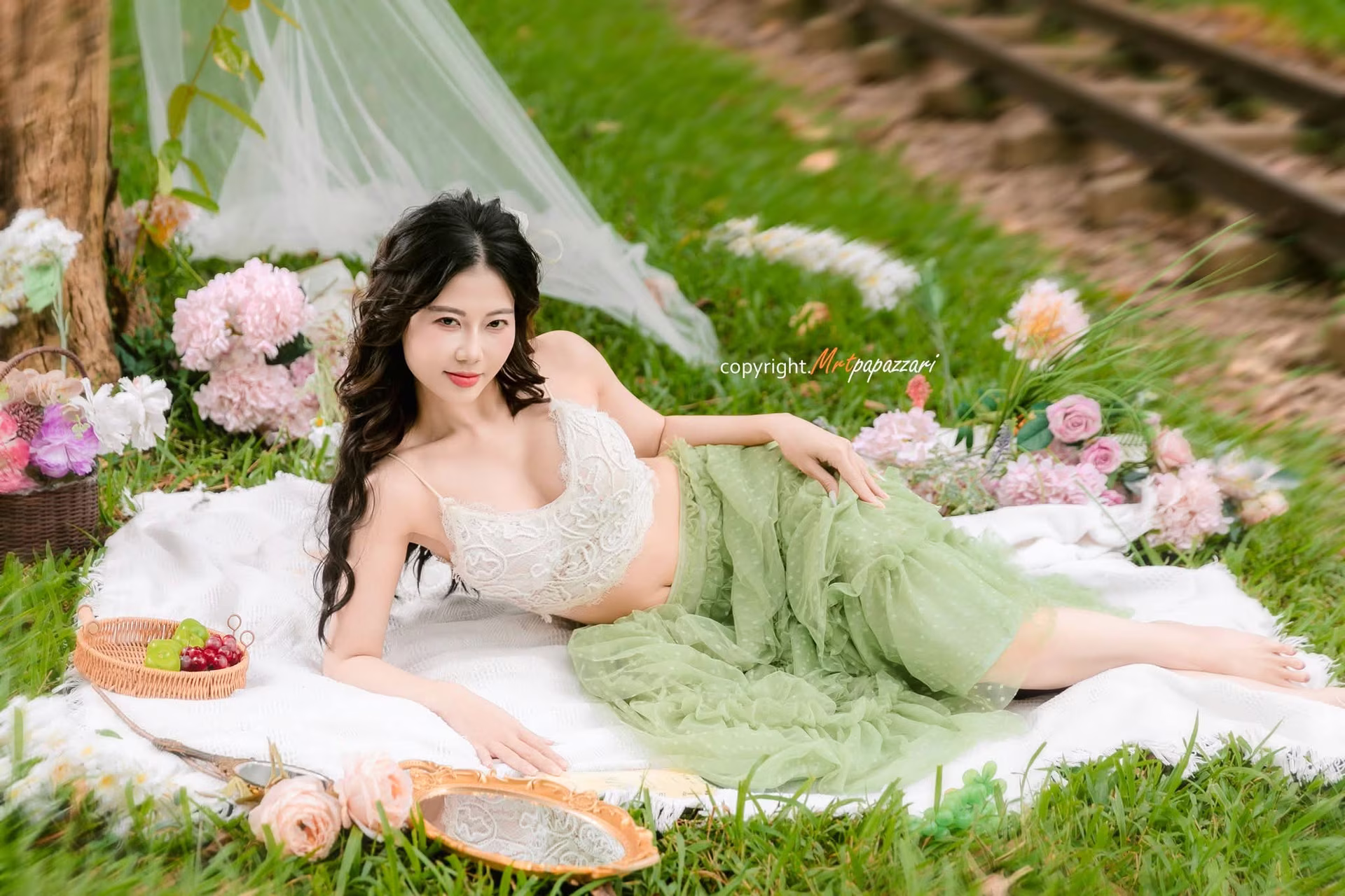 This VGU No.74 image beautifully captures a woman embodying the serene charm often associated with Vietnamese beauty, set amidst a truly dreamy natural landscape. Her gentle expression, flowing dark hair, and captivating eyes exude a pure and elegant aura. Dressed in a delicate green gown, surrounded by soft pink flowers and lush greenery, she blends seamlessly into the picturesque setting. The scene evokes a sense of peace and enchantment, highlighting the graceful allure of the beautiful woman and the poetic beauty of her surroundings. It's a moment of pure visual delight. #Vietnamese #pretty #charmVGU No.73: Ethereal Butterfly Beauty A Dreamlike Vision Unveiled