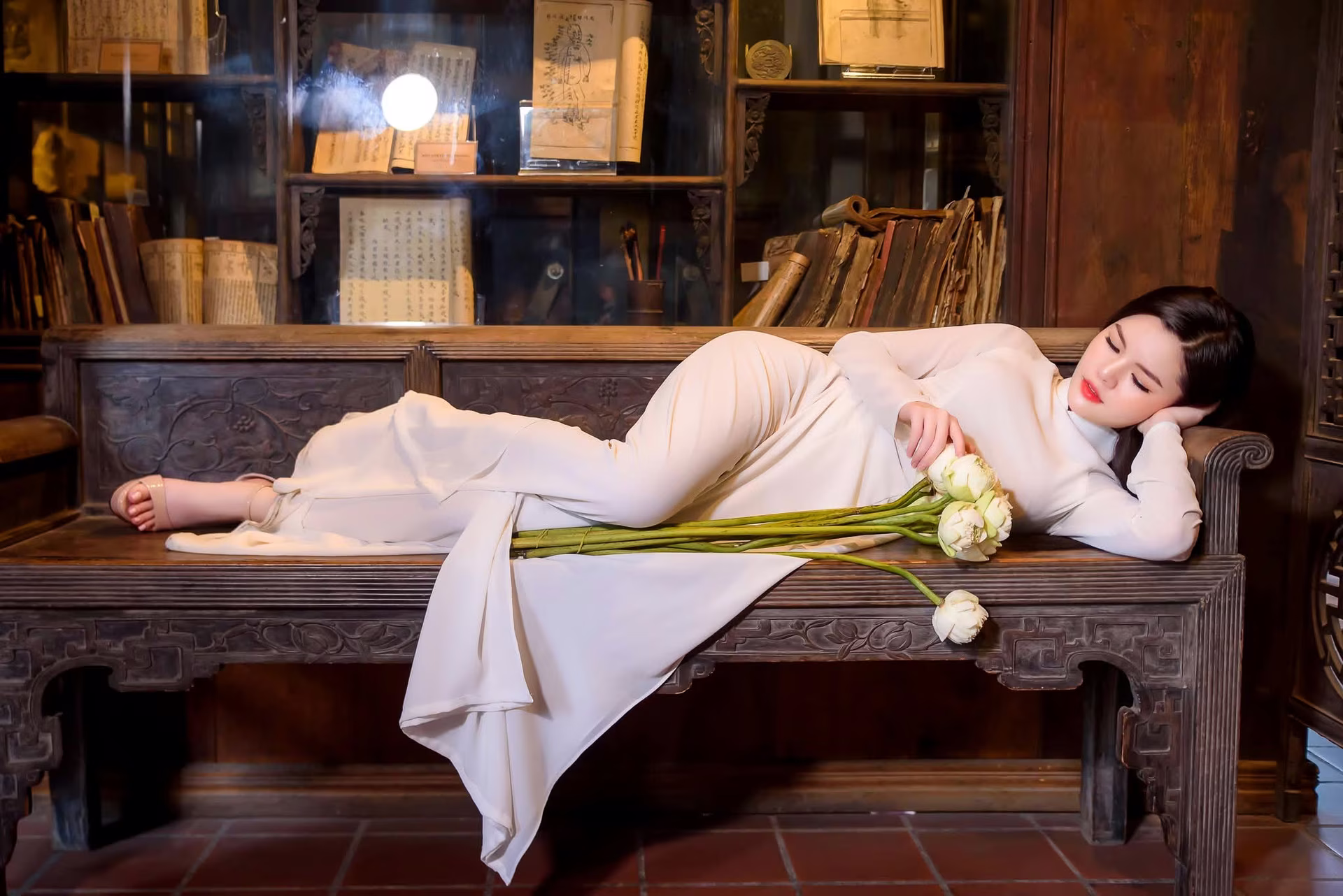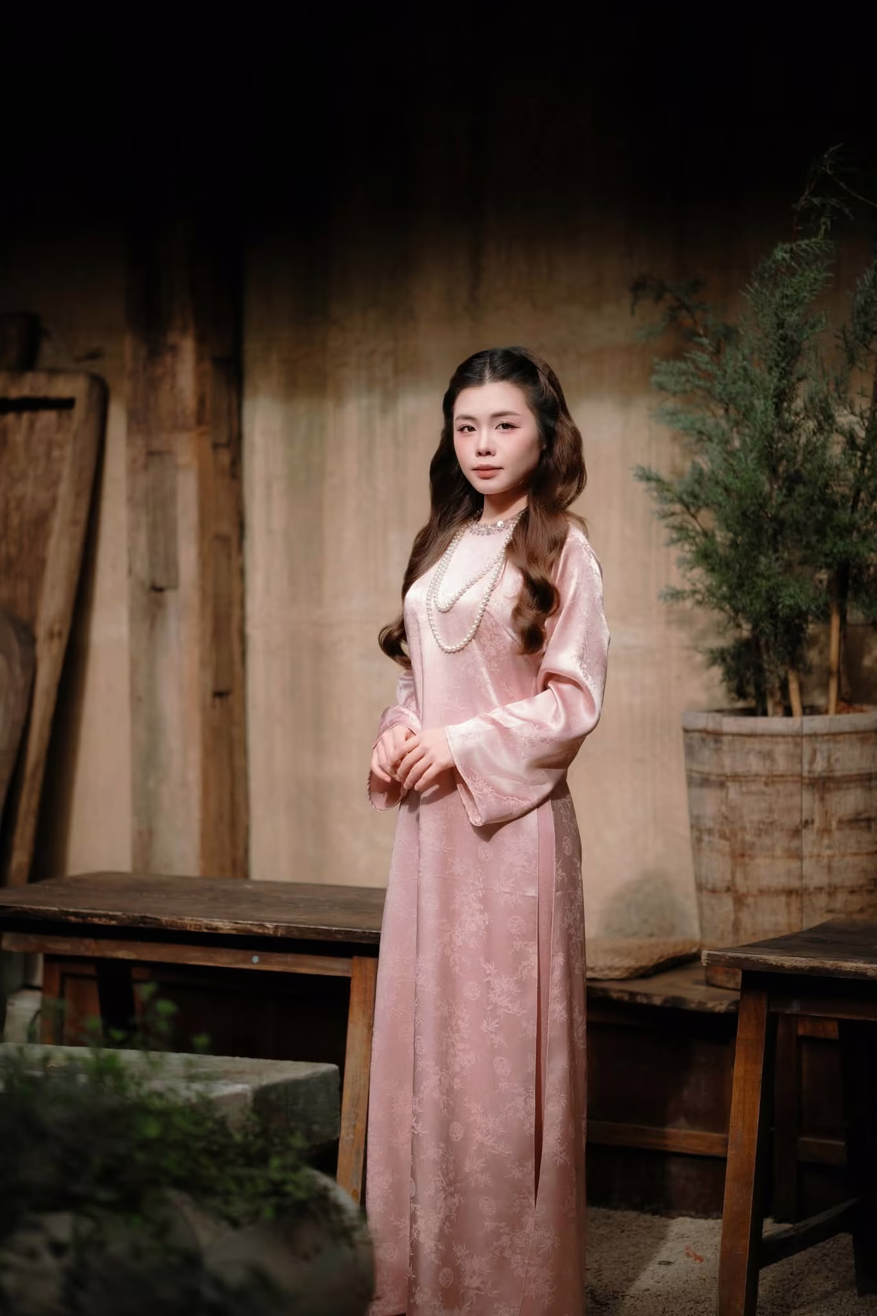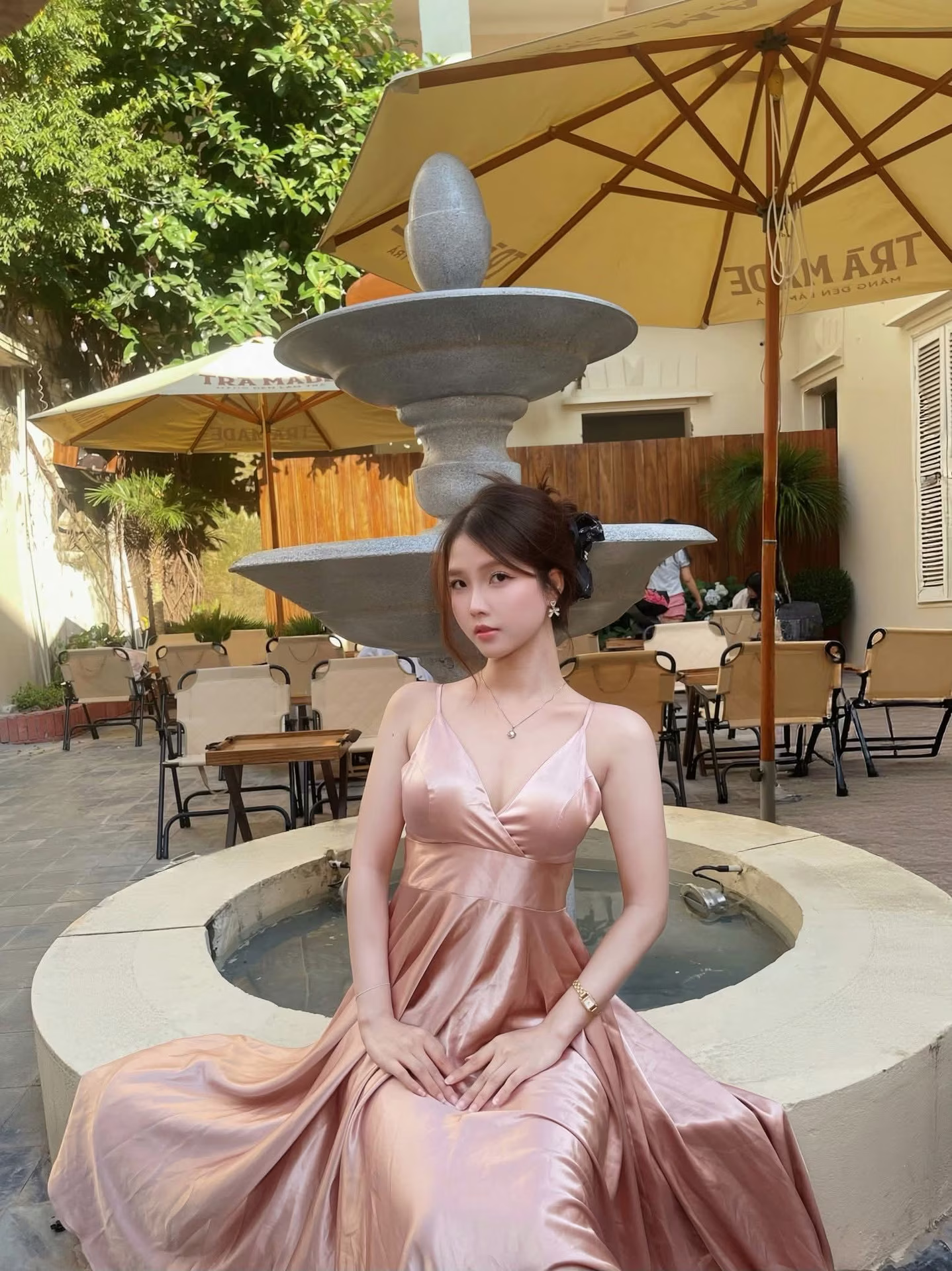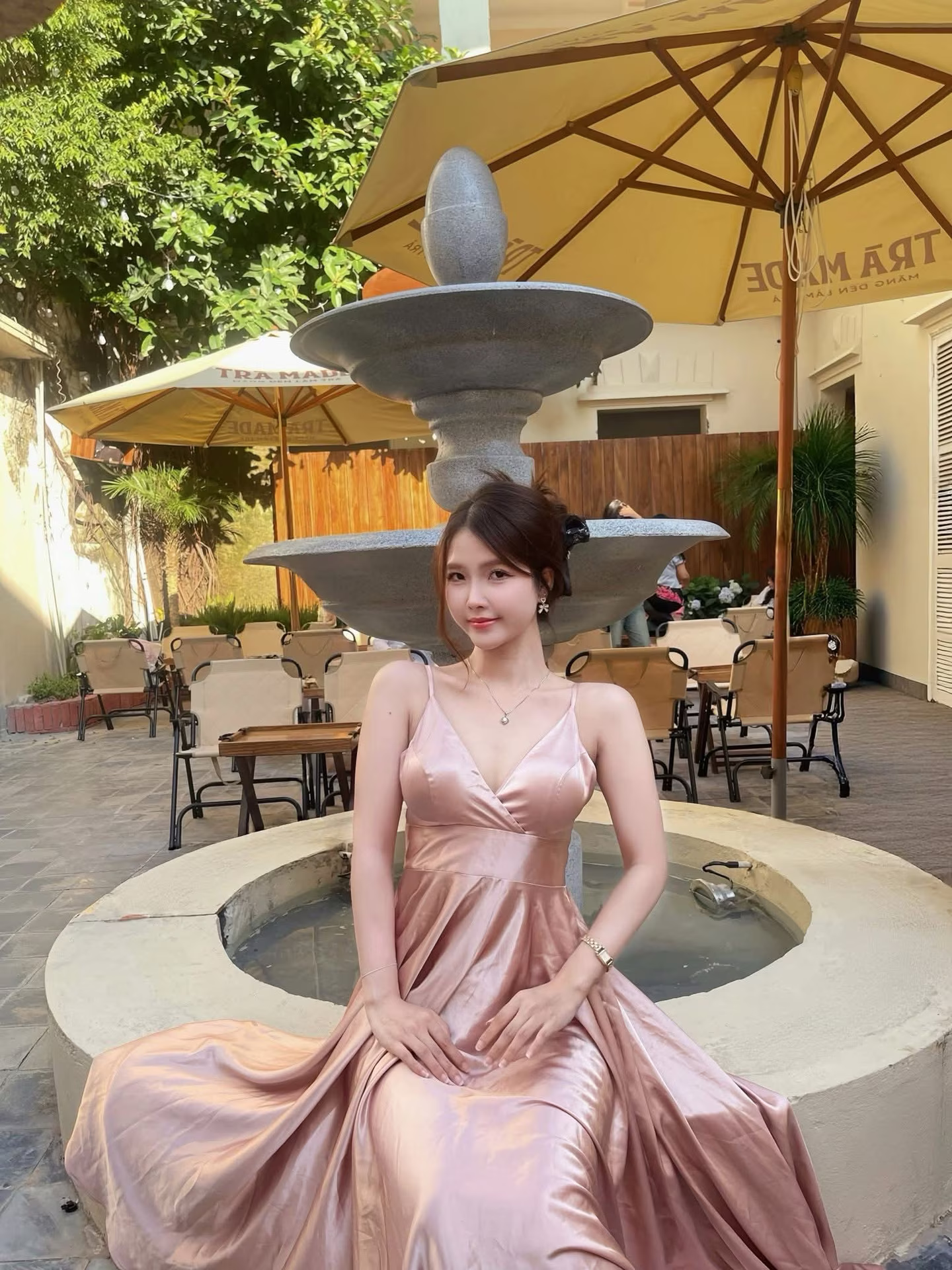Image VGU No.72 portrays a young woman with a poetic and gentle beauty. She sits gracefully by an antique fountain, adorned in a soft pink silk dress, creating a truly dreamy image. Her clear eyes and gentle smile exude elegance and allure. The pink silk attire enhances her graceful figure, blending harmoniously with the romantic backdrop of the fountain, bringing a sense of peace and captivating charm. This moment beautifully preserves the natural, vibrant, and irresistible grace of the young lady. #Vietnamese #pretty #charmVGU No.71: Discover the Allure of Purple Ao Dai Lotus Flowers and Vietnamese Tradition.