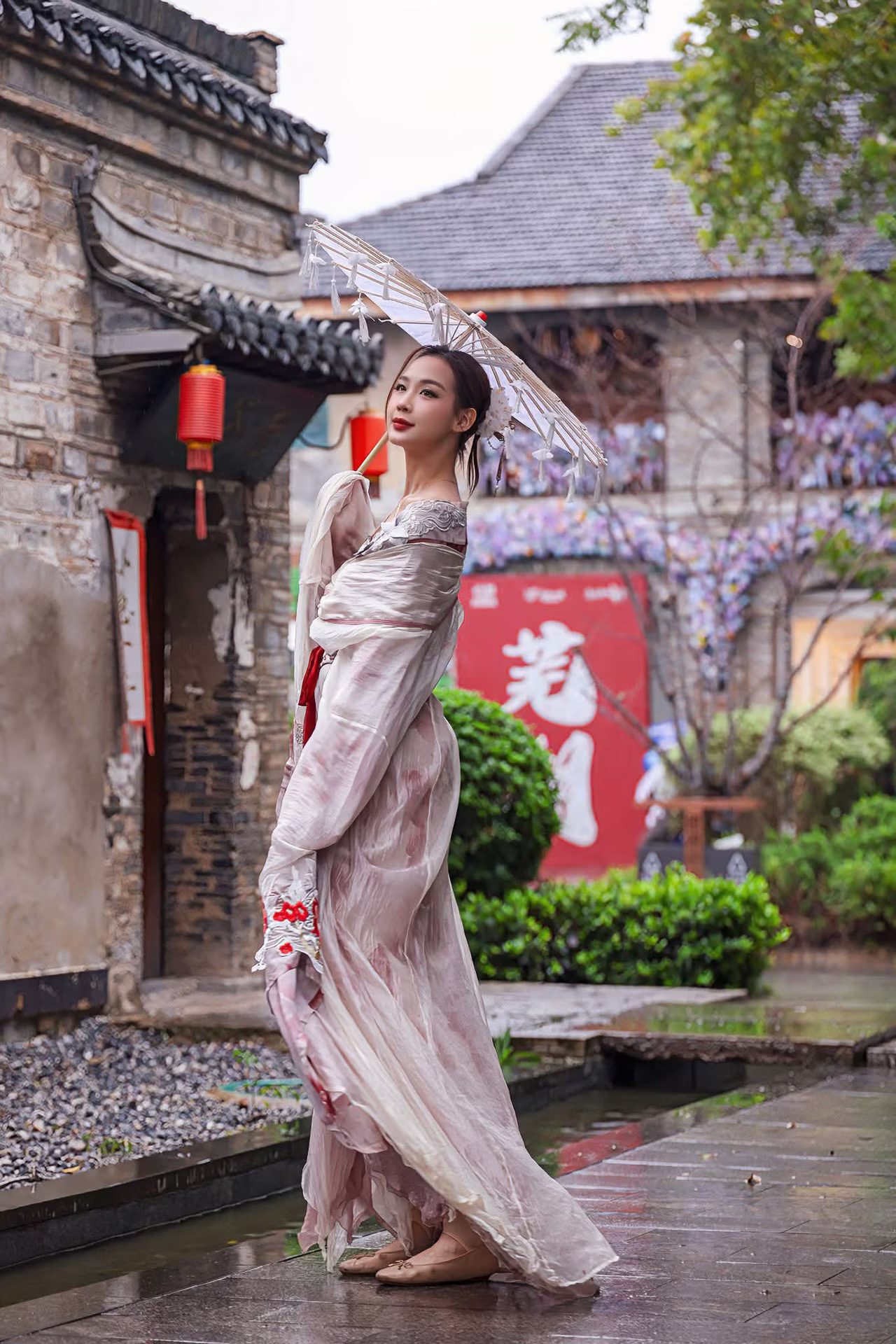The photo VGU No.84 captures a beautiful moment of a Vietnamese woman in a pristine white Ao Dai. She stands gracefully on a luxurious red-carpeted staircase, creating a poetic and elegant scene. The Ao Dai gently embraces her slender figure, highlighting the delicate and noble beauty characteristic of East Asian women. Her long wavy dark hair and subtle smile exude confidence and timeless beauty. This is not just an outfit but also a profound cultural symbol, representing the grace and pride of the Vietnamese people. The image harmoniously blends traditional essence with modern allure, evoking deep emotions about cultural values. #Vietnamese #pretty #charmVGU No.83: Radiant Pink Kimono Beauty in Old Japan Street – Experience Traditional Culture