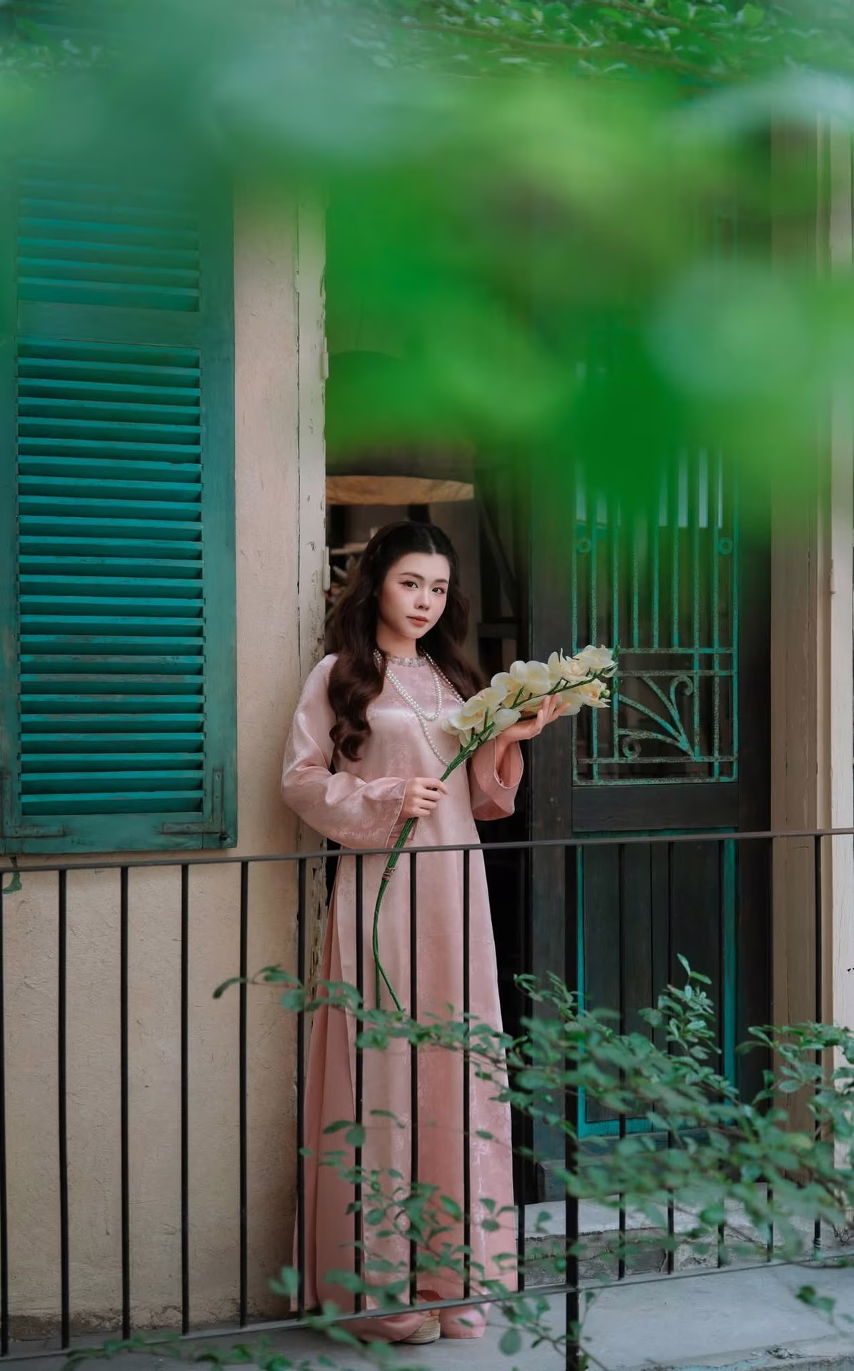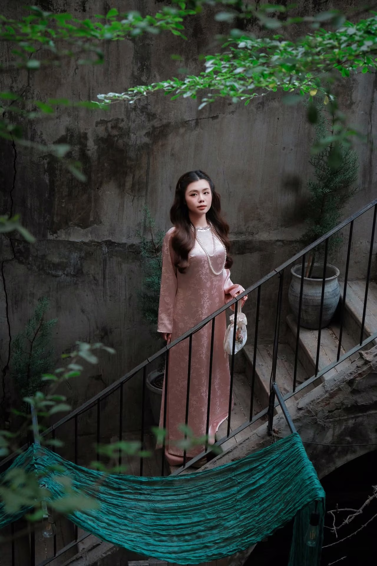 VGU No.80 captures the gentle and elegant beauty of a Vietnamese girl in a light pink ao dai Standing on an old staircase her gaze is deep reflecting the grace and traditional charm of an East Asian woman The flowing ao dai perfectly embraces her figure highlighting sophistication and poise The ancient backdrop with moss-covered walls and lush greenery creates a nostalgic atmosphere emphasizing the timeless beauty of the subject This is more than just a picture it is a story of Vietnamese culture and soul #Vietnamese #pretty #charmVGU No.79: Elegant Vietnamese Ao Dai Beauty on Hanoi Train Street