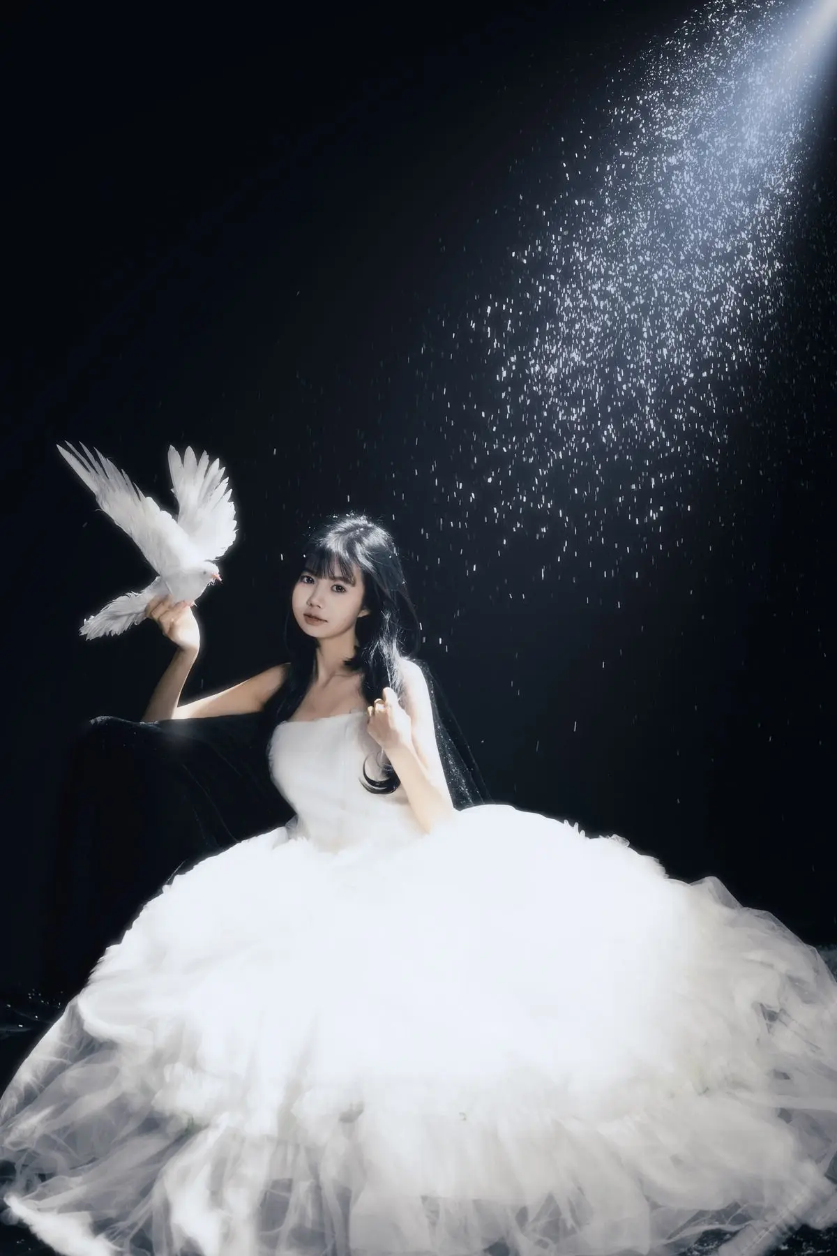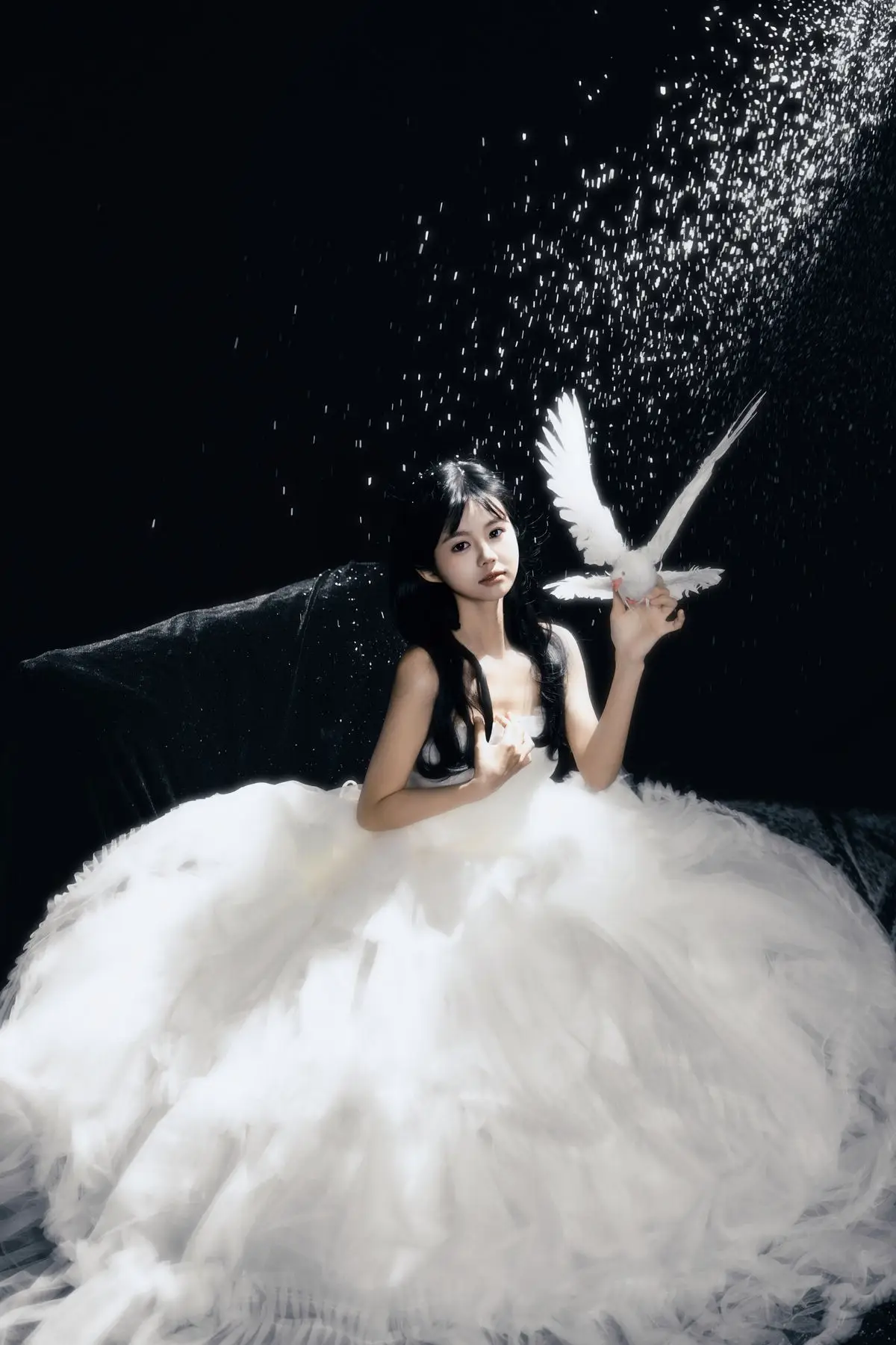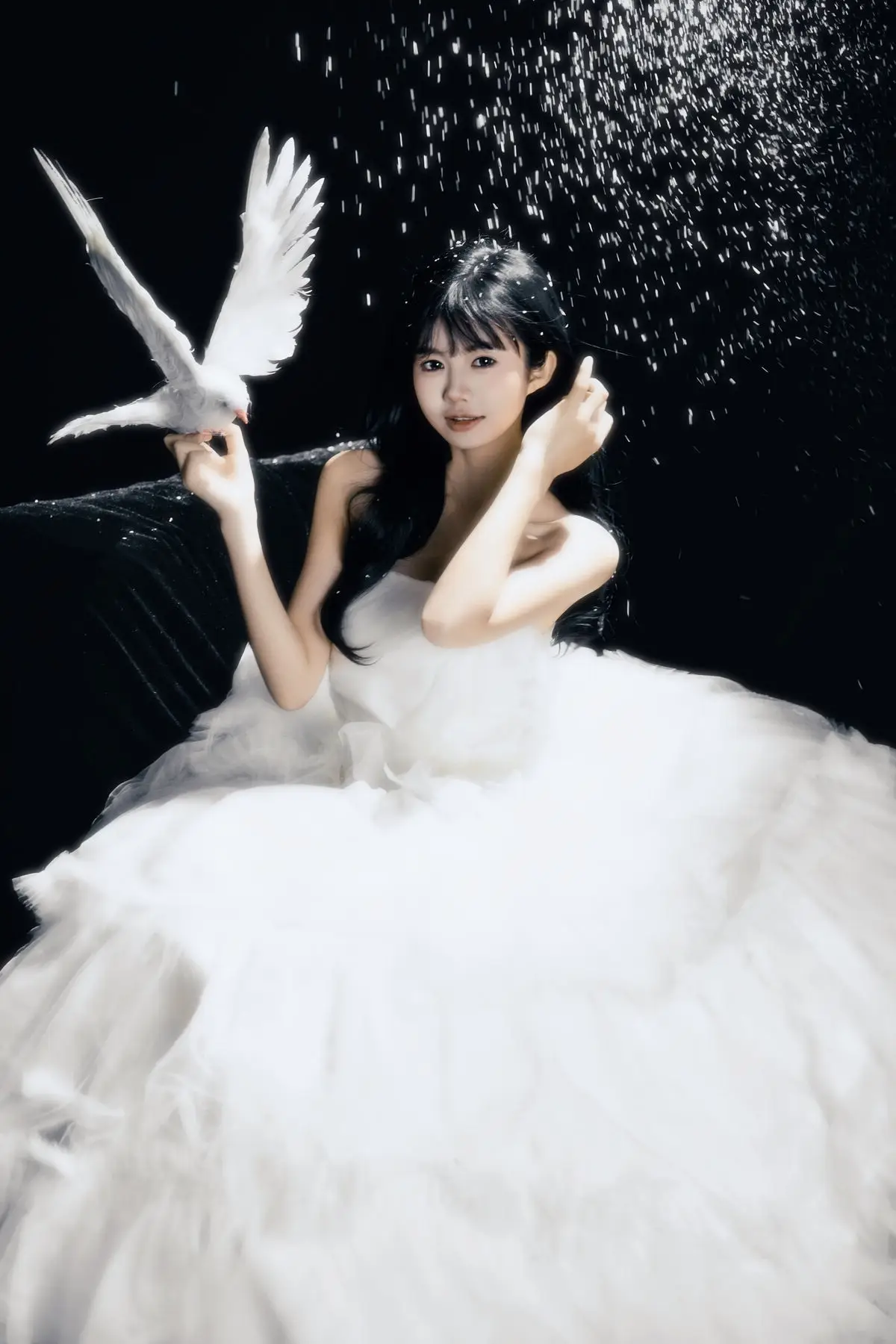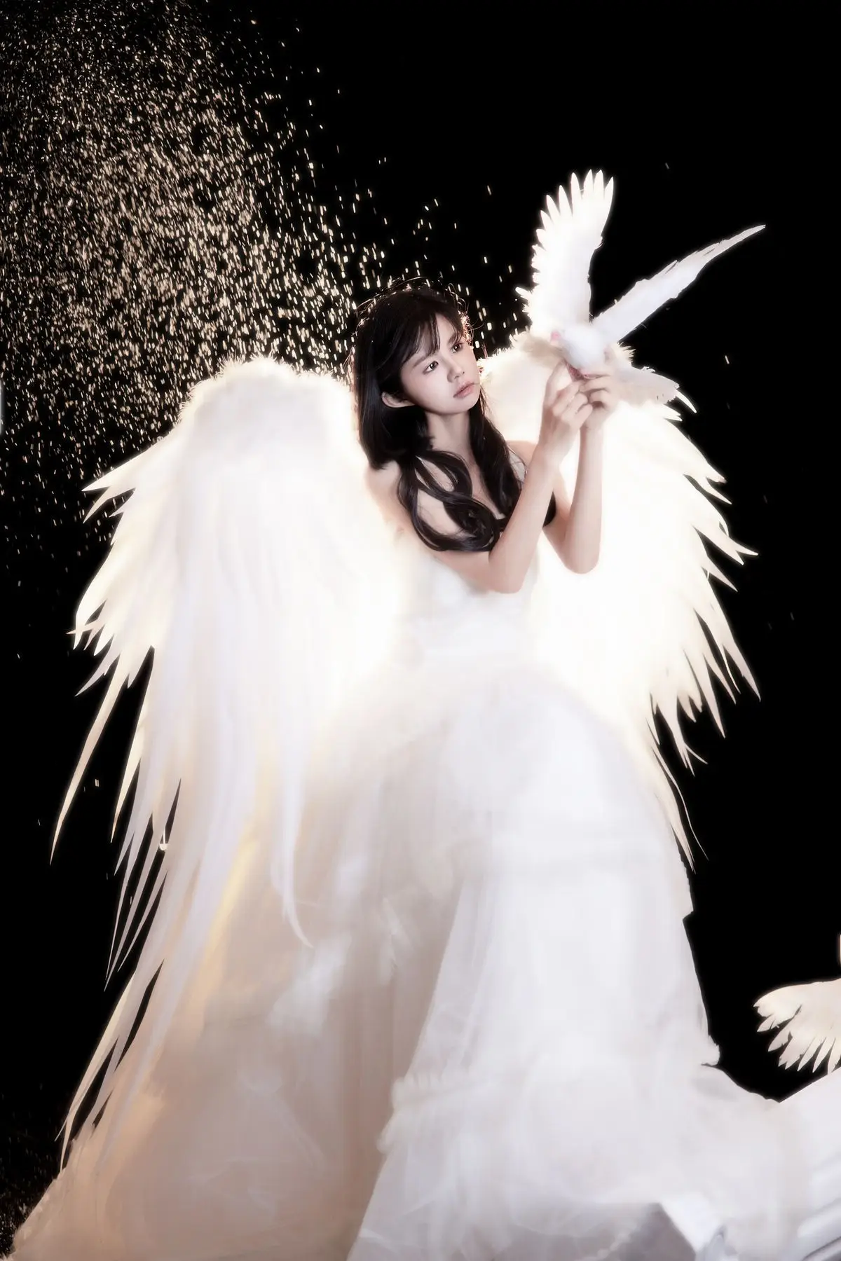 This exquisite image captures a graceful young woman in a flowing white gown, embodying pure and ethereal beauty. She delicately cradles a pristine white dove, a timeless symbol of peace and purity, creating a deeply emotional and meaningful moment. With her dark hair and gentle gaze, the woman appears as an angel of peace amidst an enchanting, dreamlike setting, where tiny glittering particles cascade like stardust. The overall composition evokes a sense of romantic wonder, drawing viewers into a world of innocence and timeless elegance. This captivating artwork is a highlight from the YiTuYu Vol.8612 OO collection, celebrating serene beauty.#WhiteGownAngel #DoveOfPeace #EtherealBeauty #YiTuYu #Art #Model