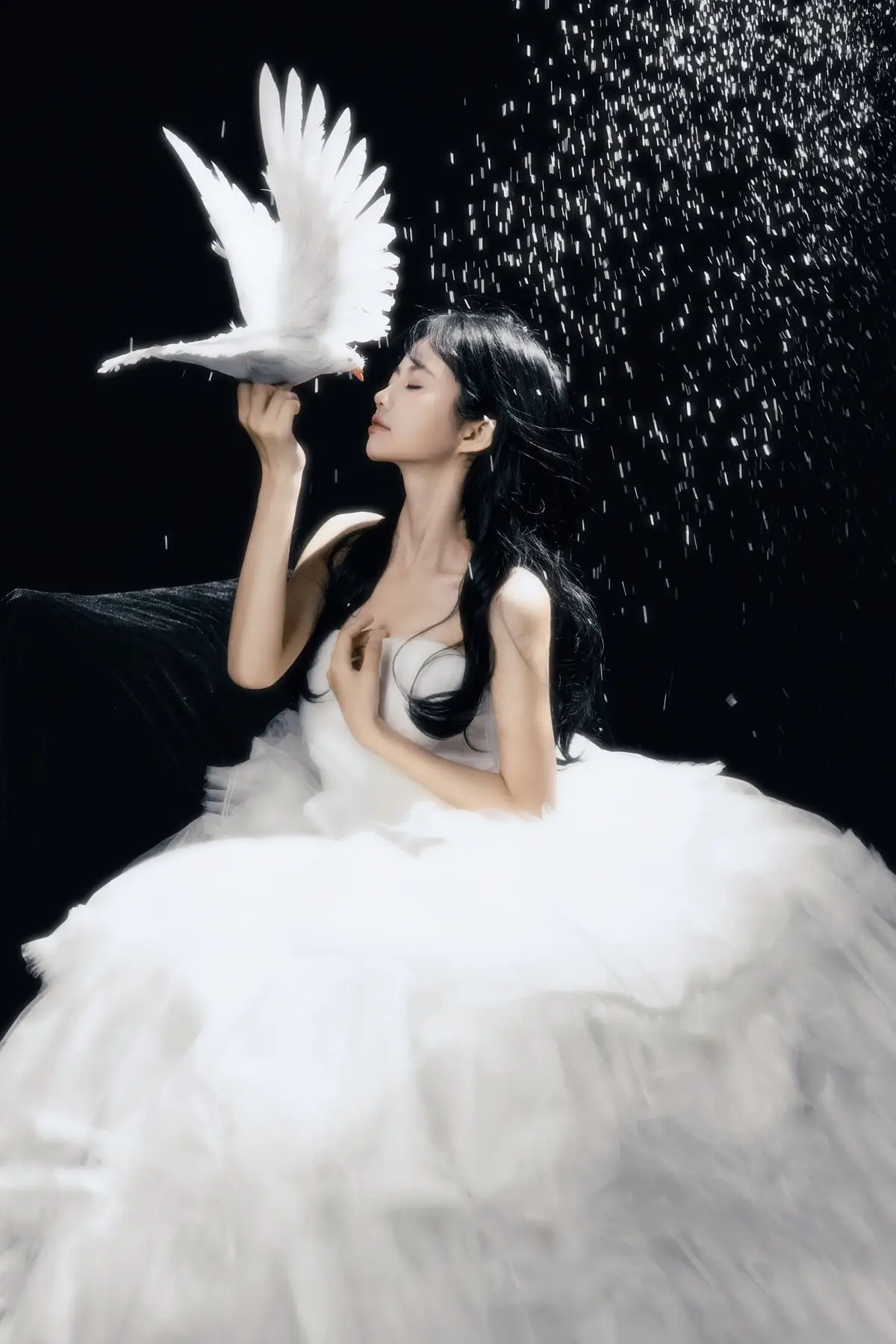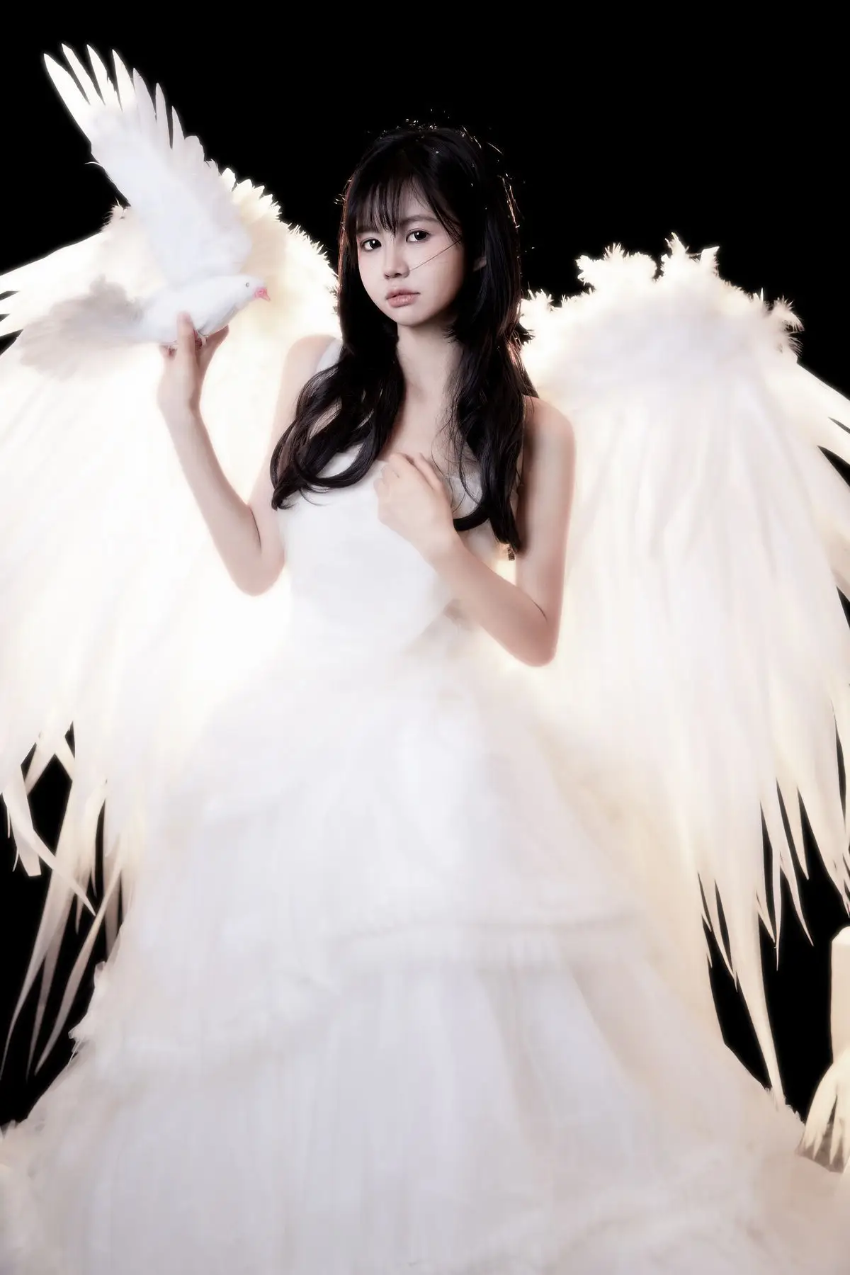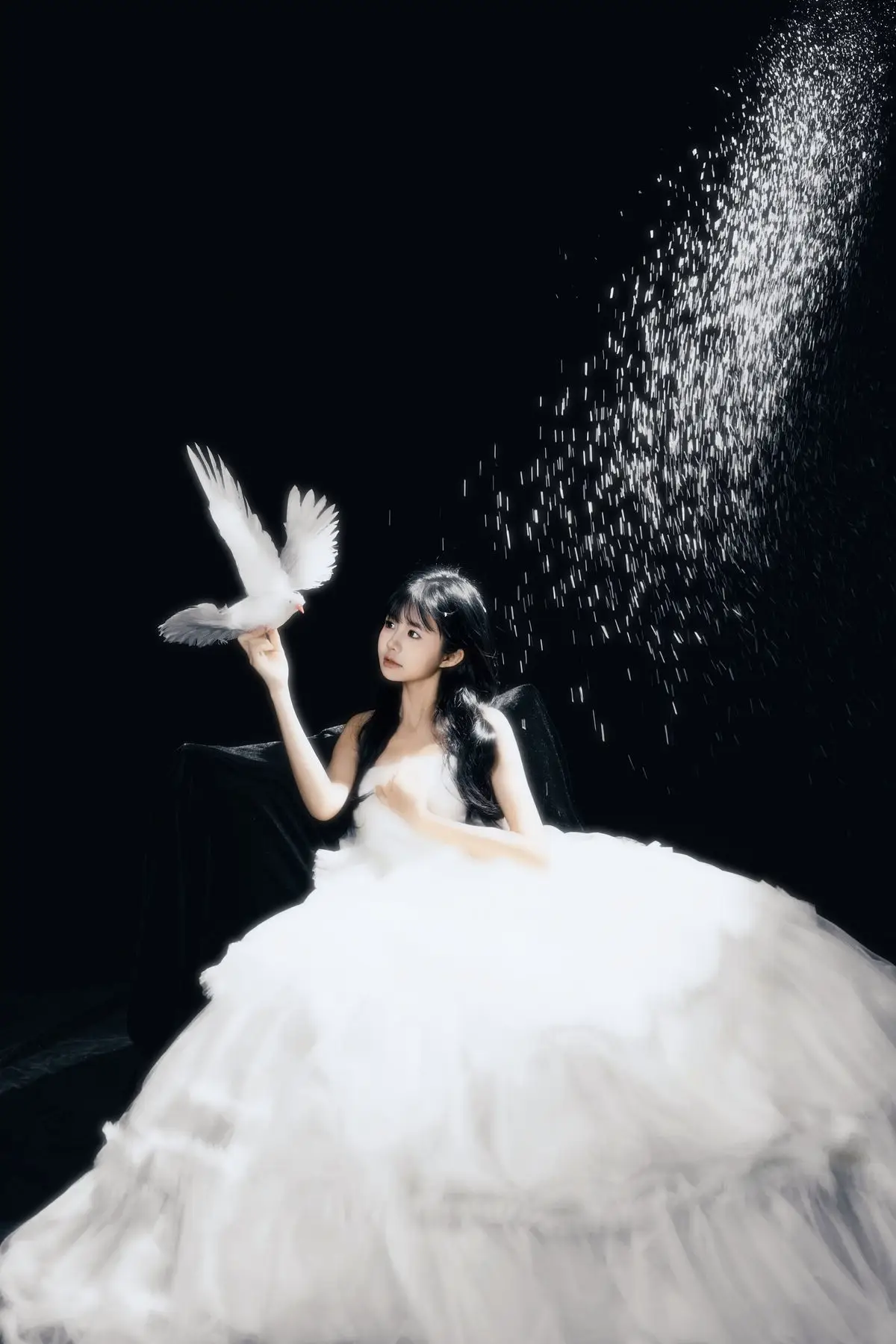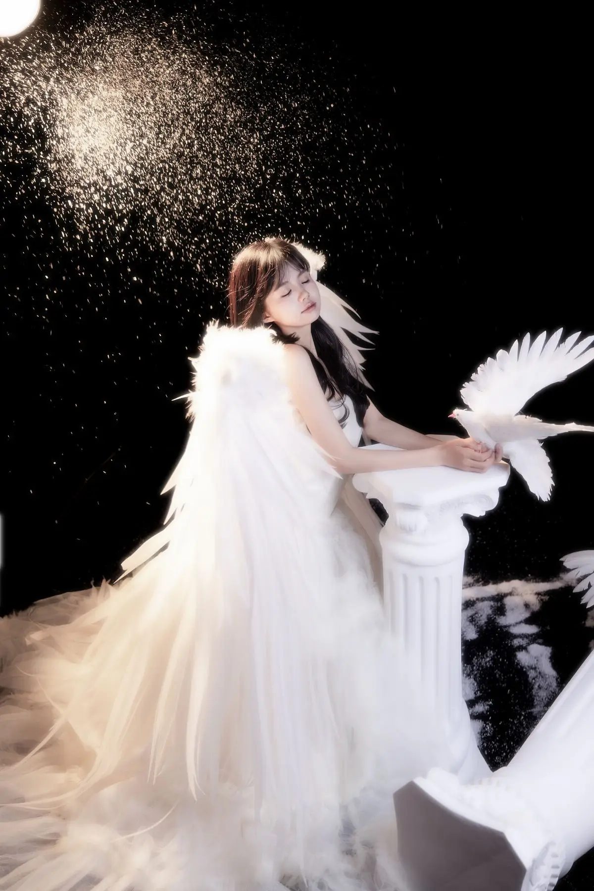 This exquisite image captures a graceful young woman in a flowing white gown, embodying pure and ethereal beauty. She delicately cradles a pristine white dove, a timeless symbol of peace and purity, creating a deeply emotional and meaningful moment. With her dark hair and gentle gaze, the woman appears as an angel of peace amidst an enchanting, dreamlike setting, where tiny glittering particles cascade like stardust. The overall composition evokes a sense of romantic wonder, drawing viewers into a world of innocence and timeless elegance. This captivating artwork is a highlight from the YiTuYu Vol.8612 OO collection, celebrating serene beauty.#WhiteGownAngel #DoveOfPeace #EtherealBeauty #YiTuYu #Art #Model