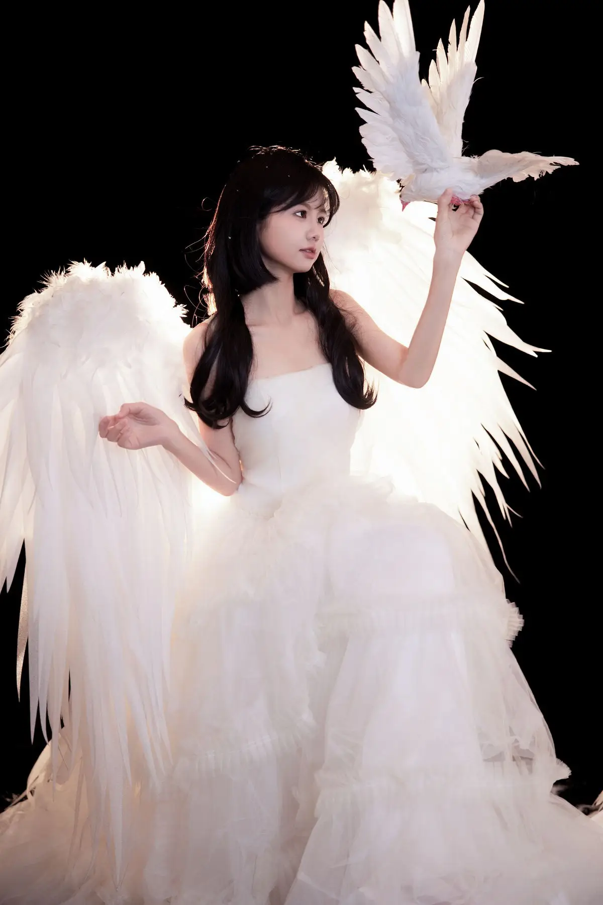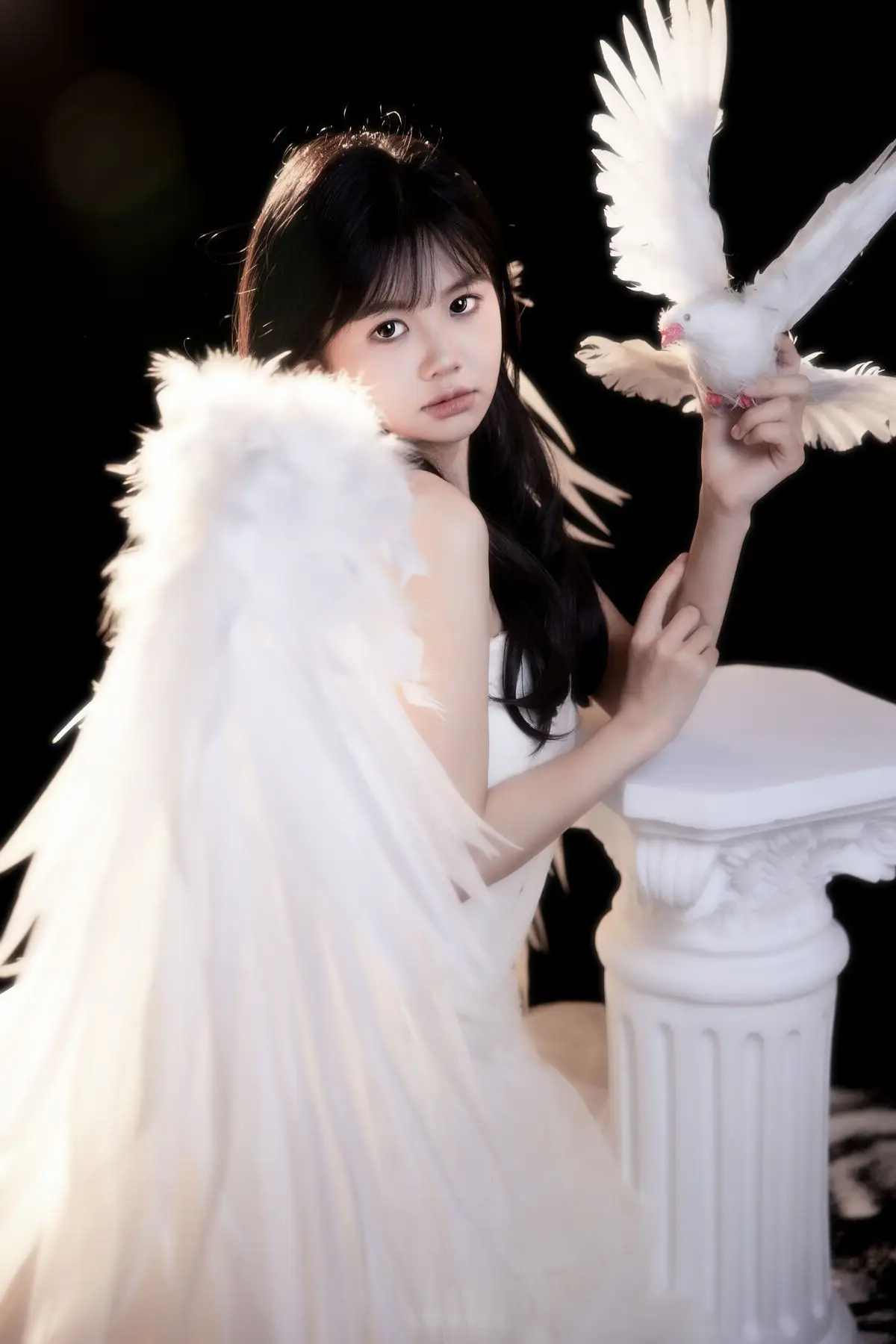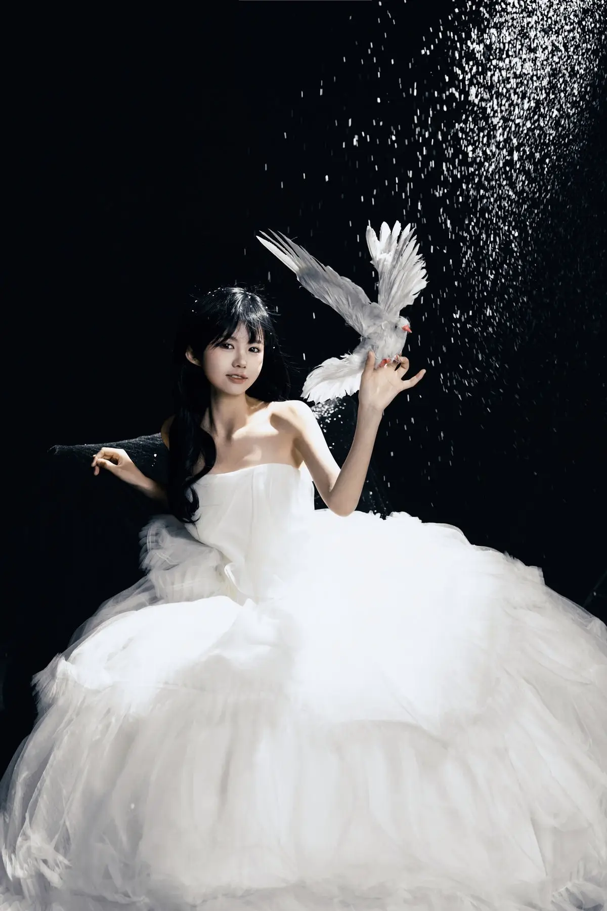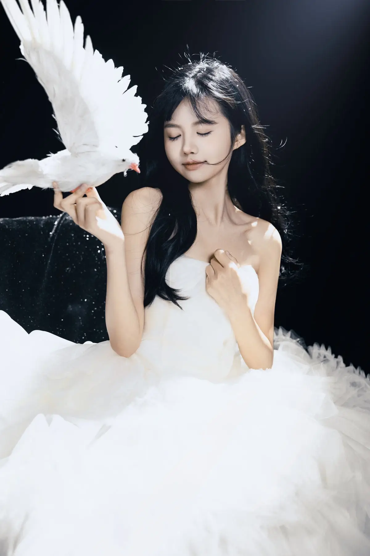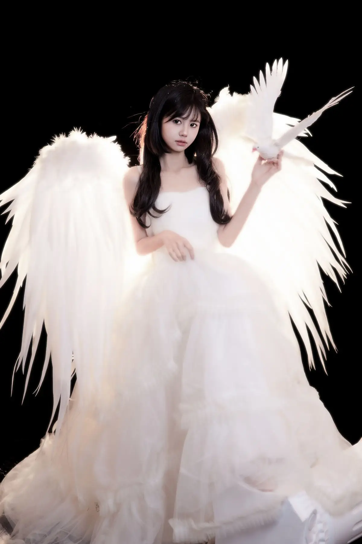 This exquisite image captures a graceful young woman in a flowing white gown, embodying pure and ethereal beauty. She delicately cradles a pristine white dove, a timeless symbol of peace and purity, creating a deeply emotional and meaningful moment. With her dark hair and gentle gaze, the woman appears as an angel of peace amidst an enchanting, dreamlike setting, where tiny glittering particles cascade like stardust. The overall composition evokes a sense of romantic wonder, drawing viewers into a world of innocence and timeless elegance. This captivating artwork is a highlight from the YiTuYu Vol.8612 OO collection, celebrating serene beauty.#WhiteGownAngel #DoveOfPeace #EtherealBeauty #YiTuYu #Art #Model