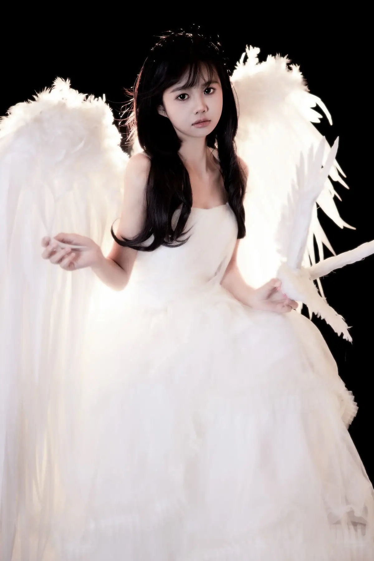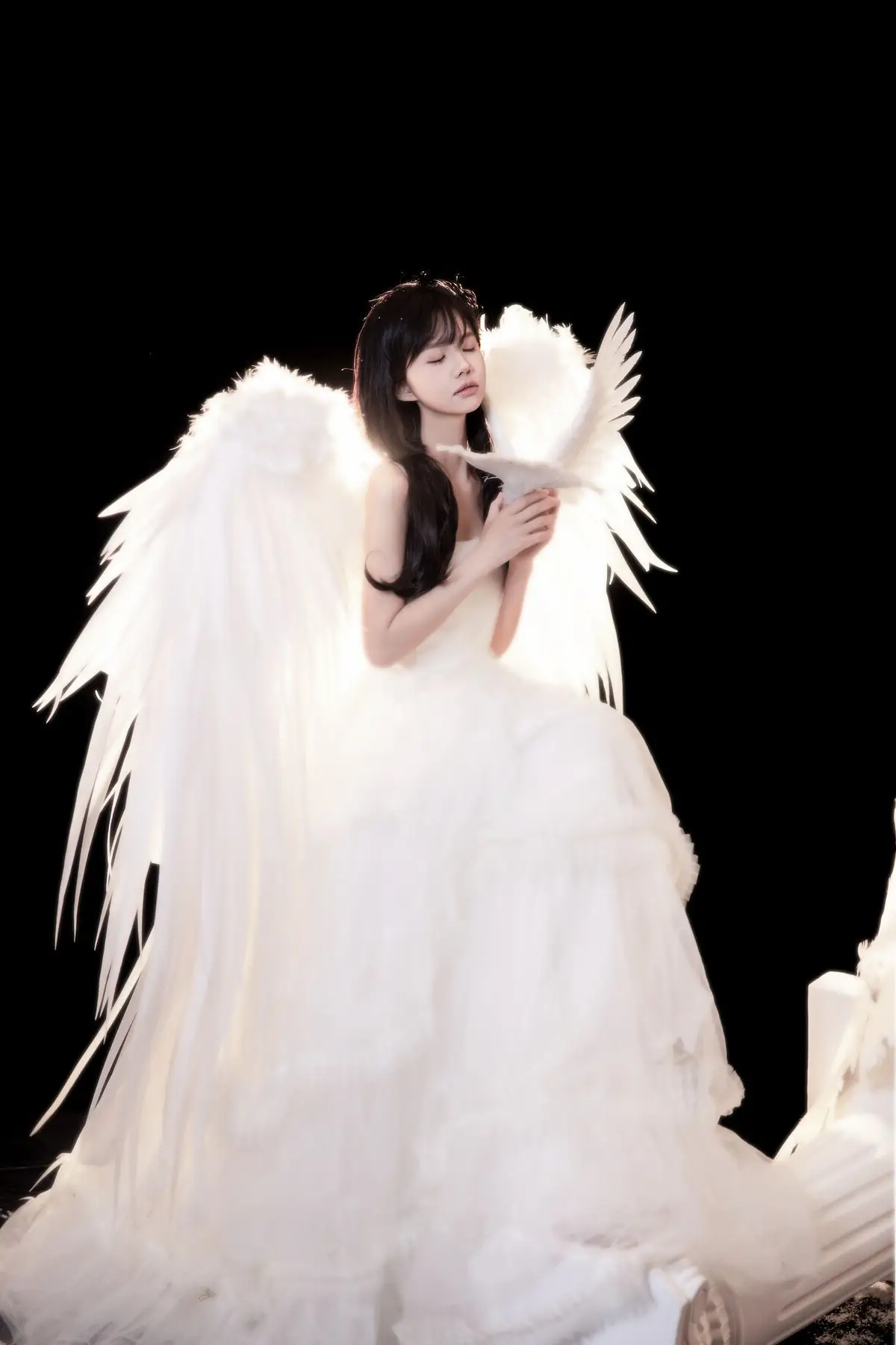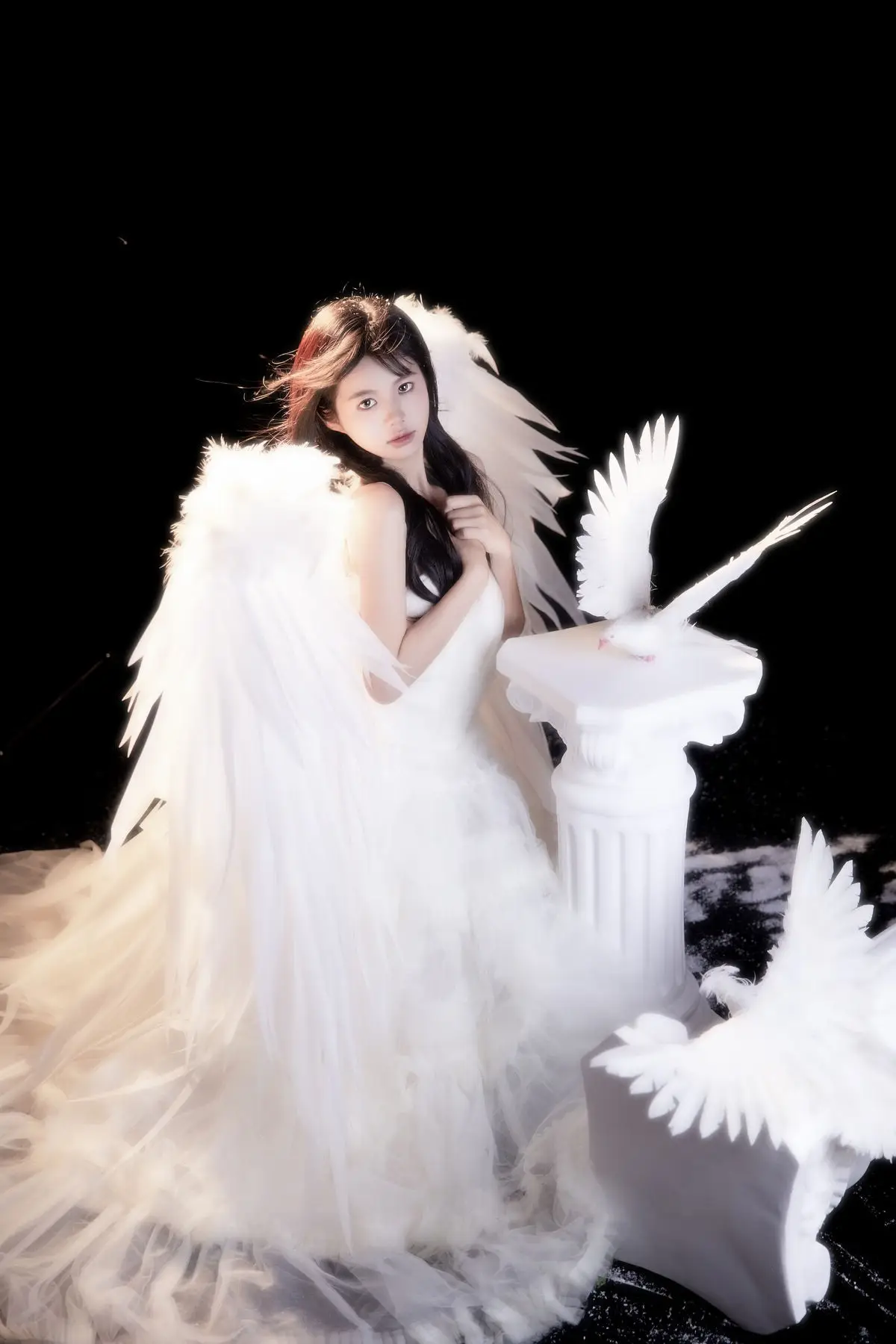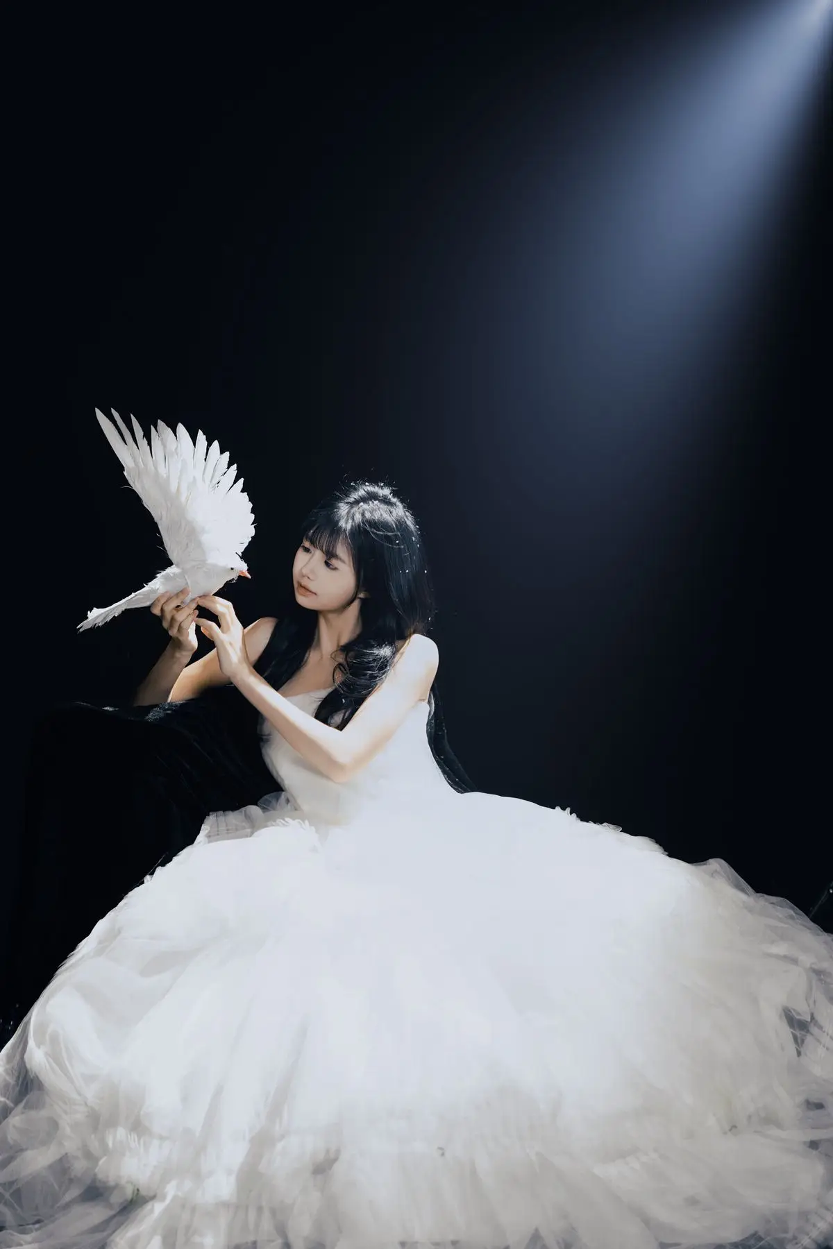 This exquisite image captures a graceful young woman in a flowing white gown, embodying pure and ethereal beauty. She delicately cradles a pristine white dove, a timeless symbol of peace and purity, creating a deeply emotional and meaningful moment. With her dark hair and gentle gaze, the woman appears as an angel of peace amidst an enchanting, dreamlike setting, where tiny glittering particles cascade like stardust. The overall composition evokes a sense of romantic wonder, drawing viewers into a world of innocence and timeless elegance. This captivating artwork is a highlight from the YiTuYu Vol.8612 OO collection, celebrating serene beauty.#WhiteGownAngel #DoveOfPeace #EtherealBeauty #YiTuYu #Art #Model