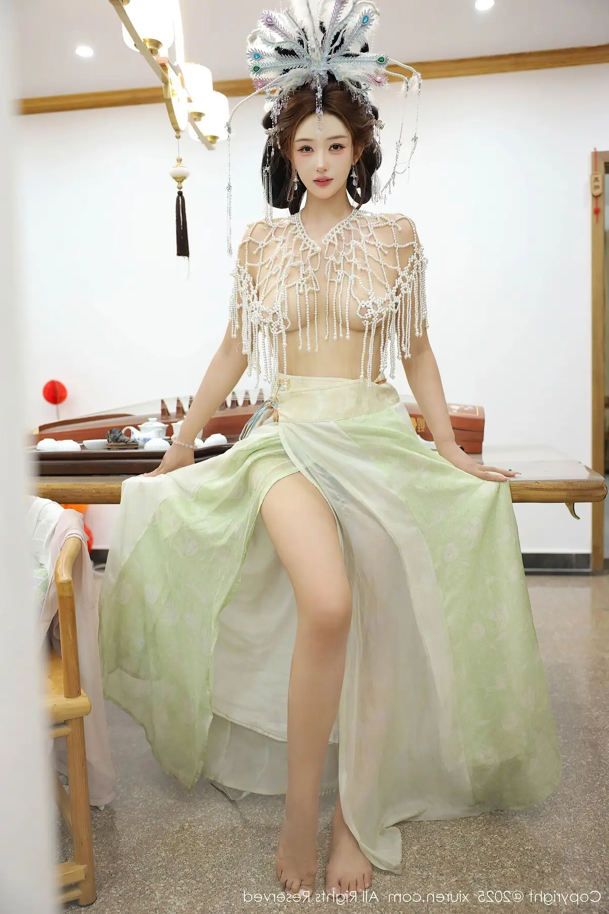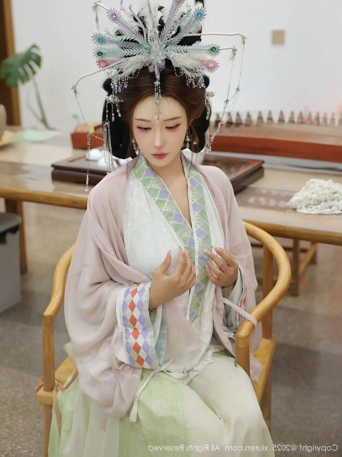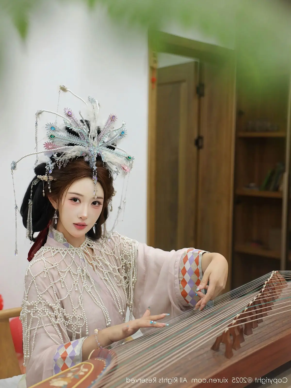 In the XiuRen No.10736 collection, model Li Shuang Er captivates with an enchanting and ethereal presence. She is adorned in exquisite traditional attire, featuring an intricate and graceful headpiece that highlights the classic beauty of an East Asian woman. Her posture while seated beside the Guzheng Chinese zither reveals deep concentration and passion for traditional music. Each finger delicately glides across the strings, weaving melodious tunes that transport viewers into a poetic cultural realm. Li Shuang Er not only showcases her beauty but also conveys the spirit of an artist, a perfect blend of physical elegance and profound artistic soul. This collection is a must-see for admirers of classical beauty and traditional music.#LiShuangEr #Guzheng #TraditionalBeauty #Hanfu #ChineseArt #XiuRen #Model