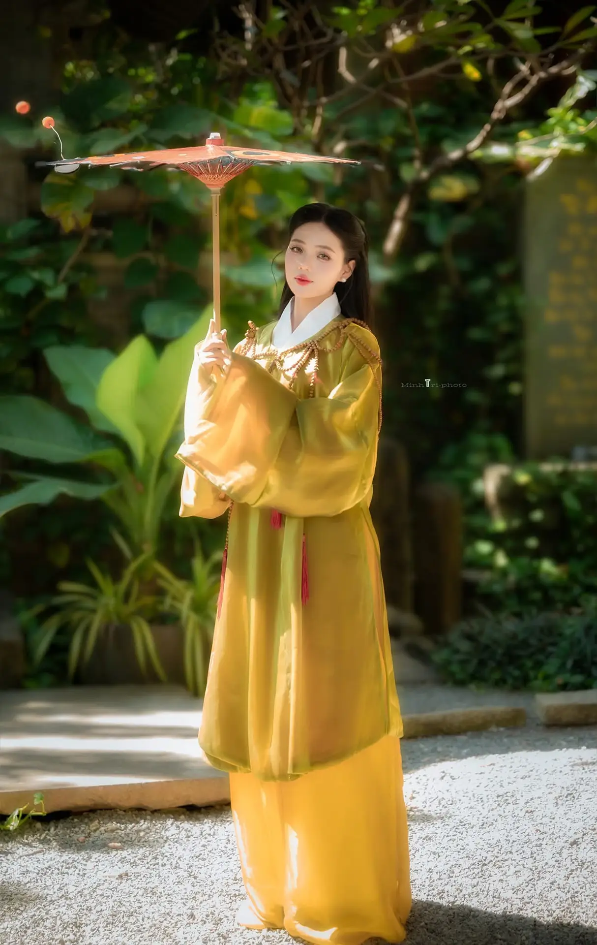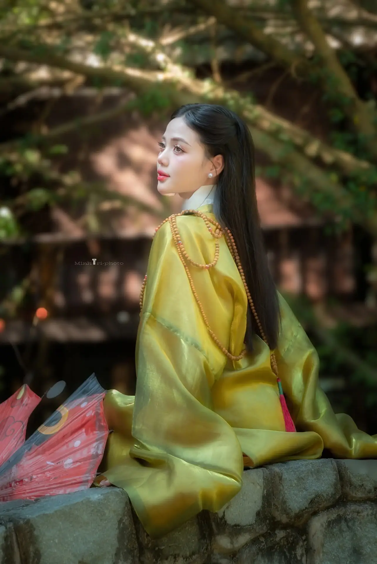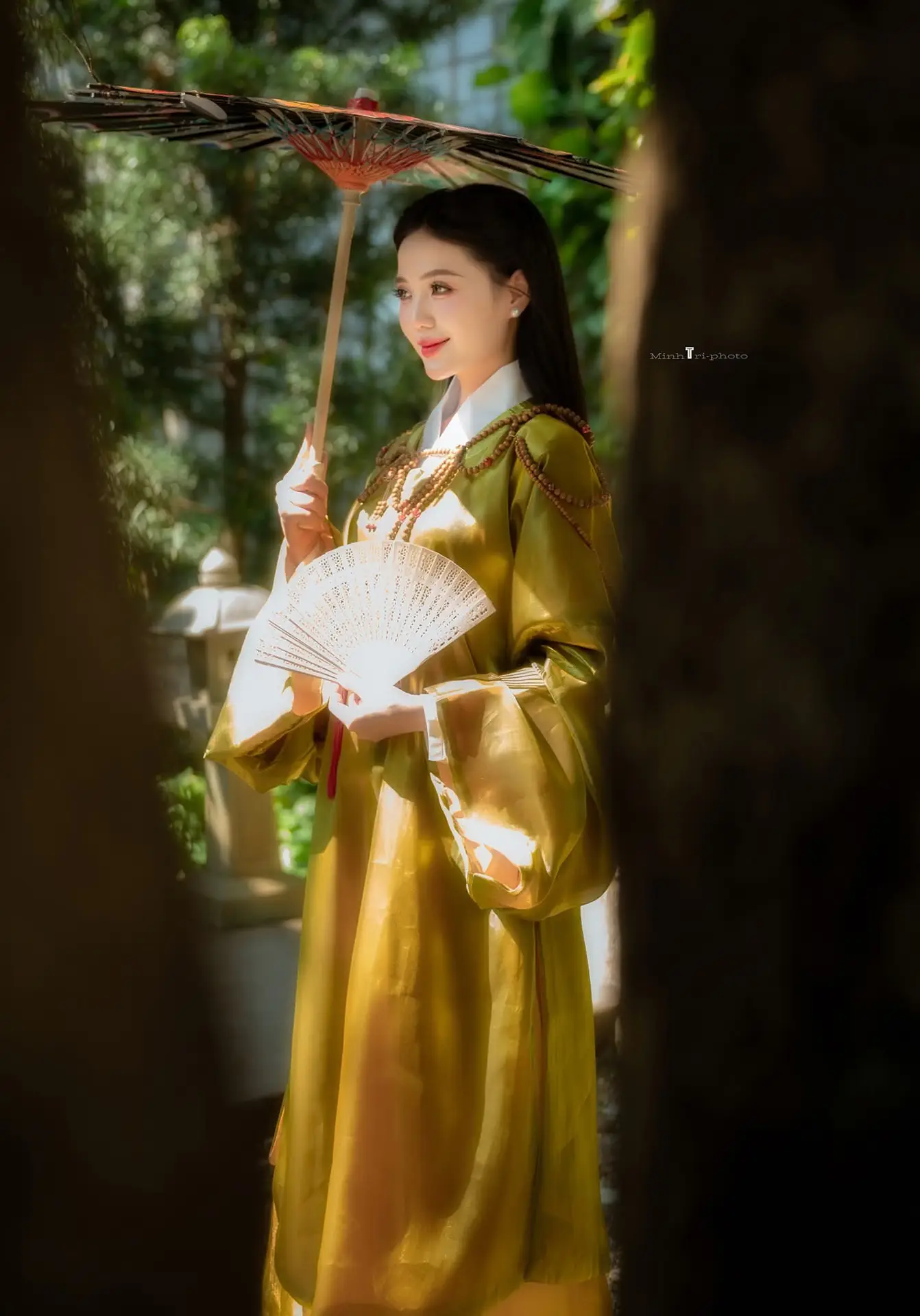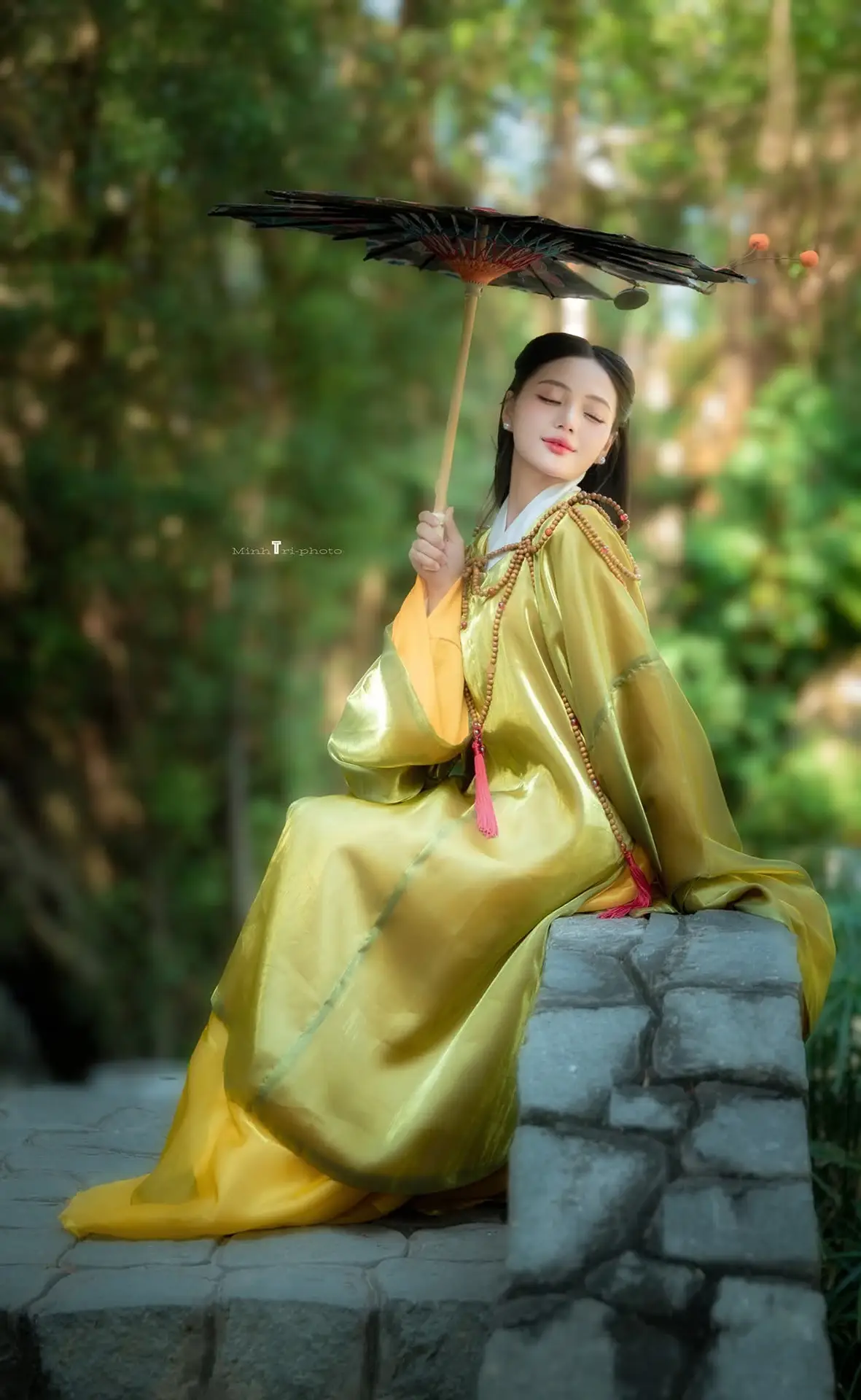This captivating image portrays a young woman with mesmerizing beauty adorned in a shimmering golden traditional costume exuding elegance and nobility of East Asia. Her gaze directed into the distance holds a profound pensive quality hinting at a mysterious untold story. The softly blurred natural background further enhances her ethereal charm transporting viewers into a poetic nostalgic realm. More than just a photograph this is an artwork where the graceful and enigmatic beauty of a woman is delicately and emotionally expressed captivating hearts. A tranquil and alluring moment.