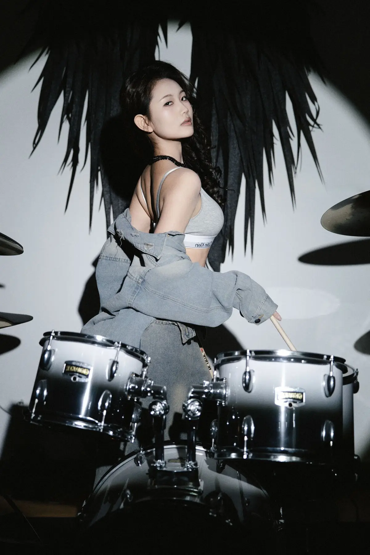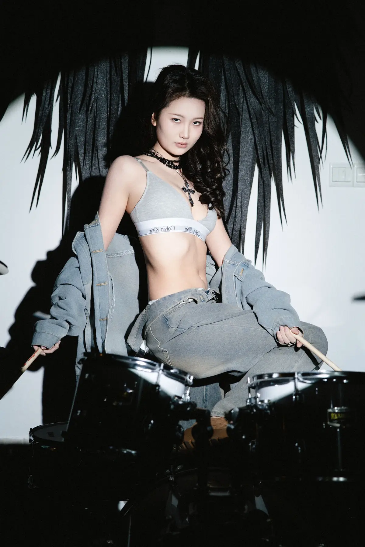 In this Art Language Vol8714 series Ni Ni embodies the essence of a powerful and charismatic rock girl Her toned physique is highlighted by a stylish Calvin Klein bralette paired with an unbuttoned denim jacket and low-slung jeans exuding an effortlessly cool vibe Holding a drumstick she projects confidence and a fierce spirit ready to ignite Ni Ni’s captivating gaze and unique outfit choices showcase not just her physical beauty but also a sense of freedom and rebellious charm The artistic backdrop featuring dark wing-like structures further amplifies her distinctive and alluring presence This collection is a striking fusion of fashion and artistic expression