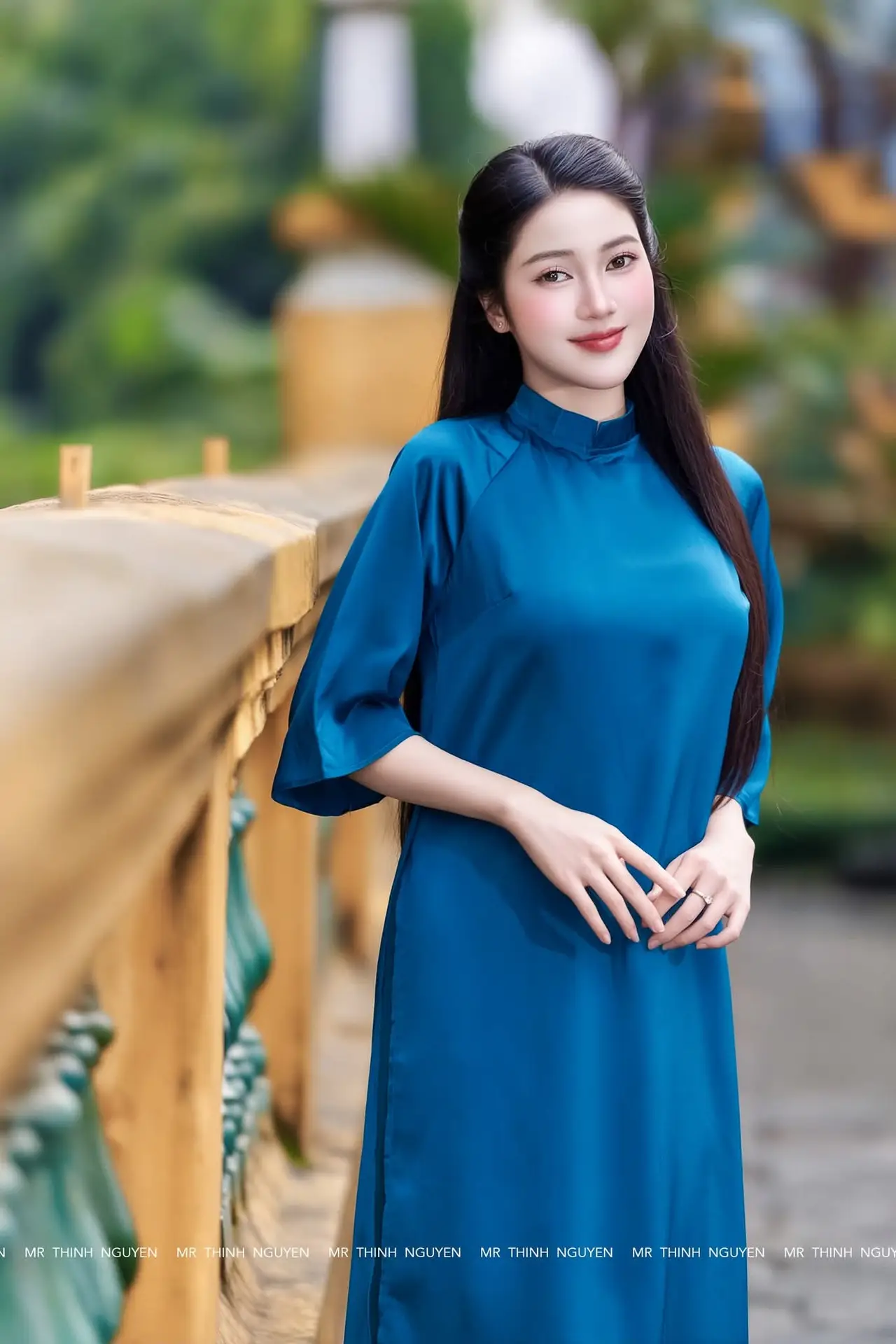 This enchanting photograph captures the exquisite beauty of a Vietnamese woman gracefully adorned in a stunning teal blue Ao Dai. Her serene smile and captivating eyes convey a sense of calm elegance drawing viewers in. The traditional Vietnamese dress though subtly modernized perfectly accentuates her slender figure and radiant complexion. The vibrant blue hue of the Ao Dai not only highlights her natural charm but also evokes a feeling of freshness and purity. Standing confidently on a rustic wooden bridge amidst a picturesque natural setting she embodies the timeless allure of Vietnamese culture a harmonious blend of classic grace and contemporary style.