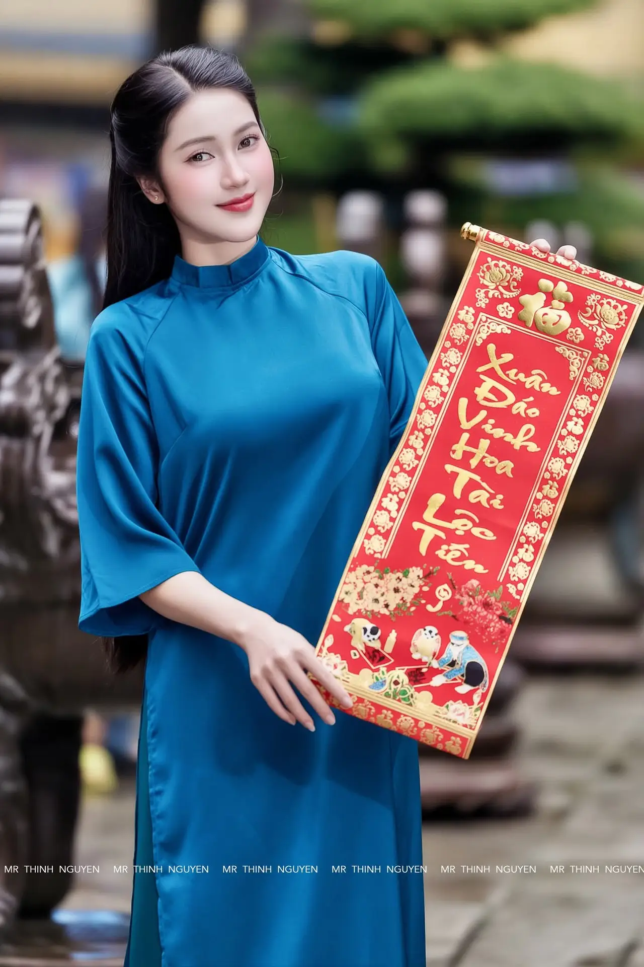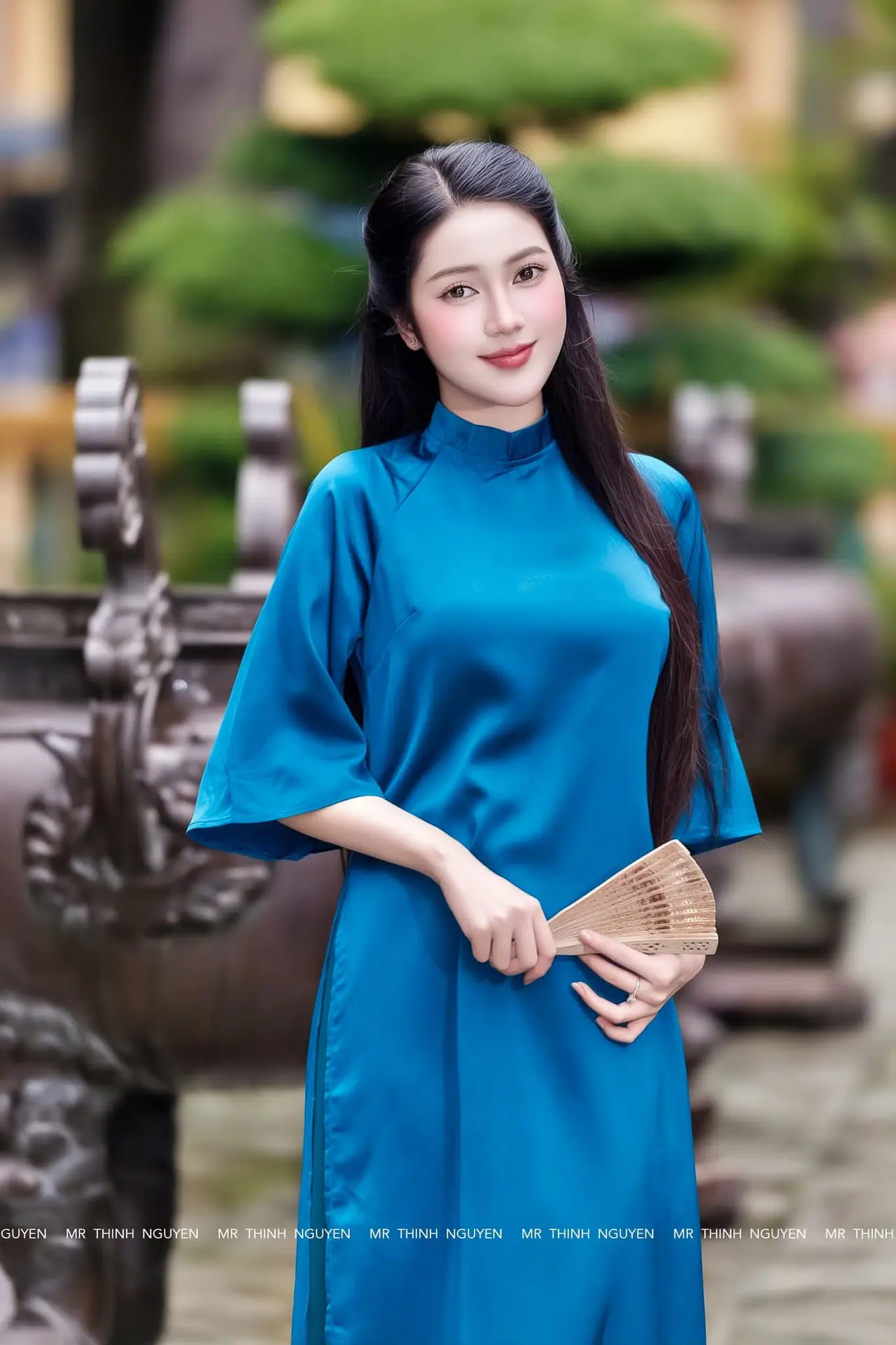 Vietnamese Ao Dai Charm: Elegant Lady in Teal Blue Dress, A Captivating Vision of Grace