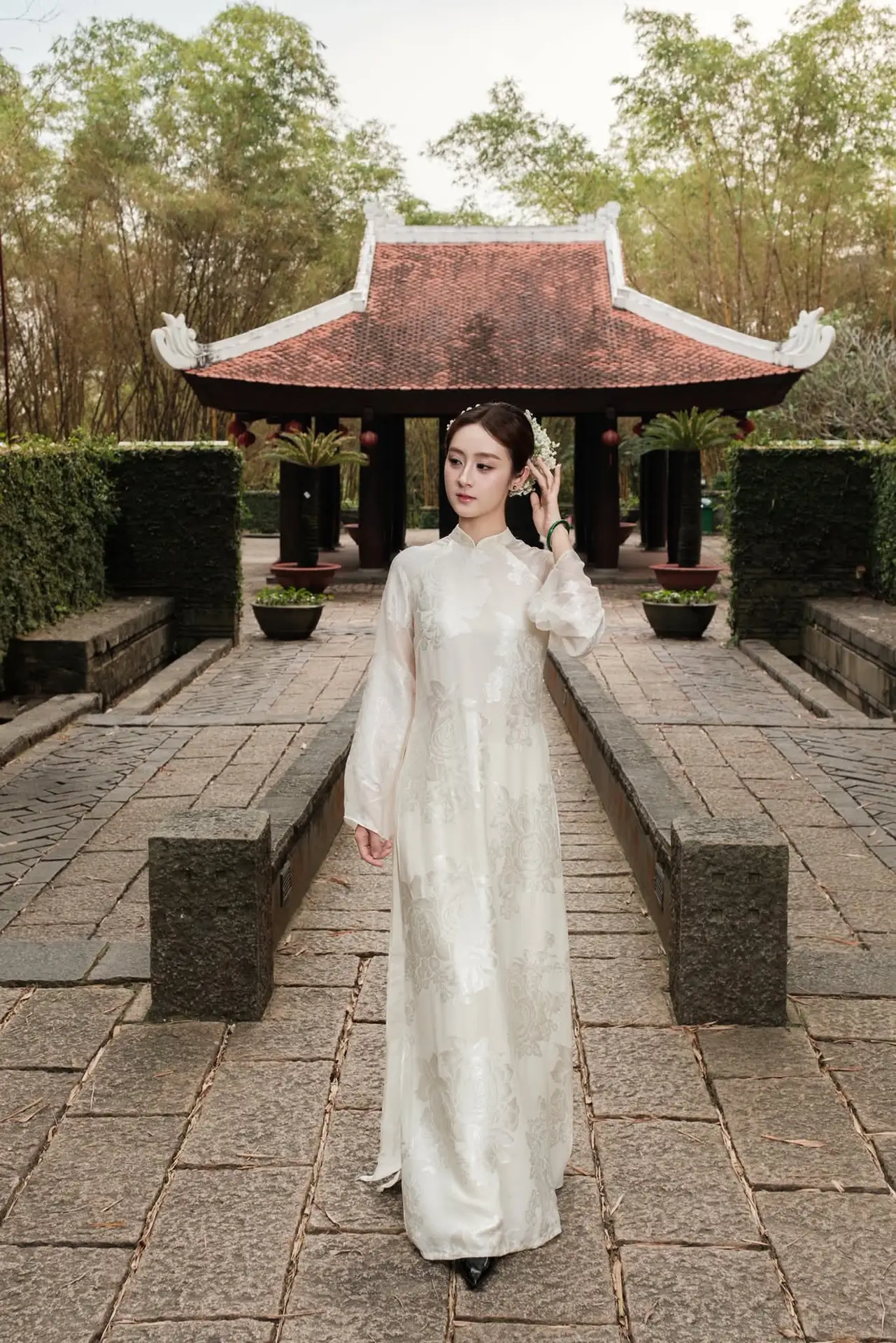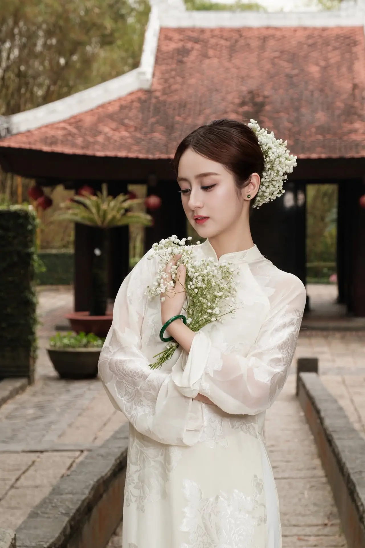 This beautiful photograph captures a Vietnamese girl with a captivating gentle and elegant beauty. She wears a pure white ao dai, a timeless symbol of traditional beauty and grace. Her dark hair is neatly tied up, adorned with tiny white flowers, creating a delicate and innocent accent. Her gaze is distant, exuding tranquility and poetic charm, like a muse wandering amidst the lush green natural surroundings. The ao dai not only accentuates her graceful figure but also profoundly reflects the essence of Vietnamese culture. This is an emotional moment, celebrating Asian beauty, a harmonious blend of classic and modern aesthetics, sure to enchant every viewer.