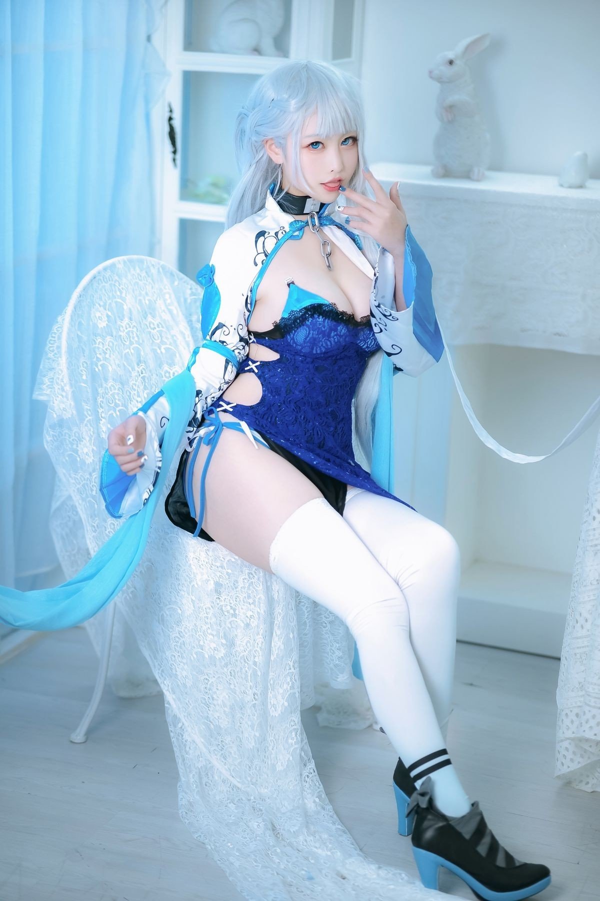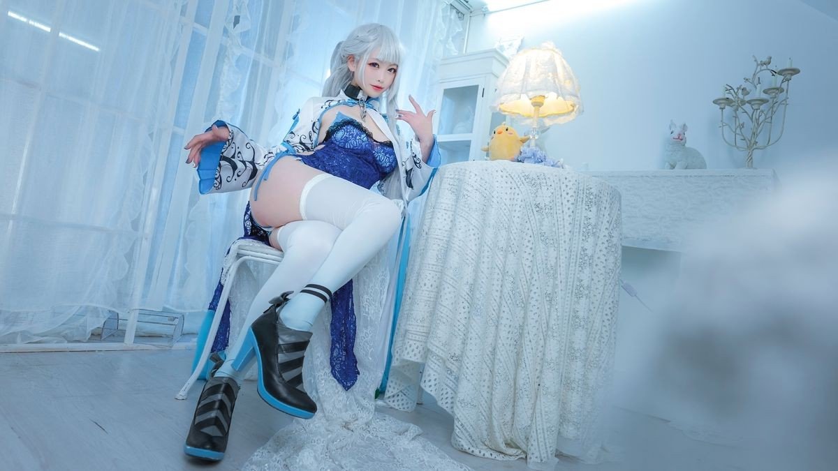 Coser@樱岛嗷一 delivers an outstanding portrayal of Belfast from Azur Lane. With her shimmering silver hair and magnificent royal blue outfit complemented by a pristine white cape she perfectly embodies the character's elegant and regal beauty. Every detail from the blue bouquet held in her hand to her gentle gaze is exquisitely rendered highlighting Belfast's grace and allure. This photograph is not merely an impressive cosplay piece but a harmonious blend of physical beauty and character spirit conveying a profound artistic emotion. It is undoubtedly a captivating image that will enchant fans.