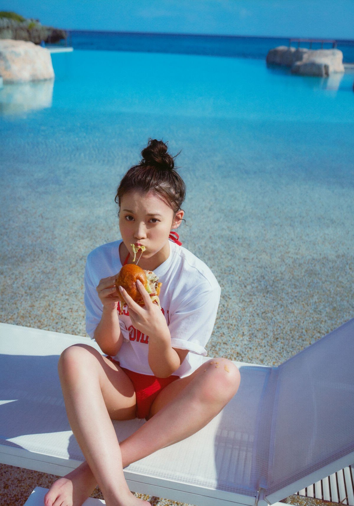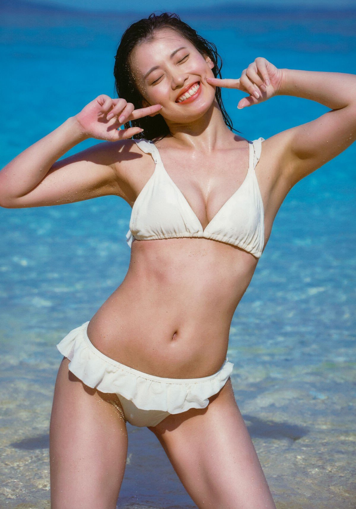 This stunning image captures a moment of pure joy and natural beauty from Rin Okabe 岡部麟 in her ファースト写真集 エスカルゴ Part01. With a radiant smile and closed eyes expressing playful happiness Rin Okabe exudes a pristine and vibrant charm. Her wet hair and the white towel covering her head evoke a refreshing atmosphere perhaps by the sea or a pool. This authentic portrayal highlights her comfort and freedom. Rin Okabe 岡部麟 conveys a positive emotion bringing a unique freshness and captivating allure. The photograph serves as an ideal highlight for her ファースト写真集 エスカルゴ collection.
