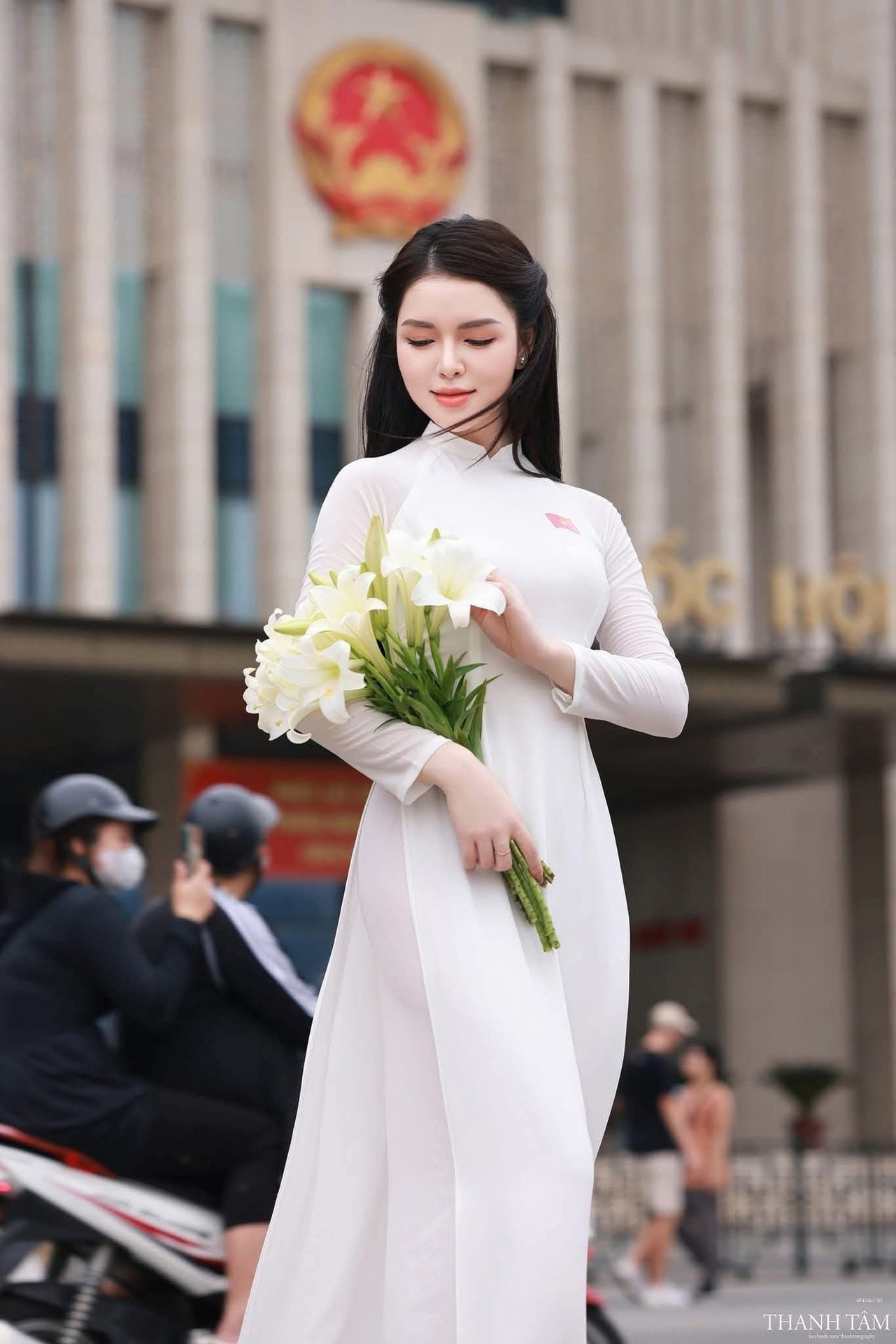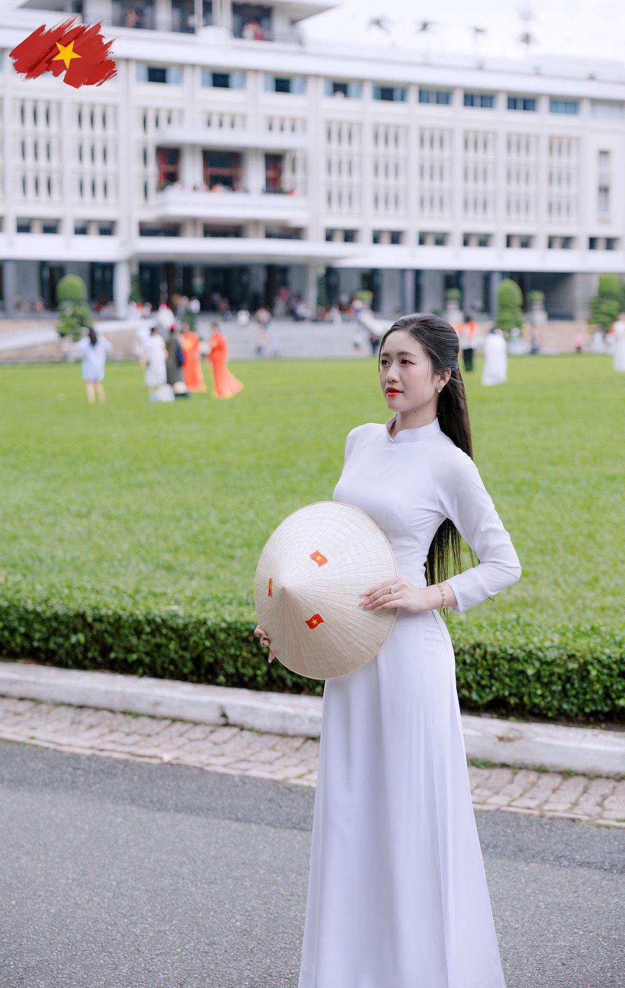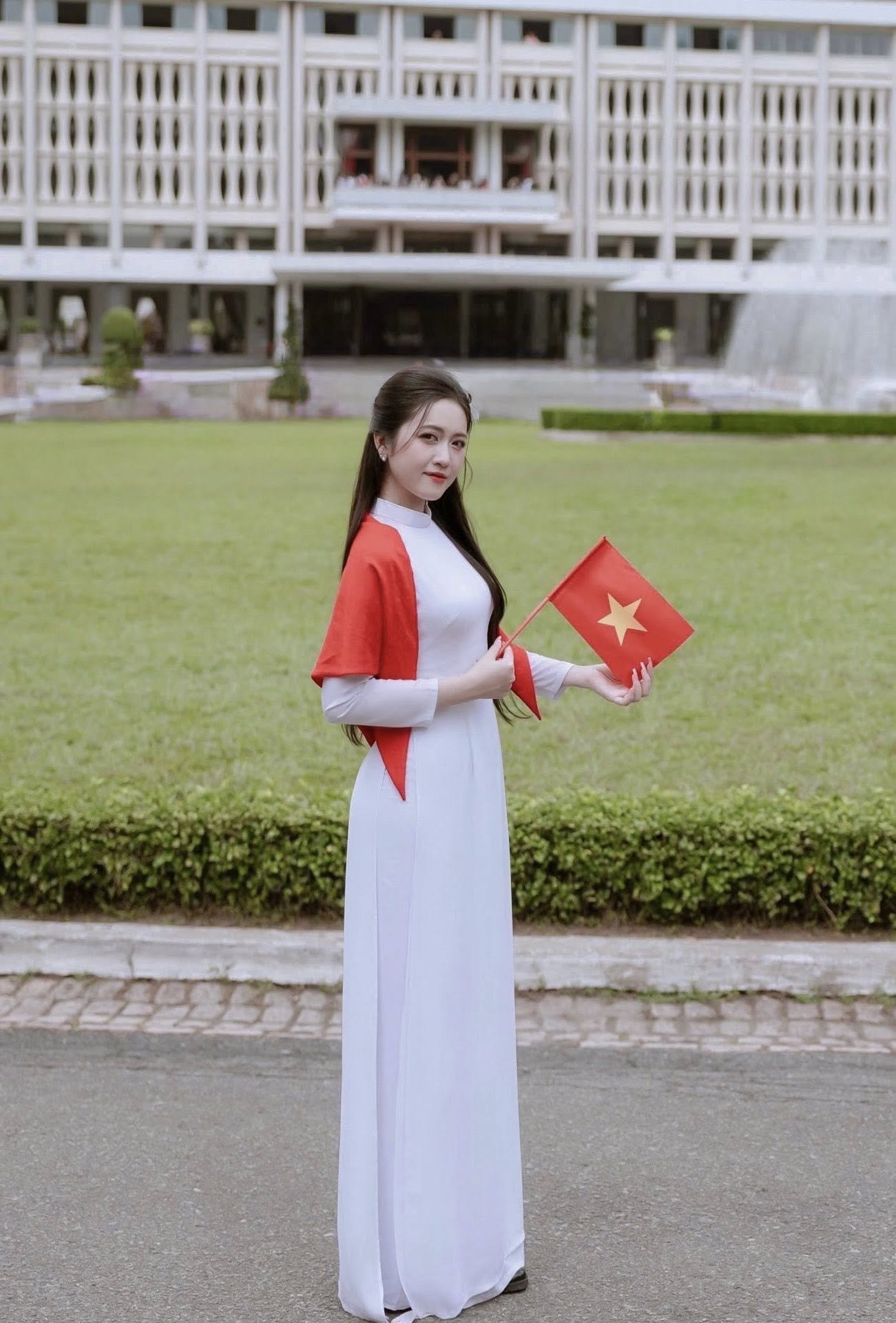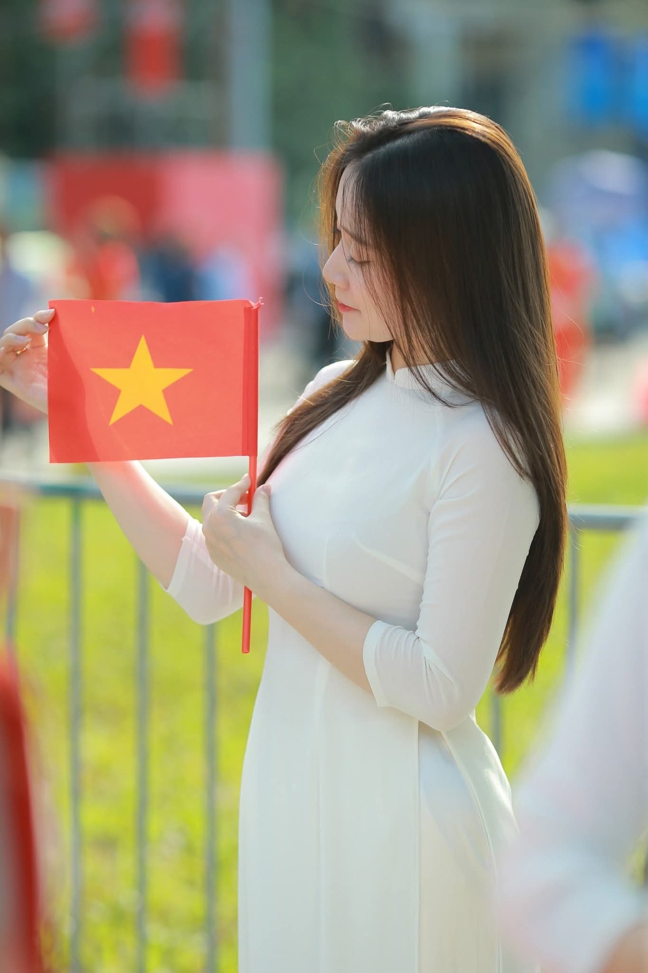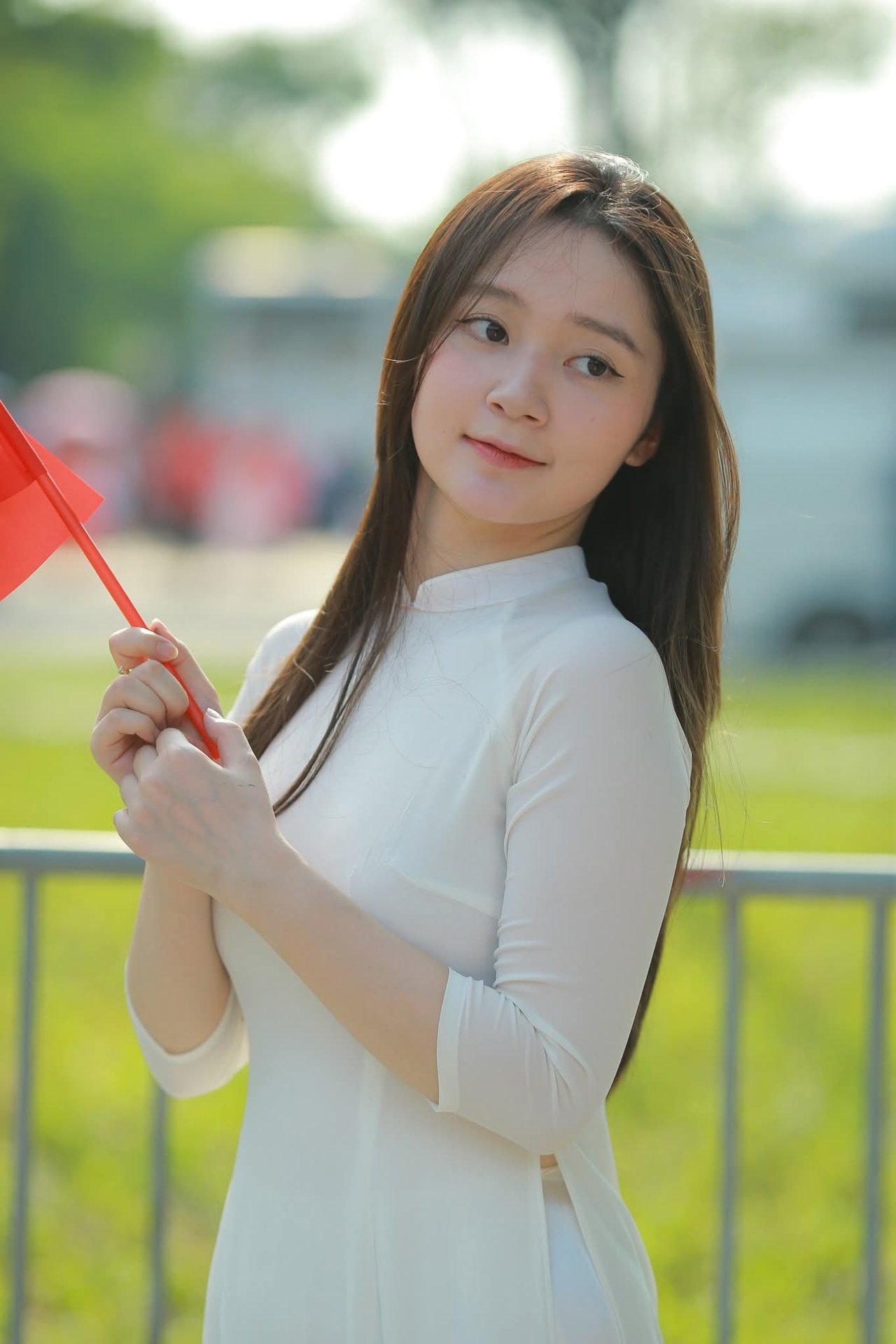 Nét đẹp dịu dàng với áo dài trắng trong không khí đại lễ của toàn dân tộc, em đẹp như mùa thu Hà Nội
