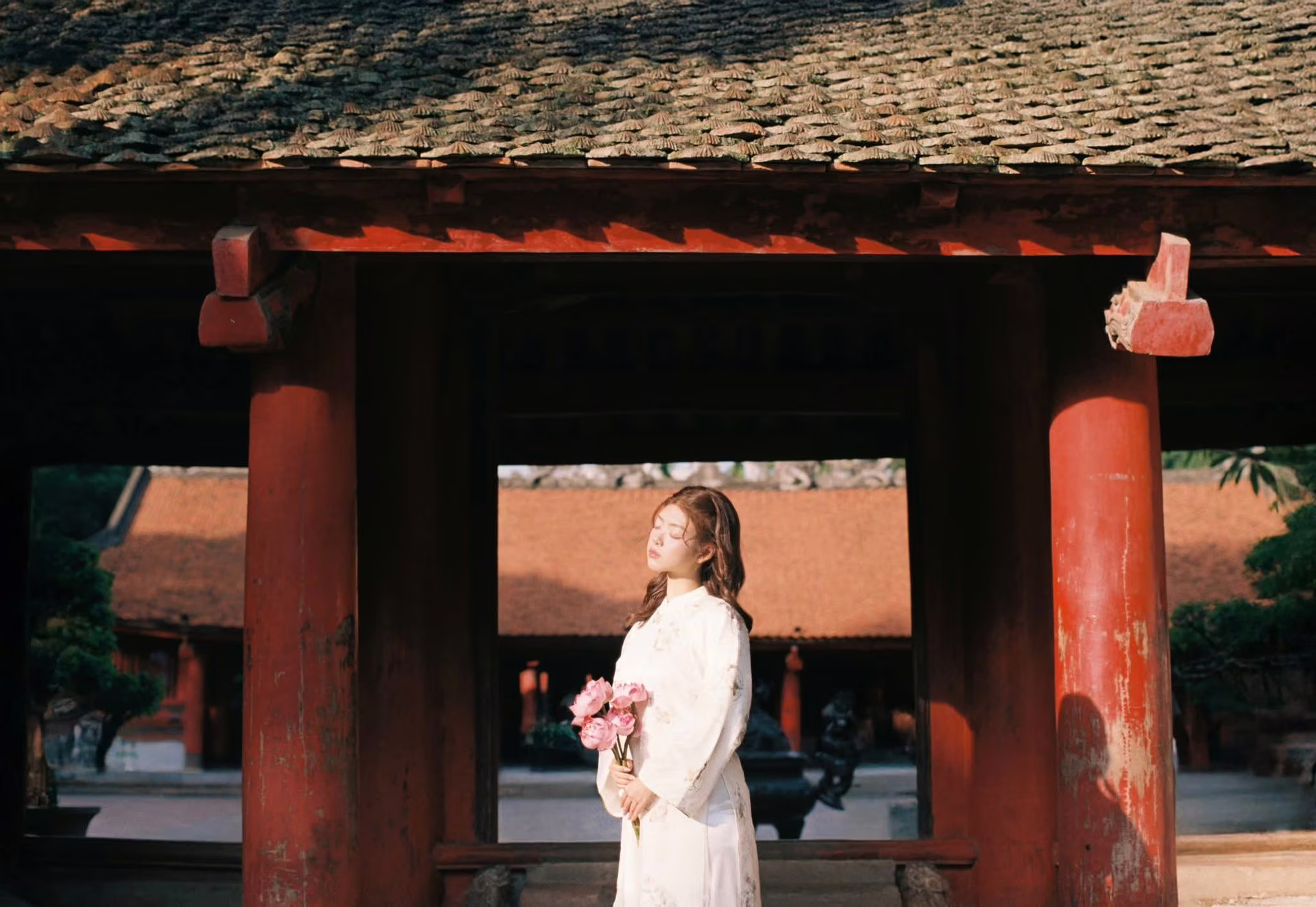 This photograph captures a beautiful moment of a young woman whose radiant smile brightens the entire frame Her natural beauty is highlighted by her long dark hair and the elegantly simple cream-colored outfit she wears Warm sunlight filtering through lush green foliage creates a vibrant and fresh atmosphere reminiscent of serene summer days The girl exudes a youthful innocence and an optimistic life-loving spirit Behind her a classic architectural structure with intricate carvings provides a harmonious and deep backdrop to the image This is a peaceful and emotional moment showcasing her grace and pure Asian charm captivating every gaze #Vietnamese #pretty #charmVGU No.138: Discover Elegant Vietnamese Beauty: Modern Ao Yem & Oriental Grace