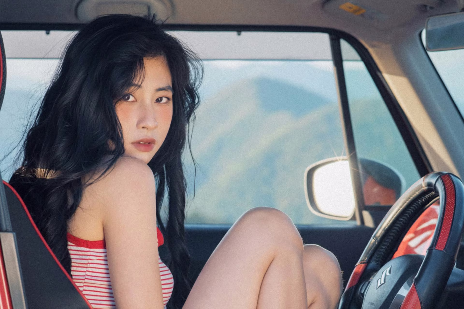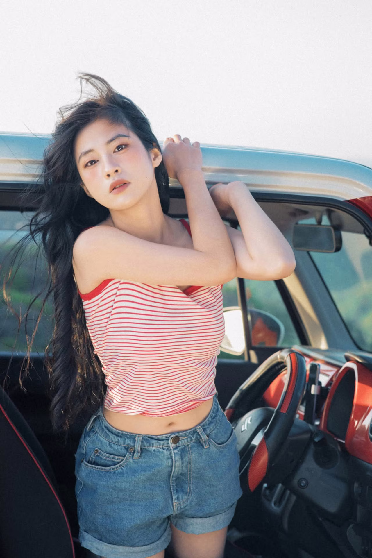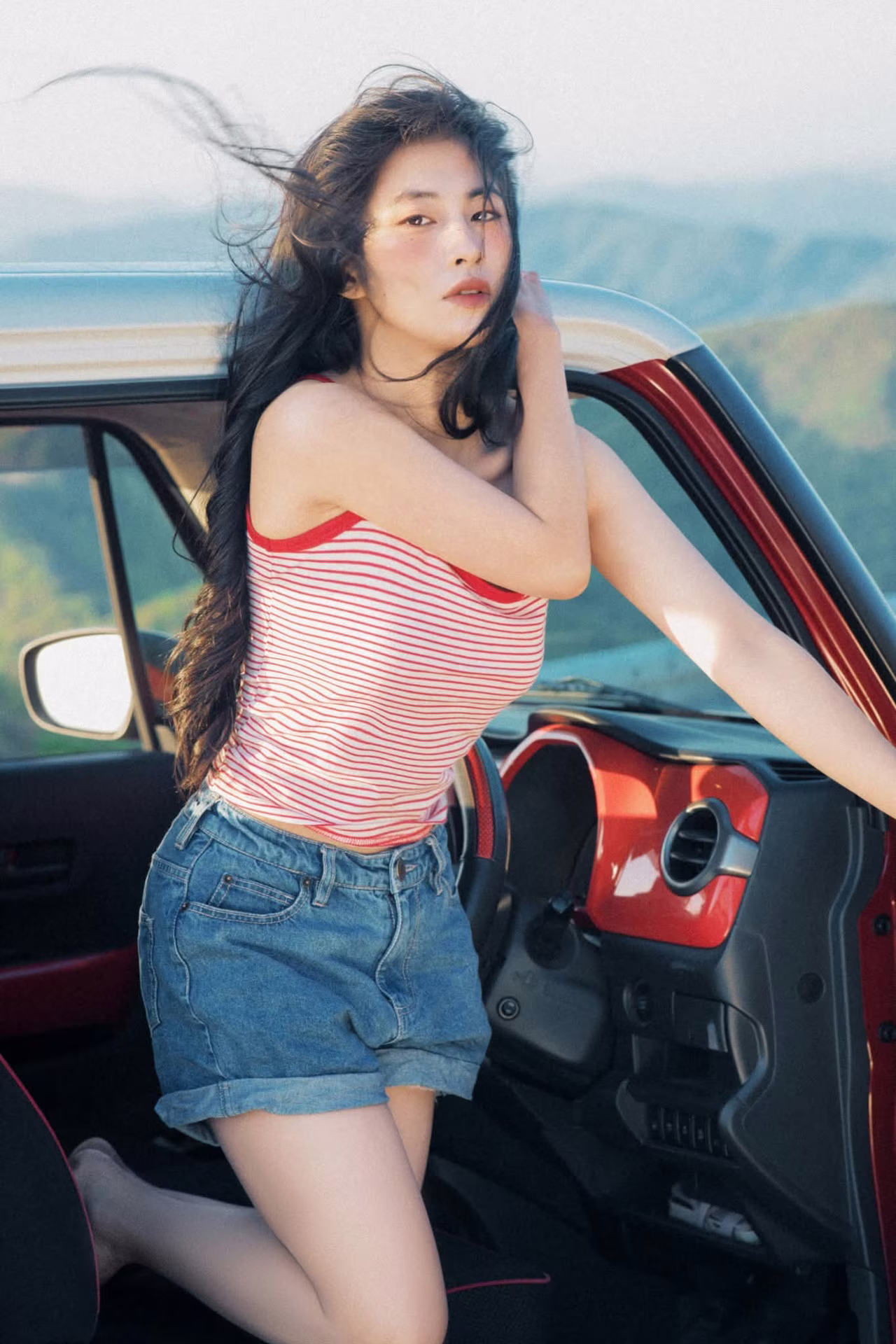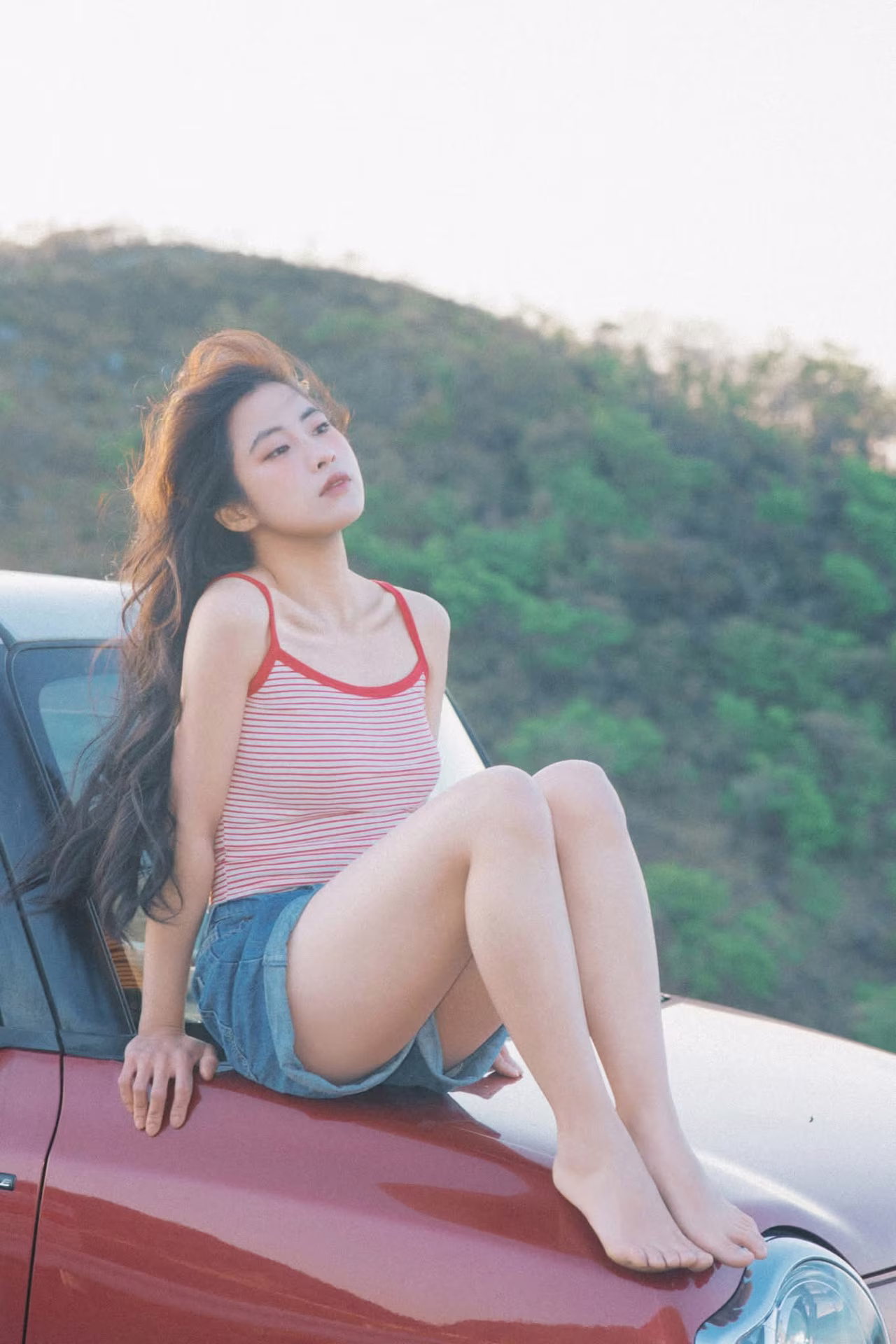This beautiful image captures a poetic moment of a young woman exuding a free-spirited, relaxed vibe. She sits casually on the hood of a striking red car, dressed in simple yet captivating summer attire: a striped tank top and energetic denim shorts. The gentle late afternoon sun caresses her long, flowing hair, creating a natural and vibrant beauty. In the background, lush green hills suggest a distant journey, an exciting adventure. This is not just a fashion photograph but also a symbol of youth, the desire to explore, and to savor every beautiful moment of life. The image radiates an elegant, romantic charm, evoking a sense of absolute peace and freedom amidst nature. #Vietnamese #pretty #charm