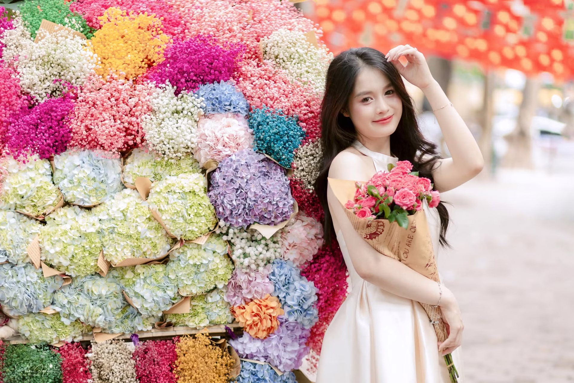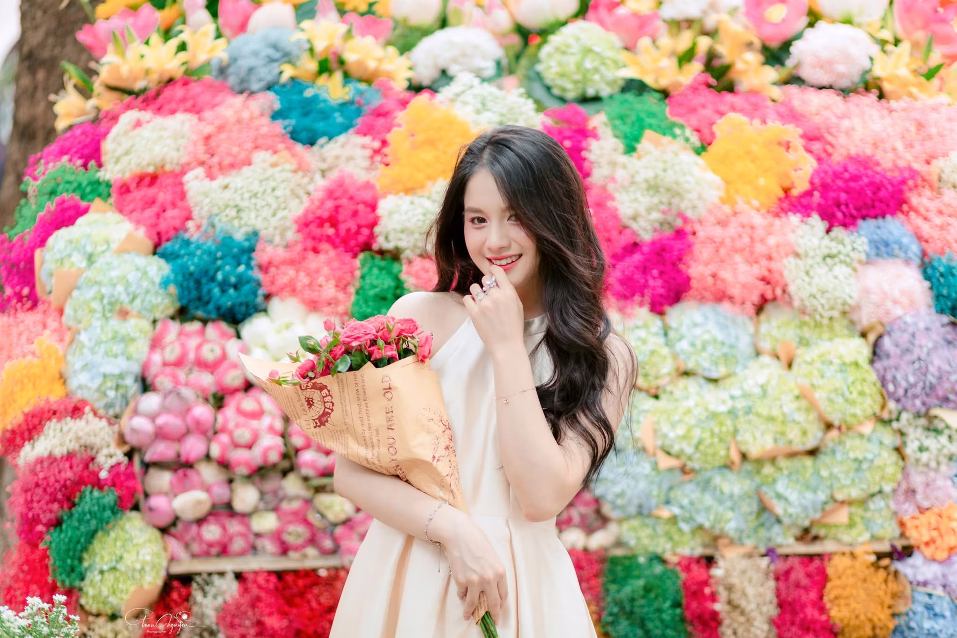 This captivating photo beautifully portrays the graceful and elegant charm of a Vietnamese woman in a traditional yellow Ao Dai, a profound cultural symbol. Her long flowing hair and gentle demeanor with hands clasped create a poetic and reverent image, evoking a sense of calm. The woman not only wears the attire but also embodies the essence of Vietnamese culture through every gesture and expression, radiating a serene and profound beauty. This elegance inspires a feeling of peace, tranquility, and spiritual depth, drawing viewers into a space of solemnity and devotion. It is a meaningful moment celebrating timeless traditional beauty and the Vietnamese soul. #Vietnamese #pretty #charmVGU No.133: Elegant Girl with a Radiant Smile Amidst a Colorful Floral Backdrop