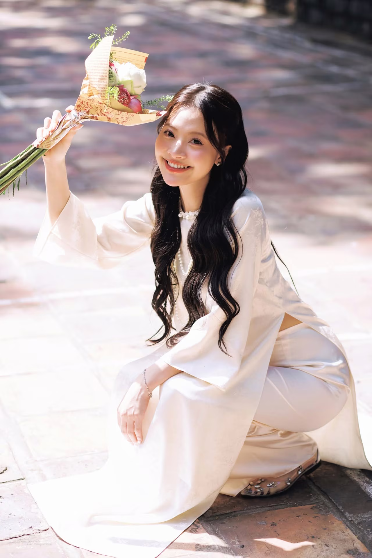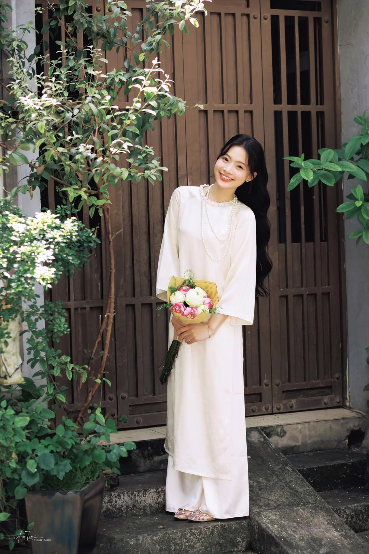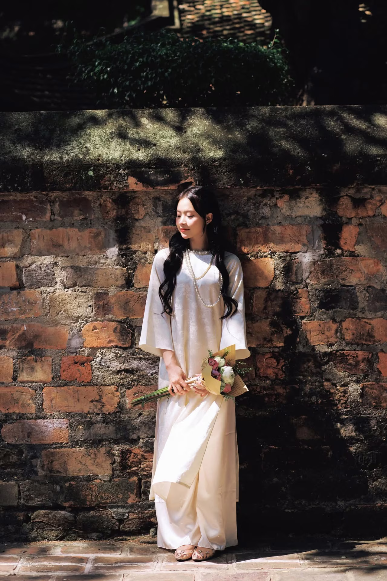 This image VGU No.131 captures the elegant beauty of a young Vietnamese woman in a pristine traditional dress. She gently leans against an ancient brick wall, her long hair flowing and her gaze distant, exuding a contemplative and gentle charm. In her hands, she holds a delicate bouquet of white lotus flowers, a symbol of purity and the Vietnamese soul's beauty. Natural light skillfully creates interplay of light and shadow, highlighting the soft lines of her traditional attire and the nostalgic ambiance of the surroundings. This portrayal not only celebrates the graceful beauty of Vietnamese women but also evokes timeless traditional cultural values, offering viewers a sense of peace and profound reflection. Discover the harmonious blend of classic and contemporary in every frame. #Vietnamese #pretty #charmVGU No.131: Explore the Ethereal Beauty of a Vietnamese Lady in White Ao Dai with Lilies