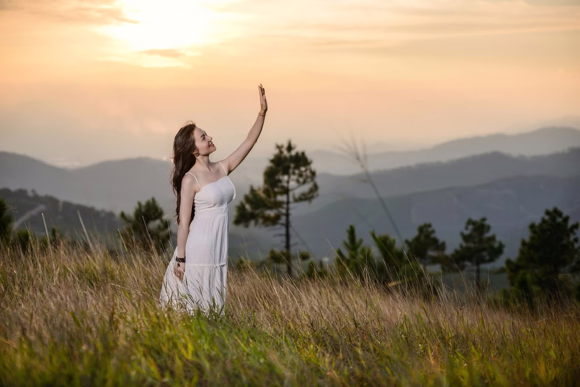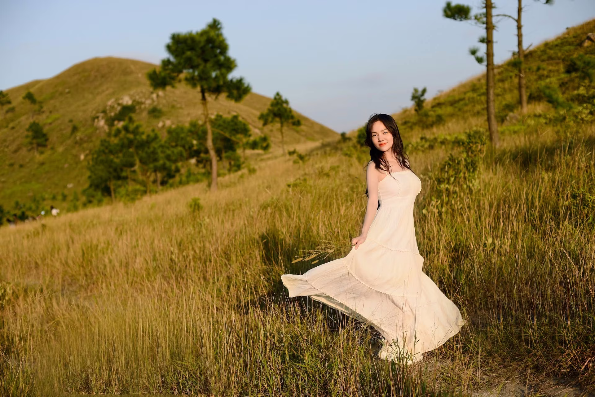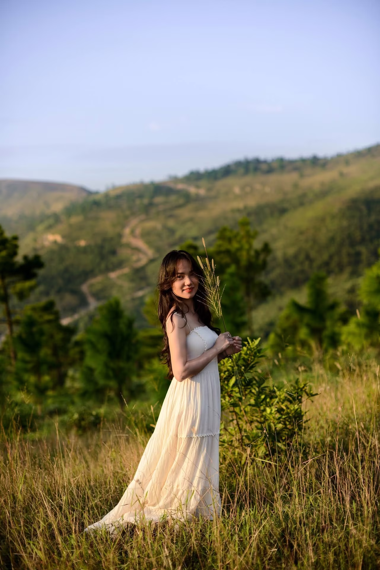 This VGU No133 photograph beautifully captures a young woman with a gentle and elegant charm. Her radiant smile and bright eyes immediately draw attention. Her long flowing hair and pristine white dress further enhance her graceful and refined appearance. The girl holds a small, delicate bouquet of flowers, a romantic touch that perfectly blends with the vibrant, multi-colored floral background. This lush floral setting creates an enchanting scene, highlighting her fresh, vibrant youthful beauty. More than just a portrait, this image tells a story of freshness, joy, and natural beauty shining with captivating allure. #Vietnamese #pretty #charmVGU No.134: Enchanting White Dress Muse in Pine Forest: Capturing Natural Beauty and Romantic Golden Hour Moments