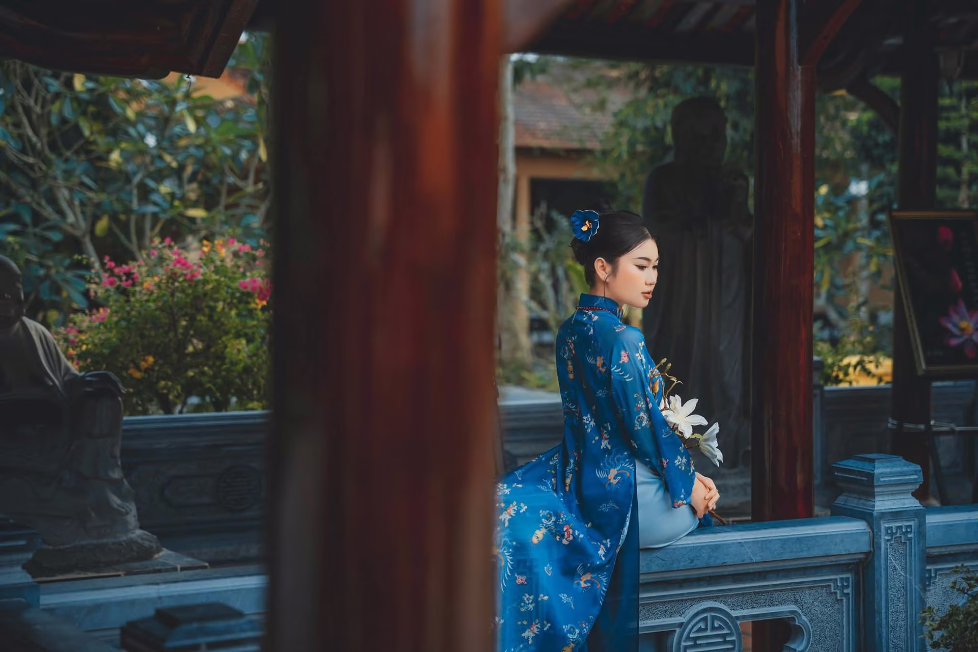 This stunning photograph captures the beautiful moment of a Vietnamese lady in a pristine white ao dai. She radiates an ethereal and gentle beauty, seated amidst lush green natural scenery and ancient stone steps. Holding a bouquet of white lilies, she seems to blend seamlessly into the peaceful surroundings, creating a poetic visual. Her traditional ao dai is worn with exquisite grace, highlighting her elegance and sophistication. Every detail, from her dreamy gaze to her delicate gestures, conveys a refined charm that captivates the heart. This image is a perfect fusion of human beauty and picturesque landscape, an enduring symbol of timeless Vietnamese grace. It is not just a piece of art but also a tribute to traditional beauty and purity. #Vietnamese #pretty #charmVGU No.132: Elegant Yellow Ao Dai Beauty Inspiring Vietnamese Cultural Grace