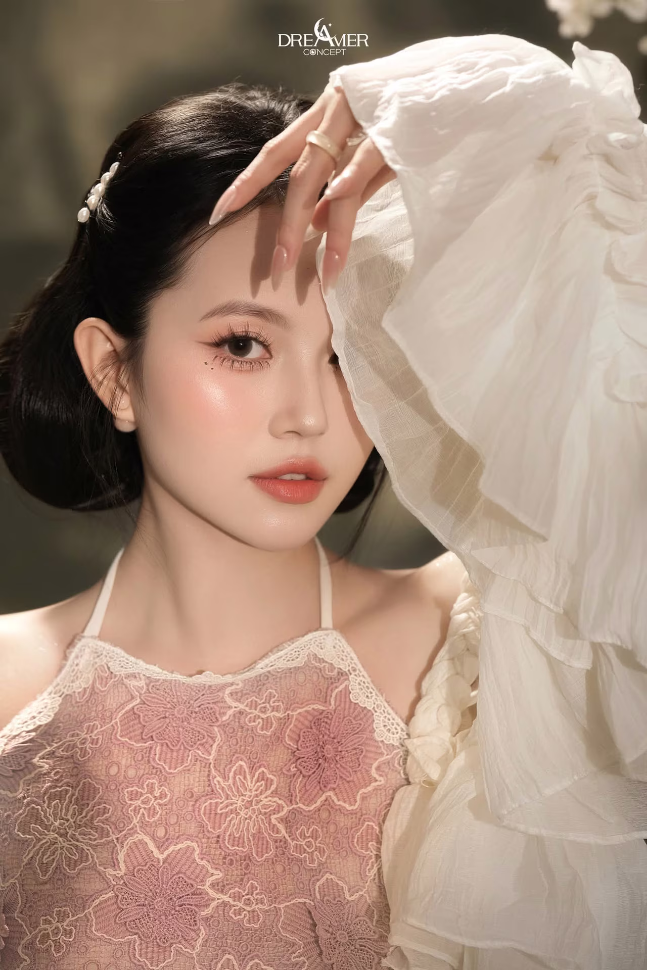 This captivating image beautifully portrays the delicate and alluring charm of a young woman. She is gracefully posed on a bed, adorned in exquisite white lace lingerie that accentuates her slender figure and radiant skin. Soft, natural light streams in from the window, creating a dreamy and romantic boudoir atmosphere. Her expression conveys a subtle shyness yet undeniable magnetism, with deep eyes and flowing long hair. This is more than just a portrait; it's an artistic boudoir moment where natural beauty and sensuality are elegantly expressed. The photograph evokes a sense of intimacy, tenderness, and irresistible allure, inviting viewers to appreciate the sophistication and inner beauty of the subject. #Vietnamese #pretty #charmVGU No.131: Graceful young woman in traditional dress, timeless Vietnamese beauty against ancient brick.