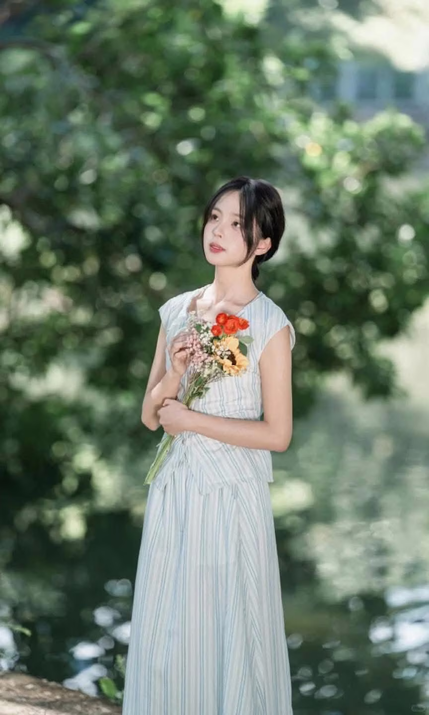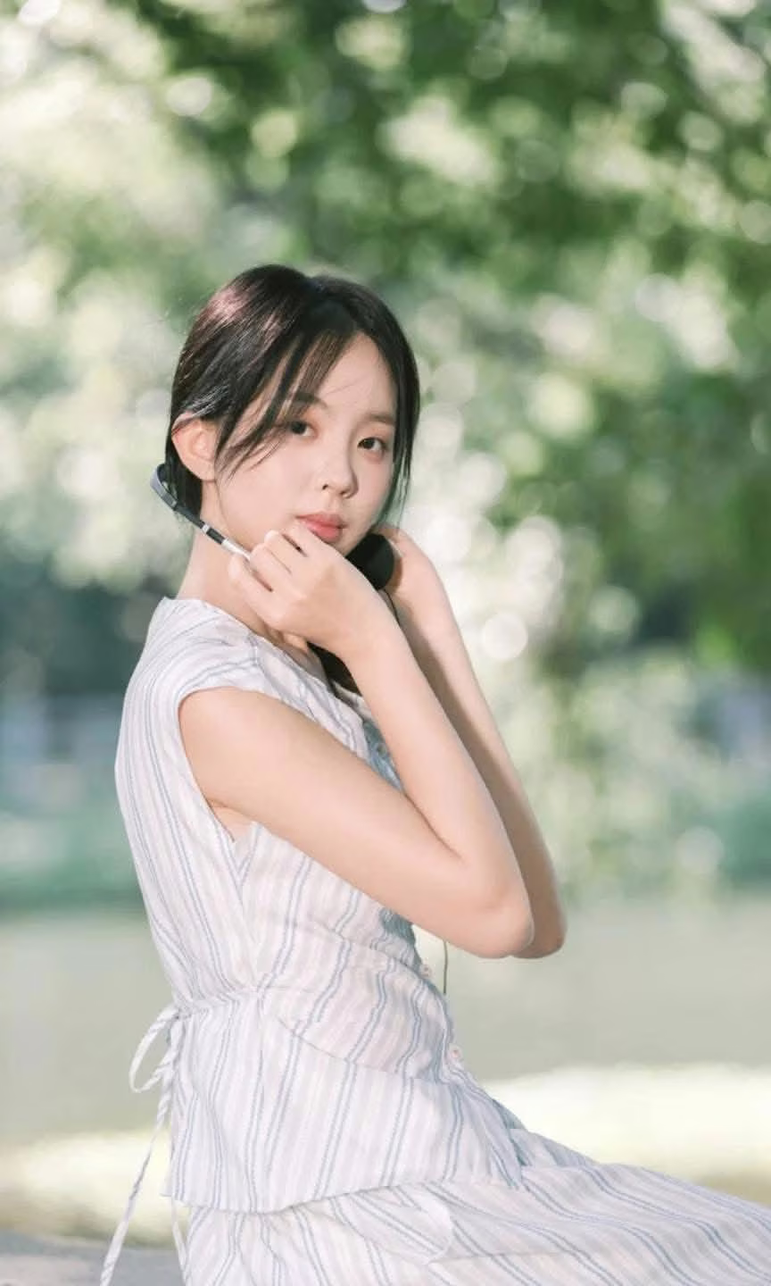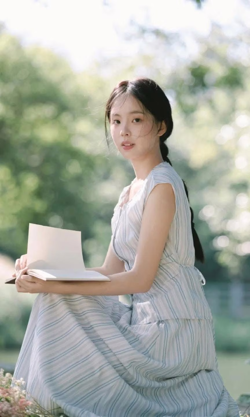 This VGU No.139 image captures a serene and beautiful moment of a young woman. Sitting on a large rock under the shade of an ancient tree, the girl with her simple braided hair and light striped dress exudes natural, understated beauty. Gentle sunlight filters through the lush green foliage, creating sparkling streaks of light on the trees and water in the background, highlighting the tranquil atmosphere. She is intently looking at an object in her hands, perhaps a small book or notebook, suggesting contemplation and peacefulness. The fresh natural setting with its dominant green hues offers a sense of relaxation, an ideal place to find peace away from life's hustle and bustle. This is a wonderful tranquil moment, where time seems to slow down, leaving a lasting impression of the beauty of stillness. #Vietnamese #pretty #charmVGU No140 Explore the Graceful Vietnamese Beauty An Elegant Girl Amidst Ancient Architecture Traditional Charm That Captivates