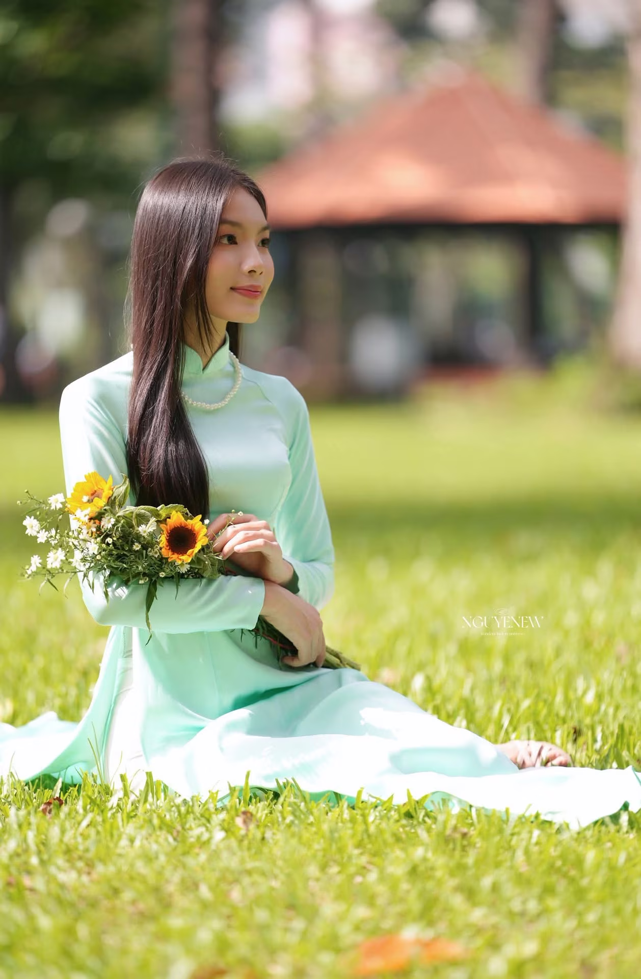VGU No.151: This exquisite photograph beautifully captures the gentle and elegant charm of a Vietnamese woman adorned in a delicate mint green traditional Ao Dai. Standing gracefully amidst a lush green natural setting she subtly holds a vibrant bouquet of flowers behind her back creating a poetic and romantic scene. Her distant gaze and soft smile radiate grace purity and the profound cultural beauty of Vietnamese women. The Ao Dai perfectly embraces her figure highlighting her soft contours and showcasing a harmonious blend of tradition and contemporary elegance. This is not just a portrait but a celebration of the timeless beauty of Vietnam's national attire.#AoDai #Vietnamese #Beauty #Traditional #Culture #Elegant