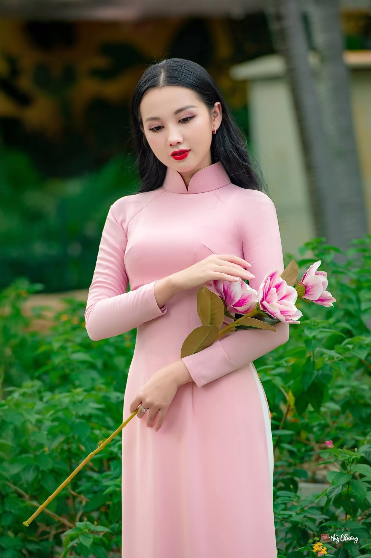 In this captivating image VGU No.150, a Vietnamese woman embodies serene grace and timeless elegance, adorned in a beautiful pink Ao Dai. She sits thoughtfully on a peaceful tree-lined path, holding a delicate bouquet of fresh white flowers, her gaze softly directed upwards as if lost in a dream. The flowing lines of her traditional dress and her long wavy hair create a poetic and tranquil scene. This photograph beautifully captures the essence of Vietnamese charm and the harmonious connection between nature and human beauty. The soft pink of her Ao Dai contrasts gently with the lush green foliage, evoking a sense of calm and romance. It is a moment of quiet reflection, where traditional allure and elegant simplicity are celebrated in a truly enchanting setting.#AoDai #Vietnamese #Beauty #Traditional #Graceful #Culture