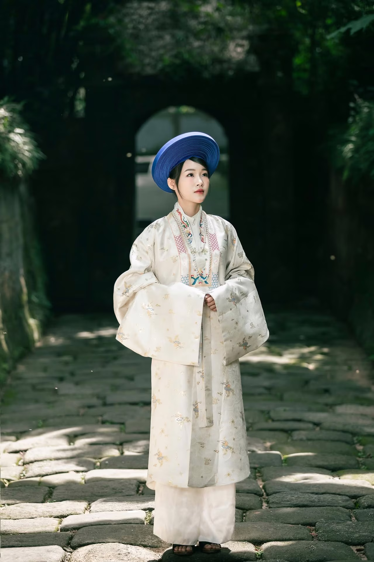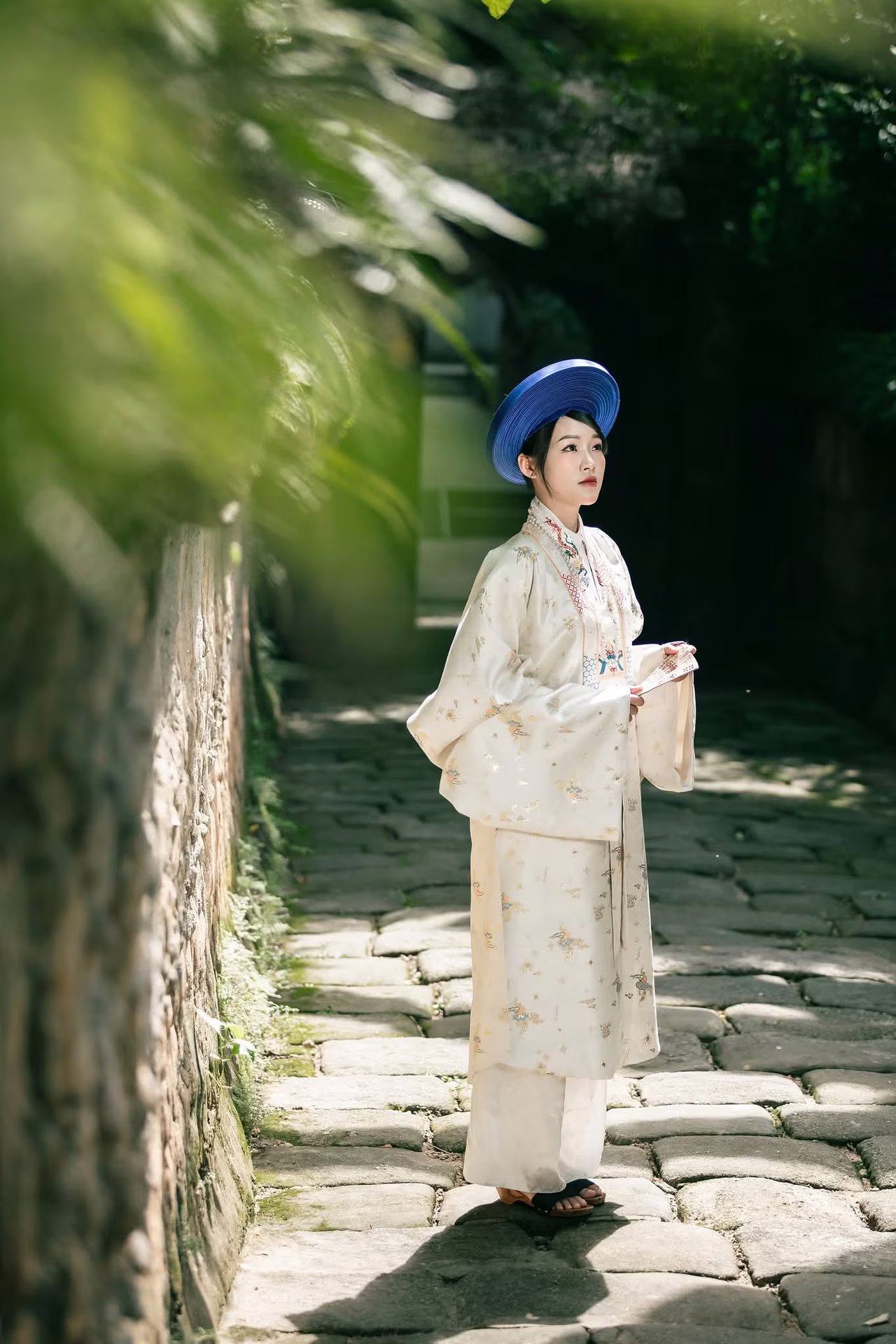 This photograph captures a beautiful moment of a young woman in traditional Vietnamese attire resembling a graceful Ao Dai She wears a distinctive blue traditional hat known as a mấn embodying ancient cultural charm Her elegant posture blends perfectly with the surrounding ancient space a mossy stone path Soft sunlight filters through the leaves creating an ethereal lighting effect highlighting her delicate beauty This is not just a fashion photo but a profound homage to Vietnam's traditional heritage This image evokes feelings of serenity and the timeless beauty of the national culture It invites viewers to explore the historical and artistic values in every detail The picture is a vivid testament to the exquisite beauty of Vietnam#Traditional #AoDai #Vietnamese #Culture #Beauty #Heritage #Ancient #Costume