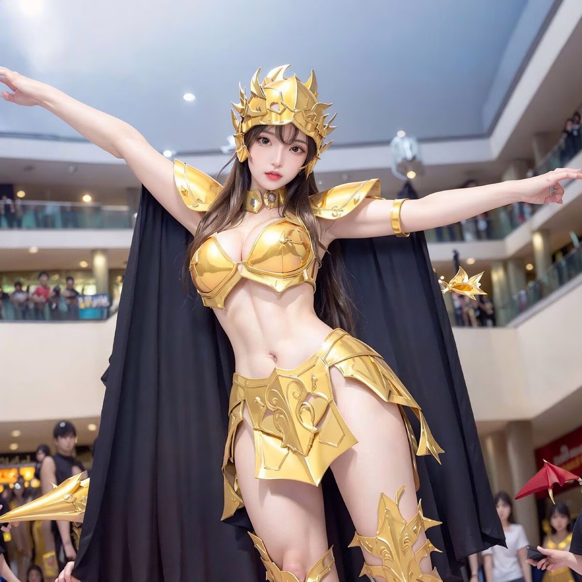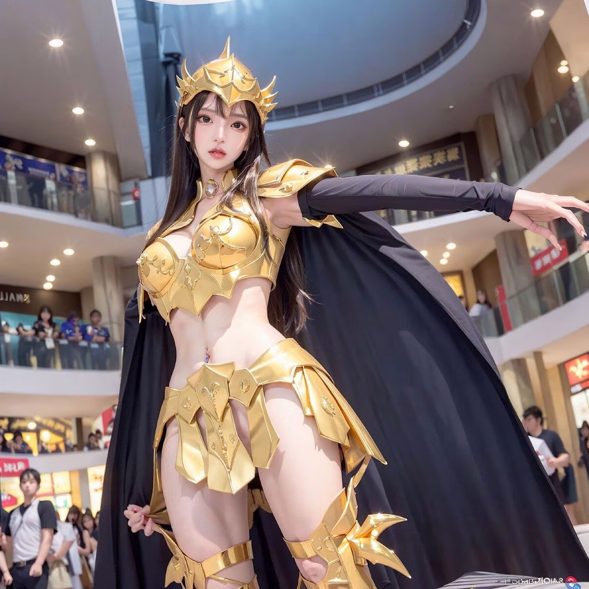 This stunning image portrays a Golden Saintess, exuding regal beauty and latent power. She is adorned in a shimmering intricately designed golden armor that reflects light brilliantly evoking the image of a mythical warrior from the Saint Seiya saga. The golden helmet and flowing white cape further enhance her majestic and noble appearance. Her confident resolute gaze and poised stance convey bravery and a steadfast determination to uphold justice. The realistic style of the photograph offers a vivid experience as if this Golden Saintess is present right before our eyes ready for any challenge.#SaintSeiya #Golden #Saintess #Cosplay #Female #Warrior #Realistic