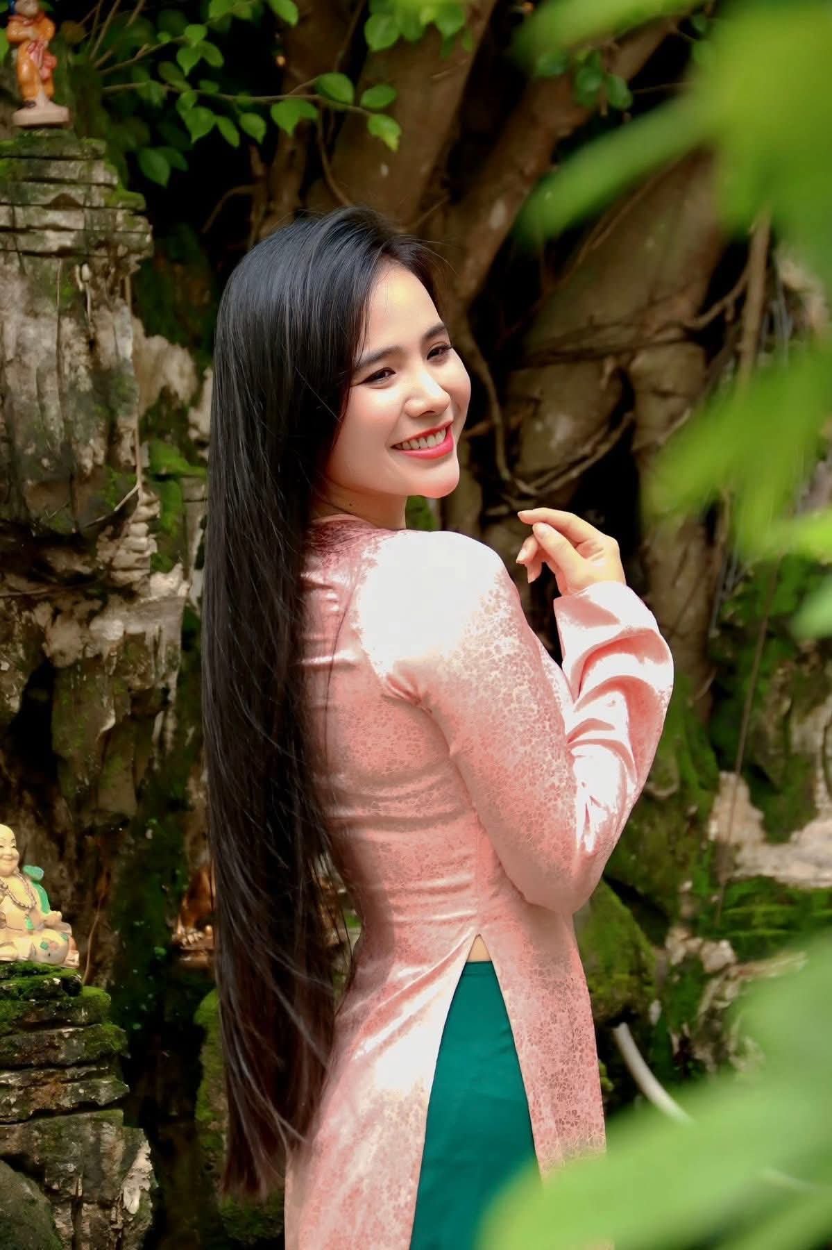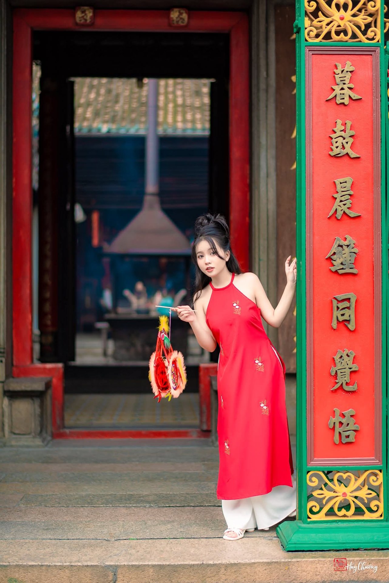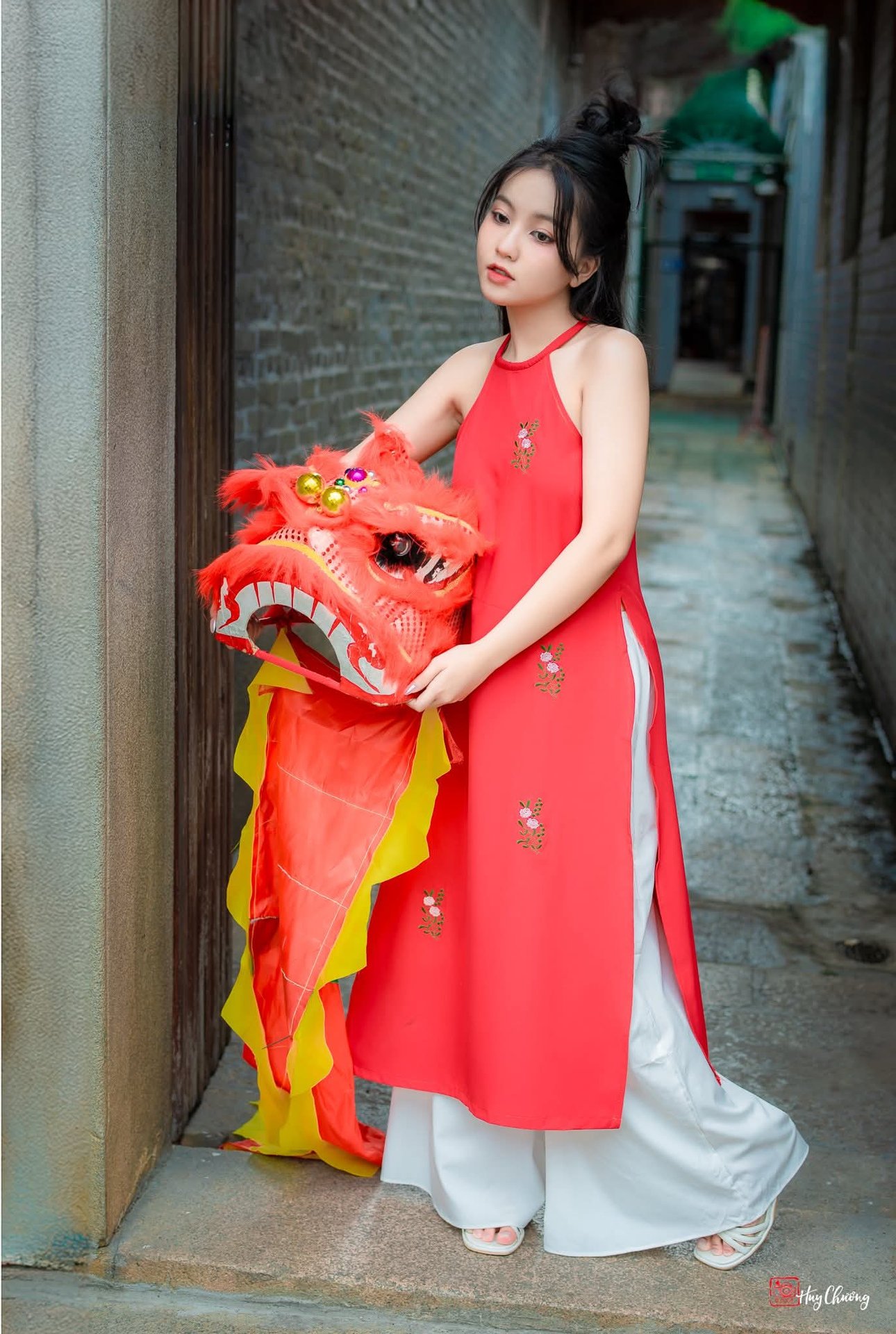 This image 1000018036.jpg captures a charming Vietnamese girl gracefully posing in a modern red ao dai, paired with elegant white wide-leg trousers. She beams a radiant smile and makes a friendly heart gesture. A distinctive highlight is the miniature lion dance head she holds, a familiar symbol of traditional festivals and Vietnamese folk culture. The ao dai, while showcasing traditional beauty, also embraces a contemporary flair. This picture beautifully combines human charm with rich cultural values, inviting tourists to explore unique travel experiences in Vietnam. It truly embodies the pride in Vietnam's vibrant cultural heritage.Gentle, Pure Girl in Lush Nature | Human & Landscape
