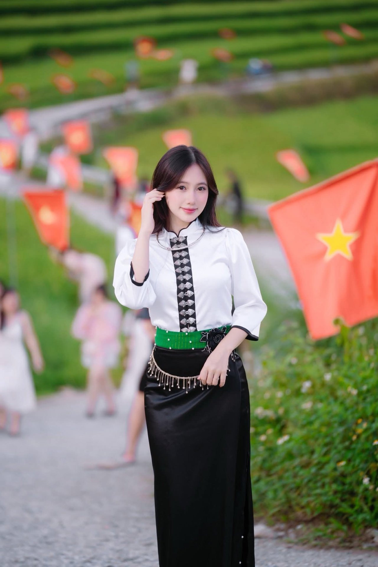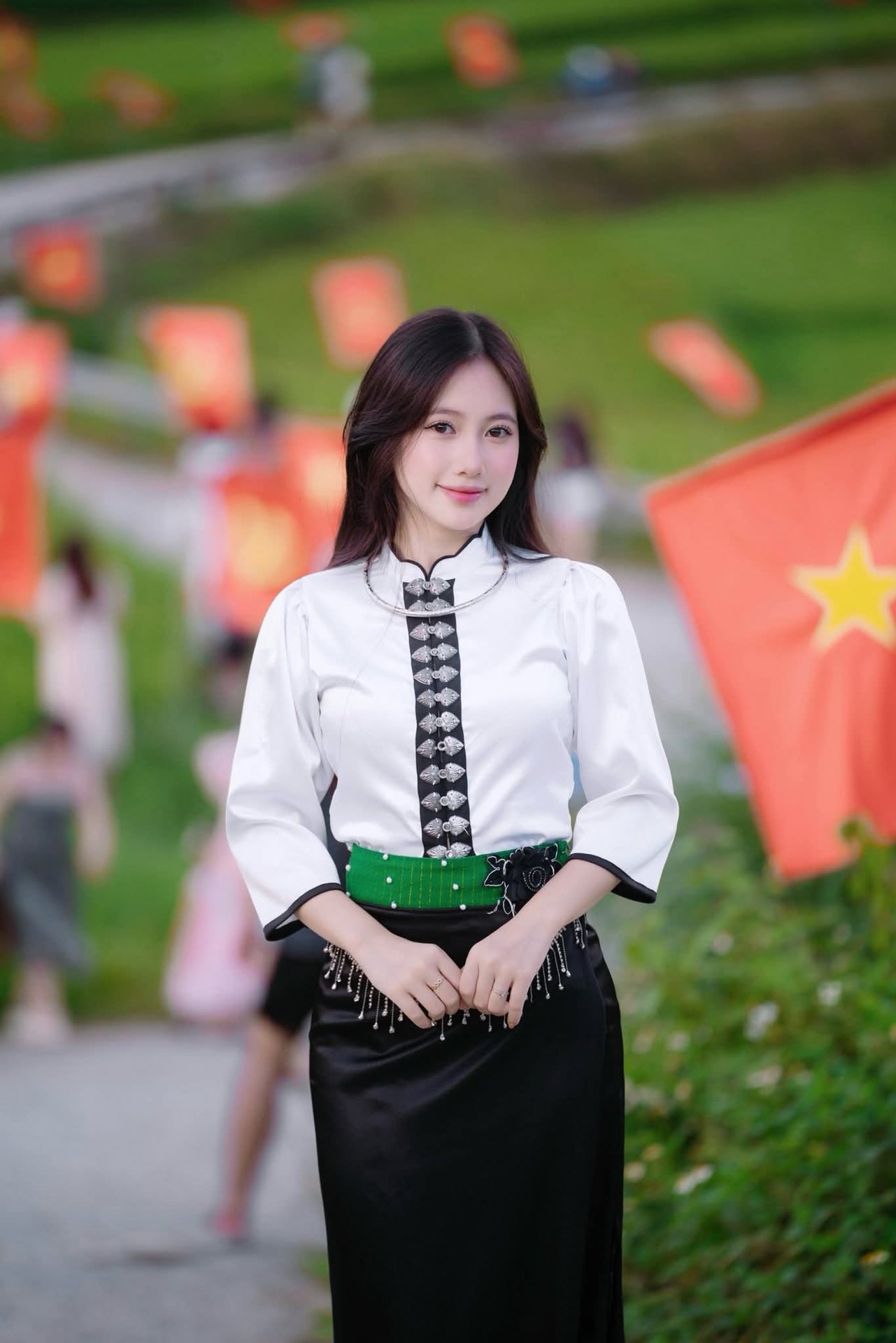 The image captures the graceful beauty of a Vietnamese girl in traditional ethnic costume. Her radiant smile and exquisite outfit, featuring a white embroidered top and a black skirt accentuated by a green sash, beautifully showcase the unique cultural essence of Vietnam's ethnic groups. In the background, a lush green landscape is adorned with vibrant Vietnamese flags, evoking a festive and patriotic atmosphere. This photograph not only celebrates the beauty of Vietnamese people but also highlights the rich diversity of Vietnamese culture and traditions, especially the traditional attire, a true symbol of national identity.Gentle Beauty of Vietnamese Woman in Traditional Ao Dai at Hoan Kiem Lake