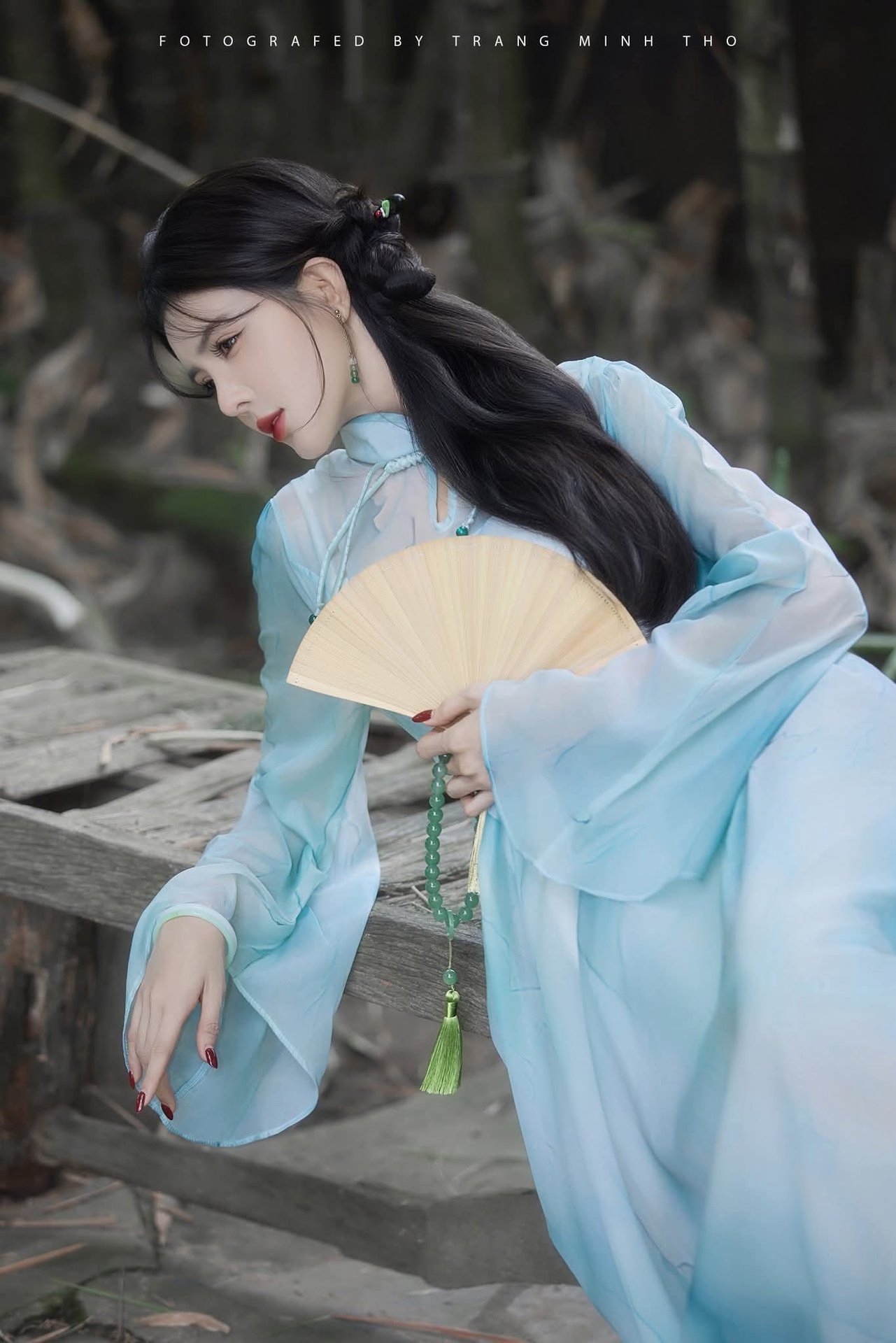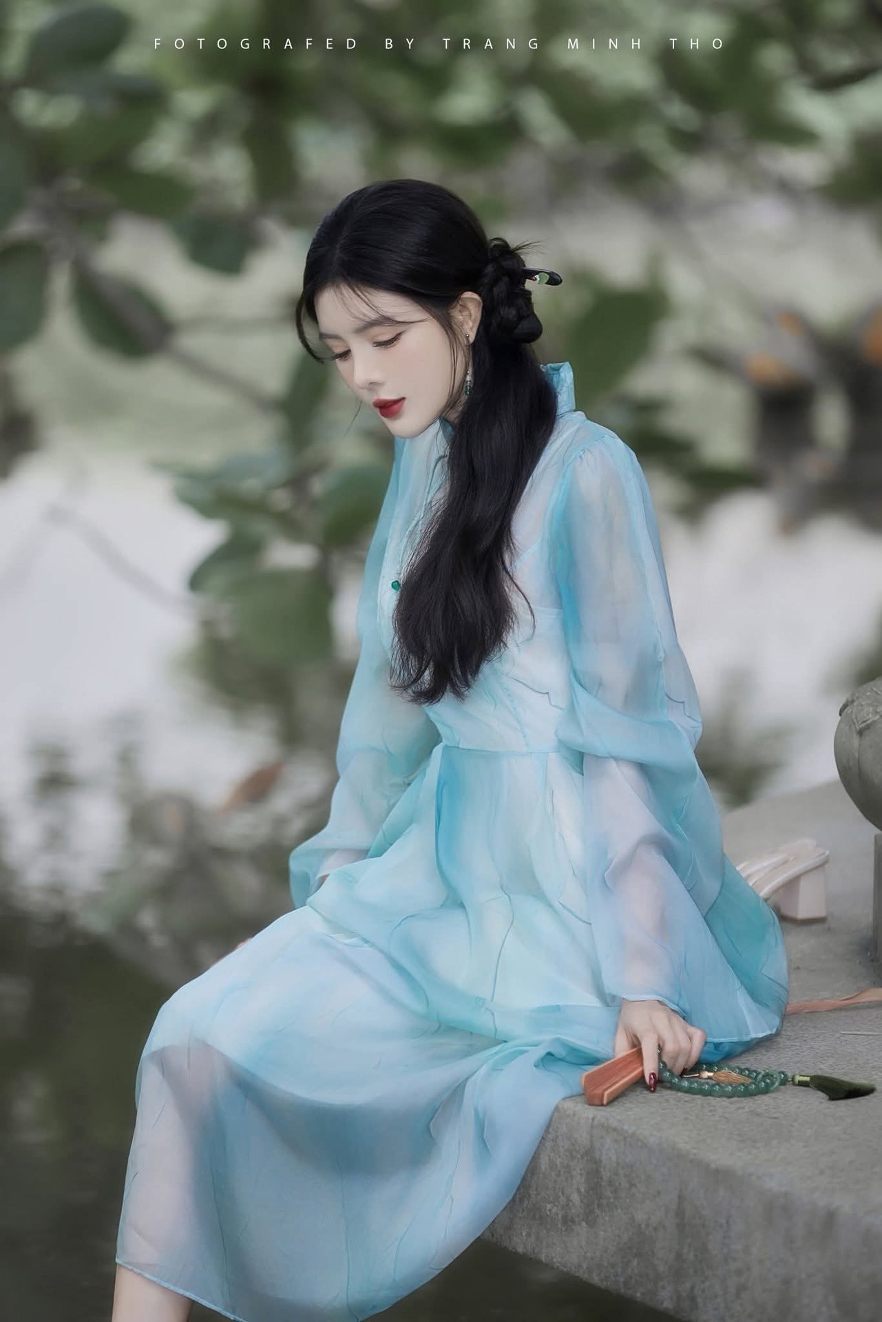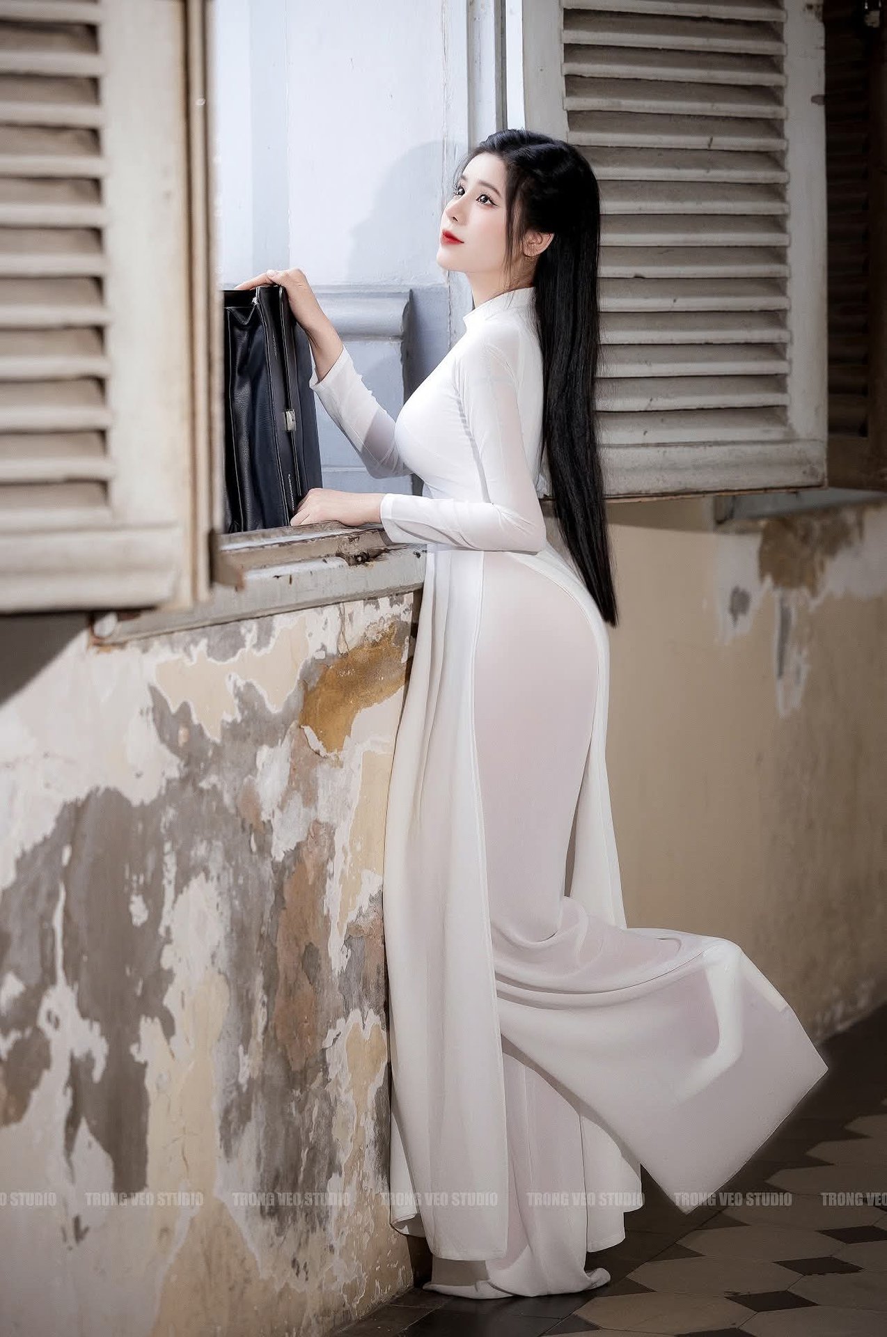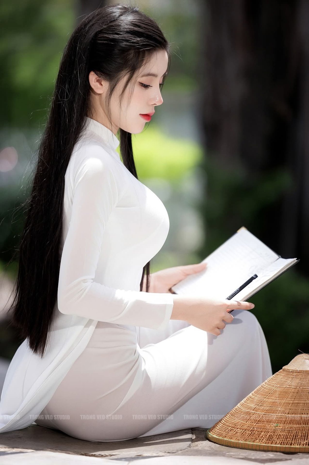 This stunning portrait captures a captivating hot girl with elegant long legs, gracefully seated by a dreamy pond. Dressed in beautiful traditional attire of soft pastel blue, she exudes an alluring and serene charm. The lush natural backdrop combined with classic architectural elements creates a truly aesthetic and poetic atmosphere. The image evokes a sense of peace and romance, subtly showcasing cultural beauty. It's an inspiring photograph for those who appreciate the harmonious blend between human elegance and a tranquil environment.Vietnamese Girl in Traditional White Ao Dai | Graceful Beauty