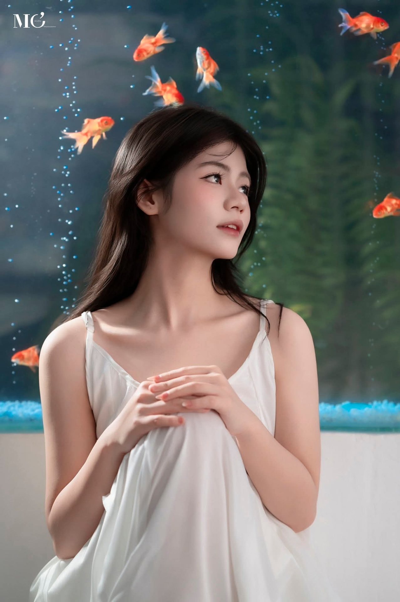 Image presents an exquisite artistic portrait of a young woman seemingly immersed in an enchanting underwater world. Her long, flowing hair and serene expression are beautifully highlighted as vibrant goldfish swim gracefully around her, creating a truly poetic and dreamlike atmosphere. The soft, ethereal lighting filters through the water, emphasizing her delicate features and the magical interaction with the aquatic life. This isn't just a photograph; it's a captivating piece of art that evokes tranquility and a profound connection to nature. Perfect for those seeking artistic and poetic imagery, this portrait offers aesthetic inspiration and visual storytelling.