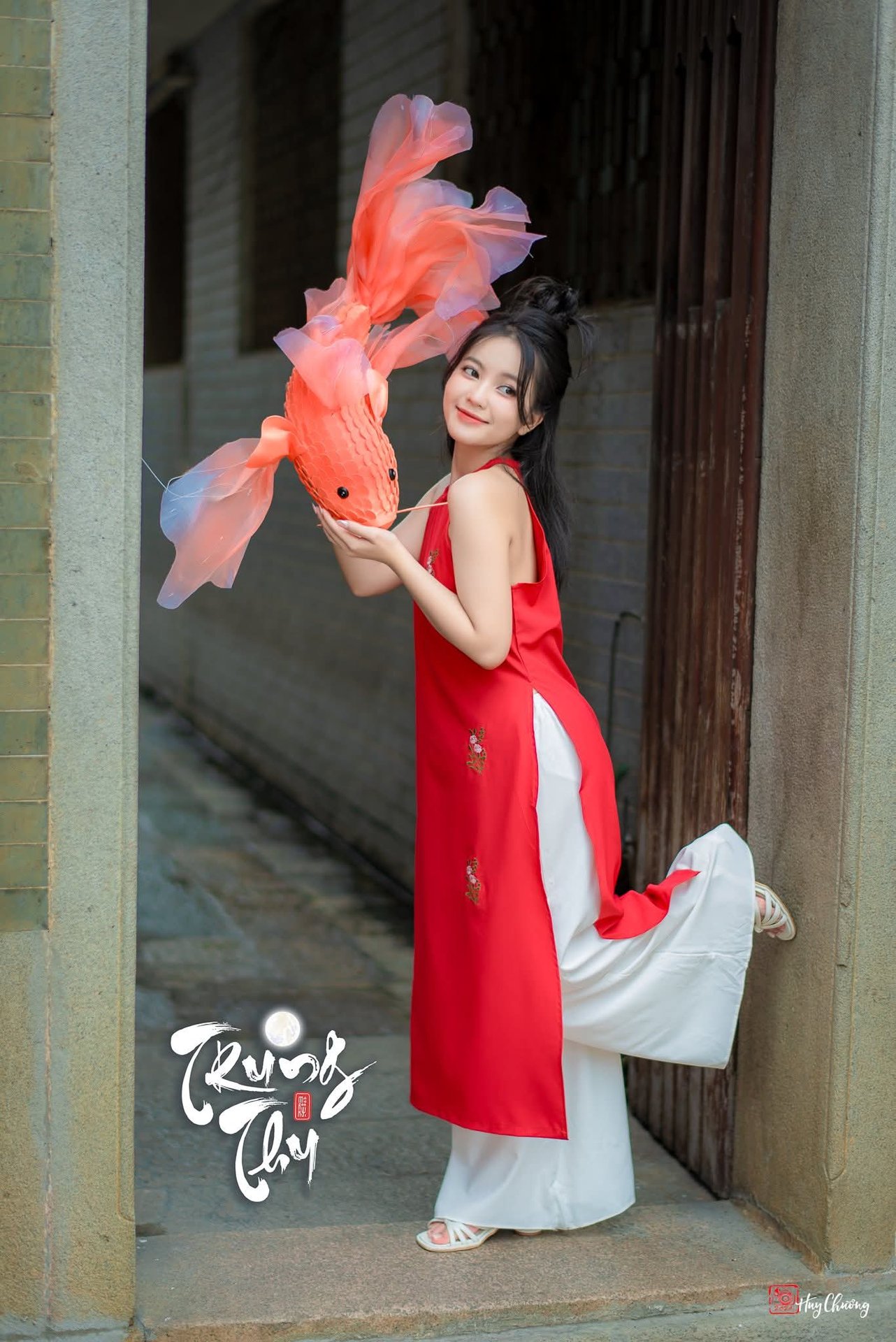 This image `1000017867.jpg` beautifully captures the elegant charm of a Vietnamese woman in modernized traditional attire. The young lady exudes grace and gentleness as she holds a vibrant carp-shaped lantern, a familiar symbol of Vietnamese culture, especially during festivals like the Mid-Autumn Festival. This portrayal not only celebrates the beauty of its people but also highlights profound traditional values, embodying the rich cultural identity of Vietnam. The red lanterns in the background further enhance the festive atmosphere, creating a vibrant and meaningful scene. It's a perfect blend of contemporary beauty and deep-rooted tradition.