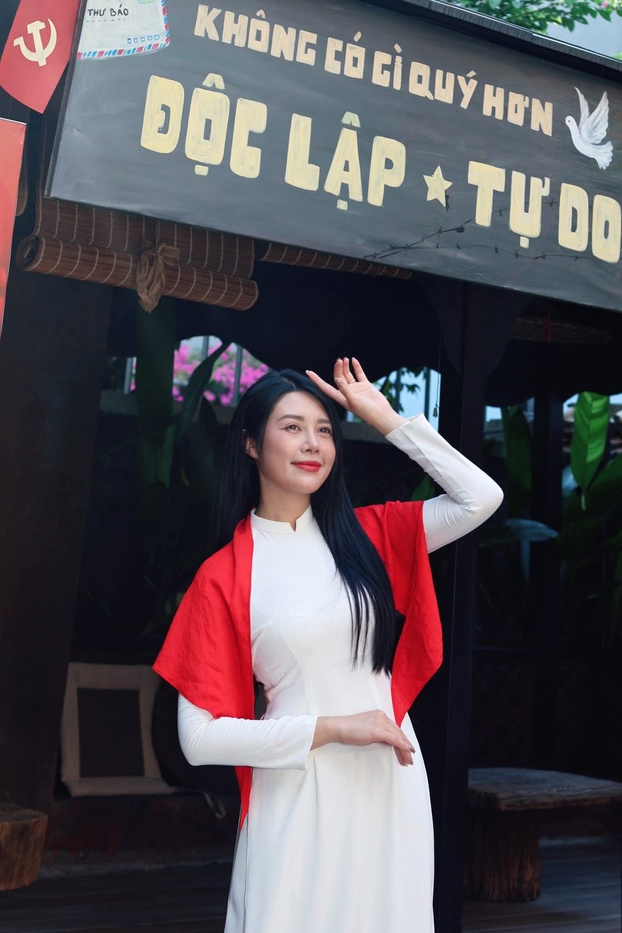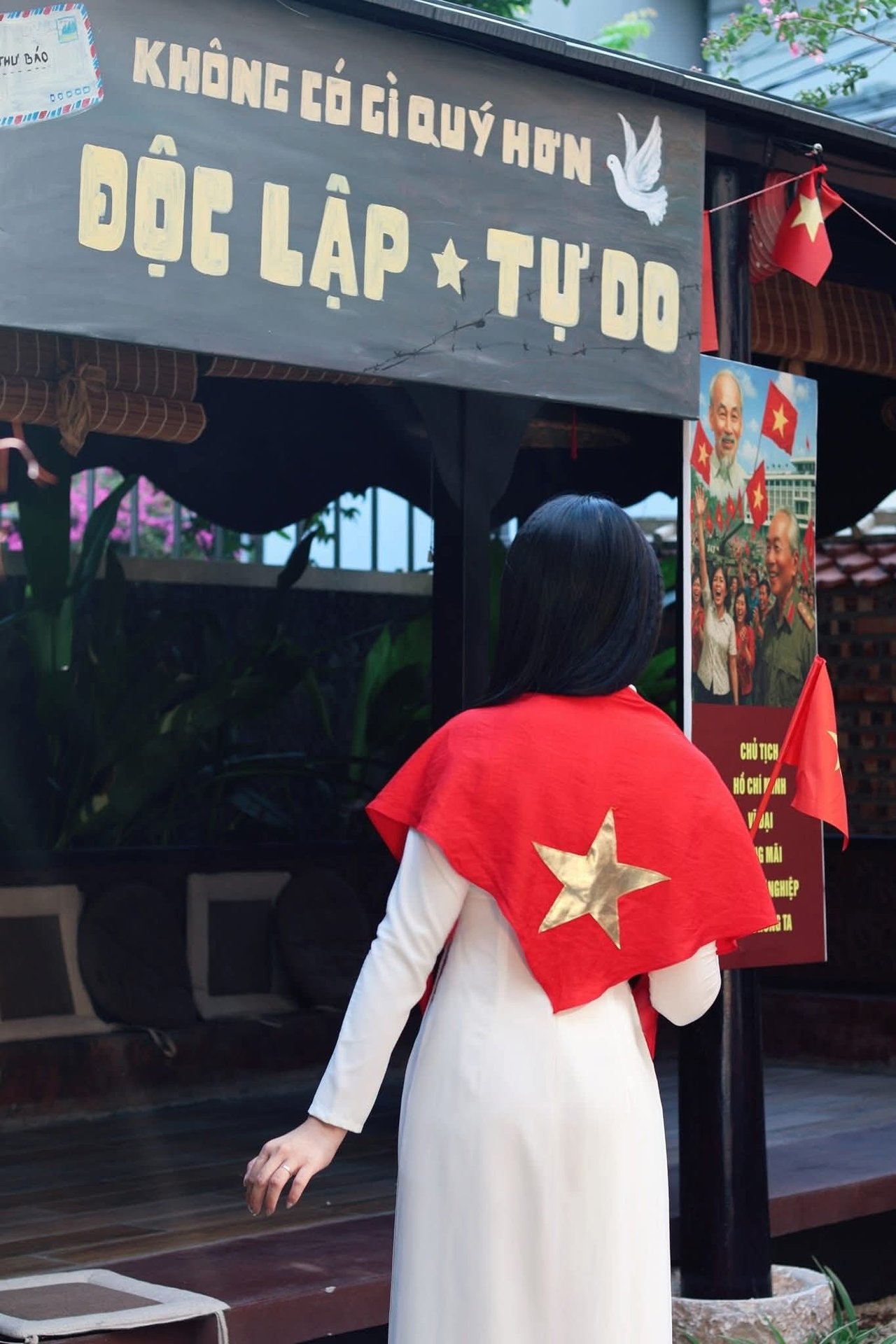 This captivating image features a graceful Vietnamese woman elegantly dressed in a pristine white Ao Dai, beautifully complemented by a vibrant red shawl. Her radiant smile and confident pose exude the timeless charm and traditional beauty of Vietnamese women. The powerful backdrop, bearing the message "Nothing is more precious than Independence * Freedom", underscores a deep sense of patriotism and profound cultural values. This photograph not only celebrates the iconic Ao Dai attire but also embodies national pride, offering a compelling glimpse into the people and rich heritage of Vietnam.Graceful Vietnamese Woman in Traditional Ao Dai