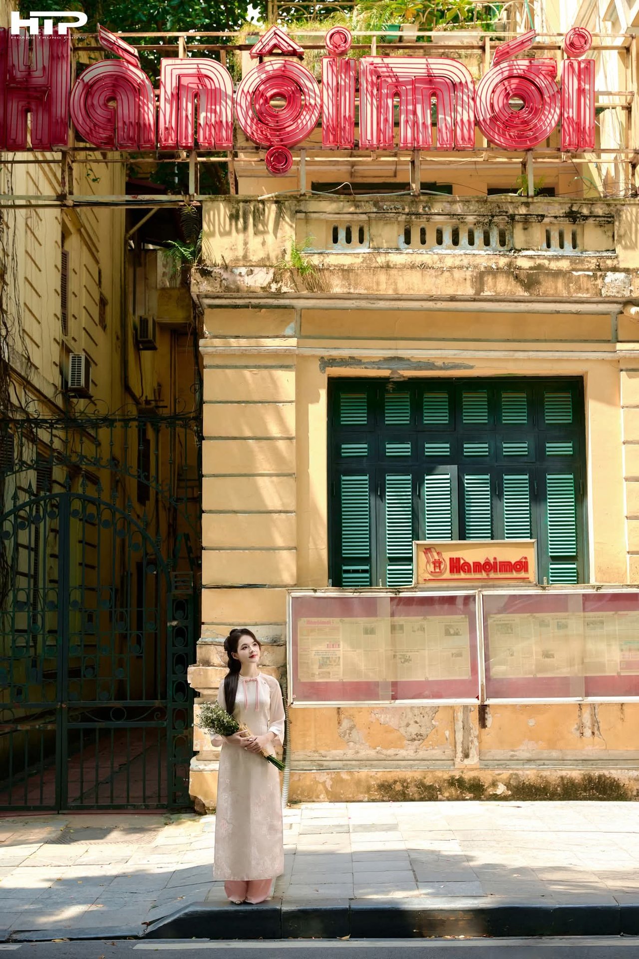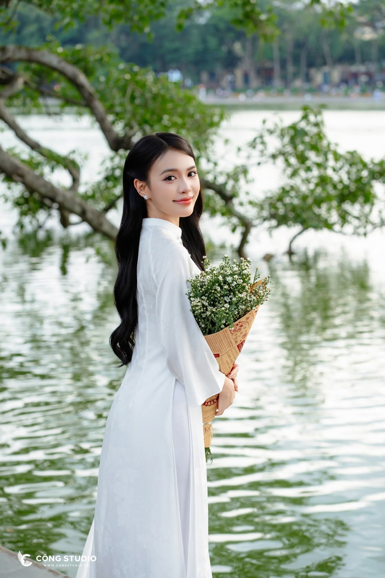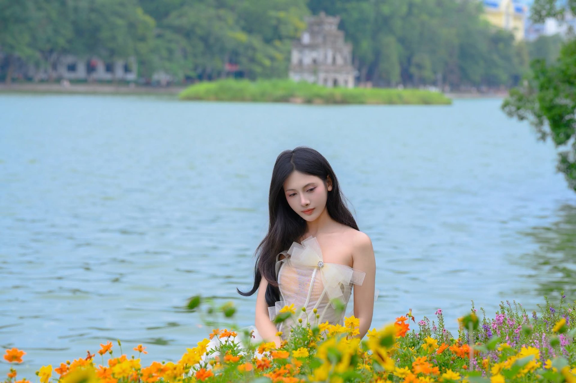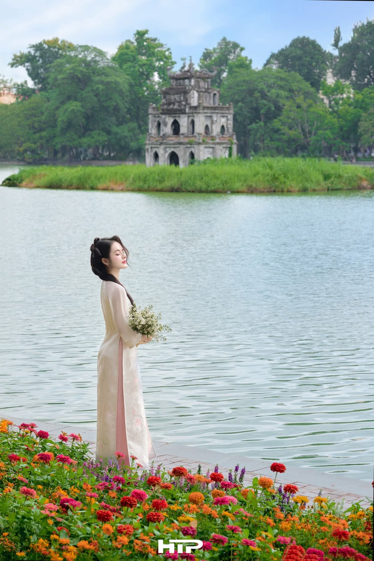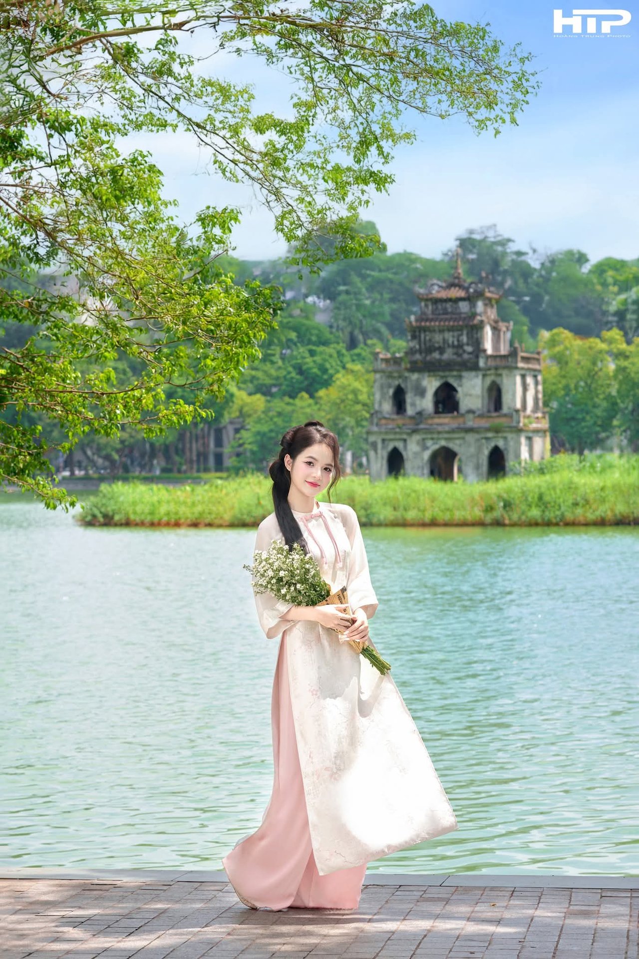 This stunning image beautifully portrays the gentle beauty of a Vietnamese woman in her elegant traditional Ao Dai. She is seated gracefully on a park bench by the serene Hoan Kiem Lake, with the iconic Turtle Tower (Thap Rua) visible in the background, creating a picturesque scene rich in Vietnamese culture. Her delicate pastel pink and white Ao Dai not only enhances her graceful figure but also embodies the charm of an East Asian woman. Holding a bouquet of white flowers, she exudes purity and lightness, symbolizing the beauty and spirit of the Vietnamese people. An ideal photograph for those seeking tranquility, traditional aesthetics, and the unique cultural identity of Vietnam.Majestic Vietnamese Natural Landscape: Immerse Yourself in Endless Beauty