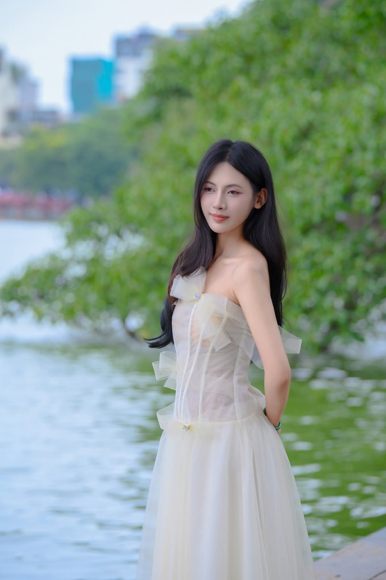 This captivating photo captures a serene moment of a young Vietnamese woman, exuding elegant and graceful beauty. She features long, smooth hair, fair skin, and a contemplative gaze, suggesting gentle introspection. Her stylish polka-dot halter top highlights a youthful, modern aesthetic. The softly blurred background hints at a cozy indoor setting, possibly a chic cafe or restaurant within a vibrant city. This image not only celebrates the natural charm of Vietnamese women but also portrays a sense of peace and sophistication in contemporary life. It's an ideal portrait for content related to lifestyle, fashion, or the inherent beauty of Vietnamese people, perfect for promoting urban female imagery.Vietnamese Ao Dai Beauty: Elegant Young Woman by Hoan Kiem Lake, Traditional Charm.