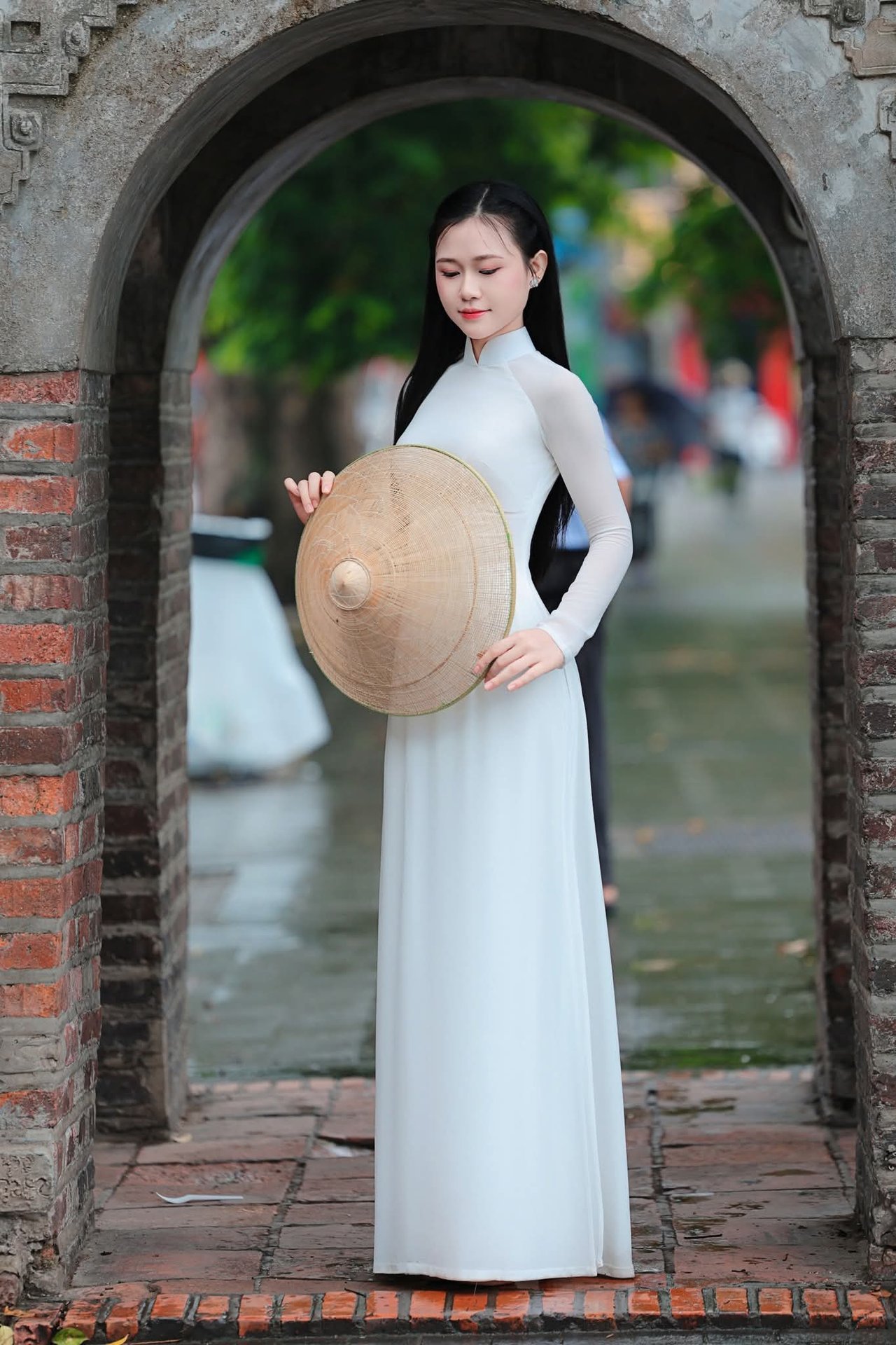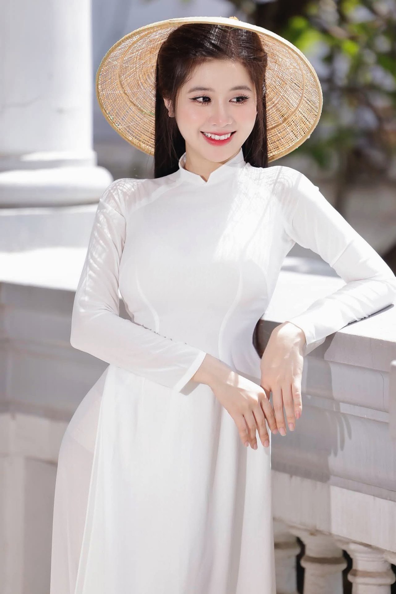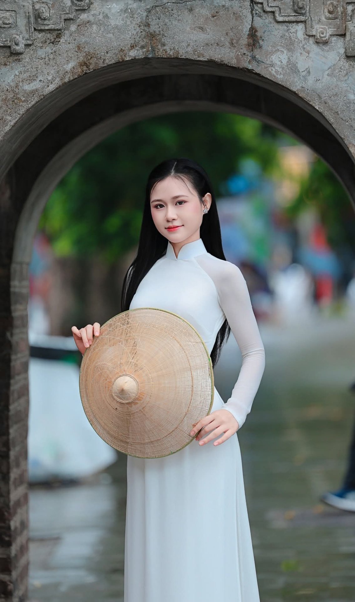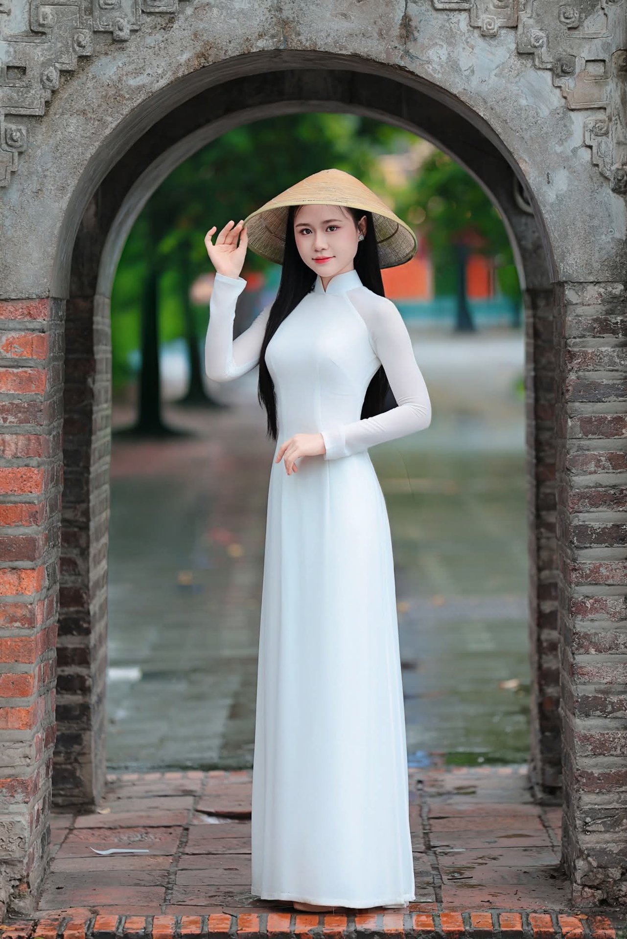 This stunning image captures the graceful moment of a beautiful Vietnamese woman in a pristine white Ao Dai. The traditional Ao Dai dress, a cultural symbol of Vietnam, accentuates her slender figure and gentle beauty. Holding a characteristic conical hat (nón lá) with delicate grace, she exudes elegance and poetic charm. This picture represents the traditional beauty and grace of Vietnamese women, deeply imbued with Vietnamese cultural identity. The photograph is not only an artwork but also an ode to the sophistication of the Ao Dai and the Vietnamese girl. Keywords: Ao Dai Vietnam, beautiful Ao Dai woman, traditional culture, conical hat, Vietnamese female beauty.Vietnamese Cultural Beauty: Girl in Traditional Attire