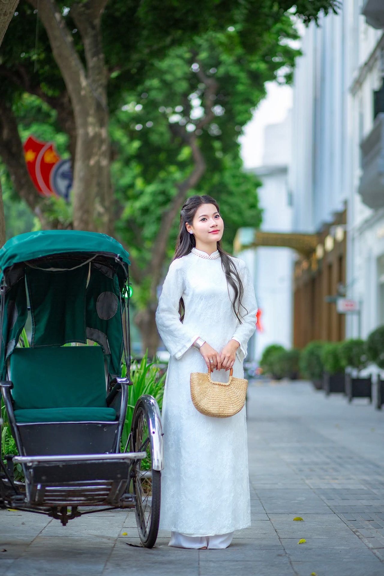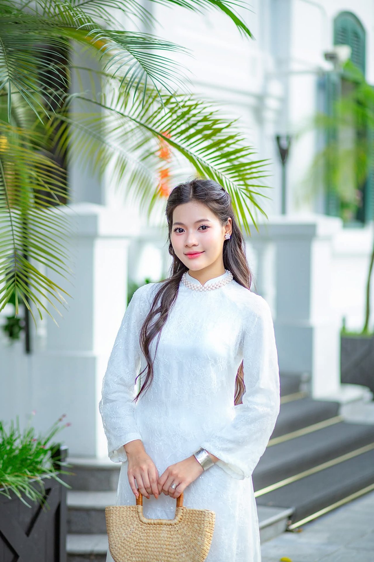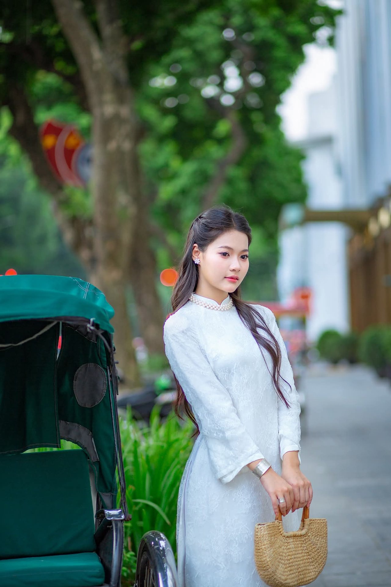 This captivating image features a young Vietnamese woman gracefully adorned in a pristine white Ao Dai. The traditional Ao Dai, with its exquisite design and flowing fabric, elegantly accentuates the gentle and ethereal beauty of Vietnamese women. With her long, wavy hair, delicate features, and a subtle smile, she embodies charm and profound cultural aesthetics. The rustic woven straw bag she holds adds to her natural, approachable appeal. This photograph beautifully represents the timeless traditional beauty and elegance of Vietnamese women, a cherished cultural icon. The harmonious natural backdrop further enhances the subject's captivating presence.