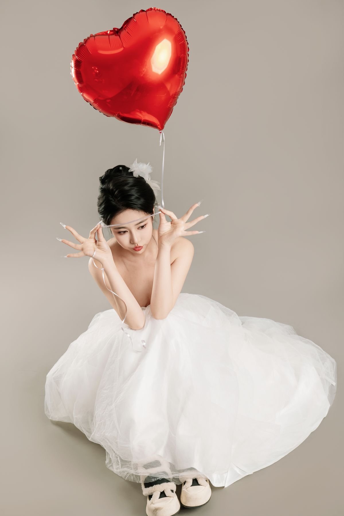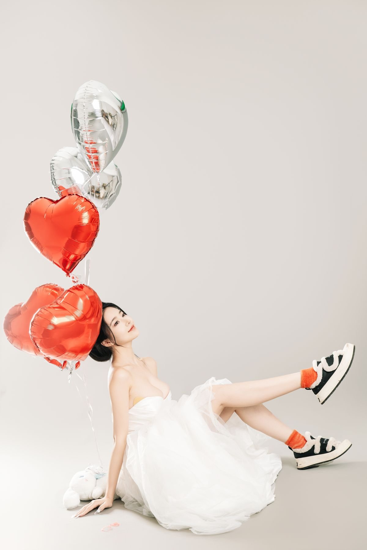 Coser Nnian's special Valentine's Day photoshoot unveils a captivating and elegant beauty Dressed in a pristine white flowing gown paired with unique patterned socks she exudes irresistible charm and sophistication Clusters of vibrant red and shimmering silver heart balloons symbolize passionate and romantic love adding a sweet touch to the composition Her gentle gaze and graceful pose full of expression make Nnian the undeniable focal point Every detail from the lighting to the artistic arrangement is meticulously crafted creating a photographic masterpiece that captures tender and emotional moments centered around the theme of love Explore the enchanting allure of Nnian in this exclusive photo series