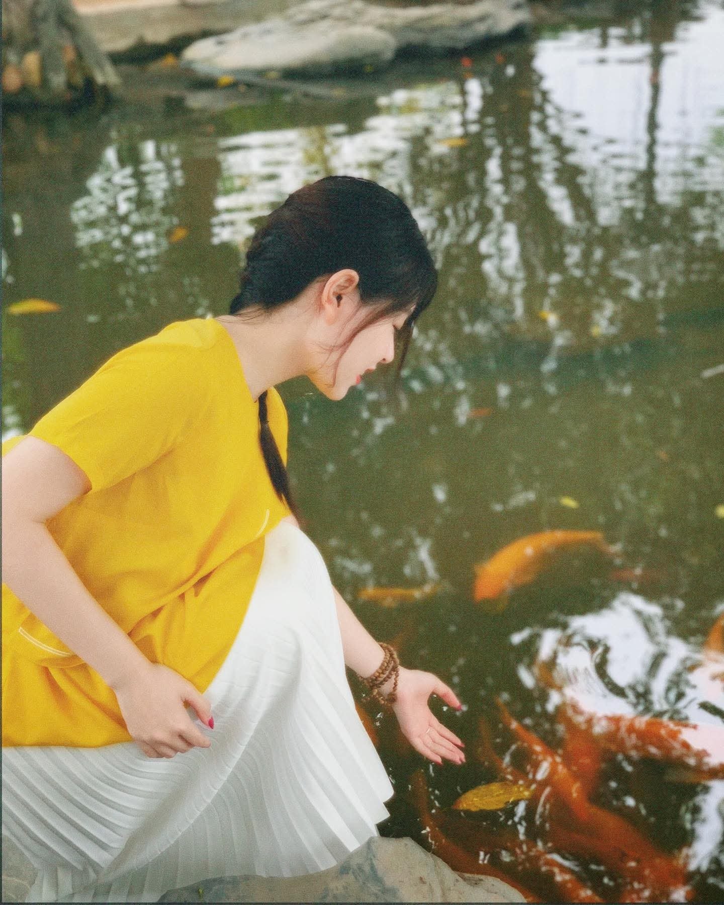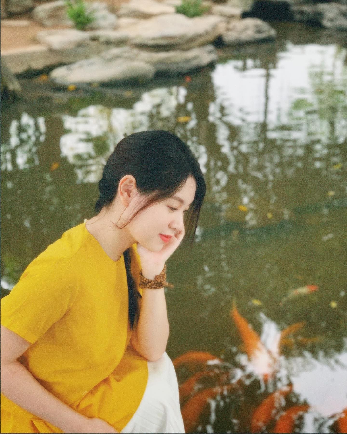 The image `1000018129.jpg` captures a serene moment of a young woman amidst vibrant hydrangea flowers. With a radiant smile and gentle eyes, she appears to be deeply enjoying the beauty of nature, creating an emotional `portrait`. Her bright yellow outfit further enhances her youthfulness and vitality. This picture not only celebrates the beauty of `people` but also illustrates the harmonious connection between `humans` and `nature`. It's a tranquil, peaceful moment that offers a sense of relaxation to the viewer, evoking the inner peace found when immersing oneself in the lush natural world.Graceful Vietnamese Woman in Traditional Ao Dai: A Portrait of Beauty