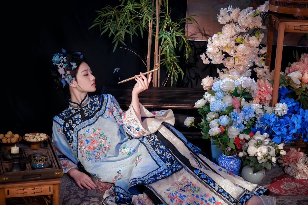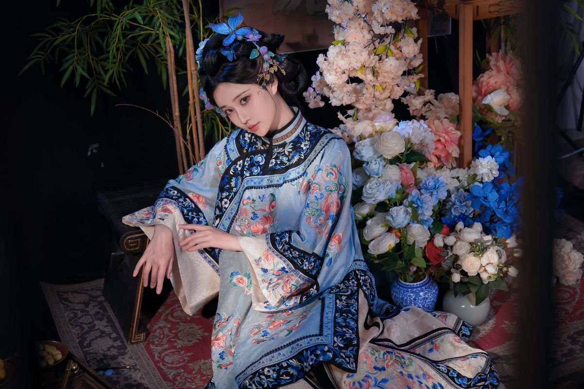 In this captivating image coser Nian Nian embodies the character 丝兰陵 exuding classic and serene beauty. She is adorned in an exquisite traditional Chinese costume featuring a dominant blue palette intricately embroidered with rich floral patterns. Her dark hair is elegantly styled in an updo embellished with delicate blue flower accessories creating a harmonious and noble aesthetic. Her deep gaze and gentle hand gesture convey grace and sophistication. The minimalist background featuring green bamboo foliage further accentuates the characters timeless and tranquil charm. This artistic cosplay showcases meticulous attention to both the elaborate attire and the captivating demeanor.