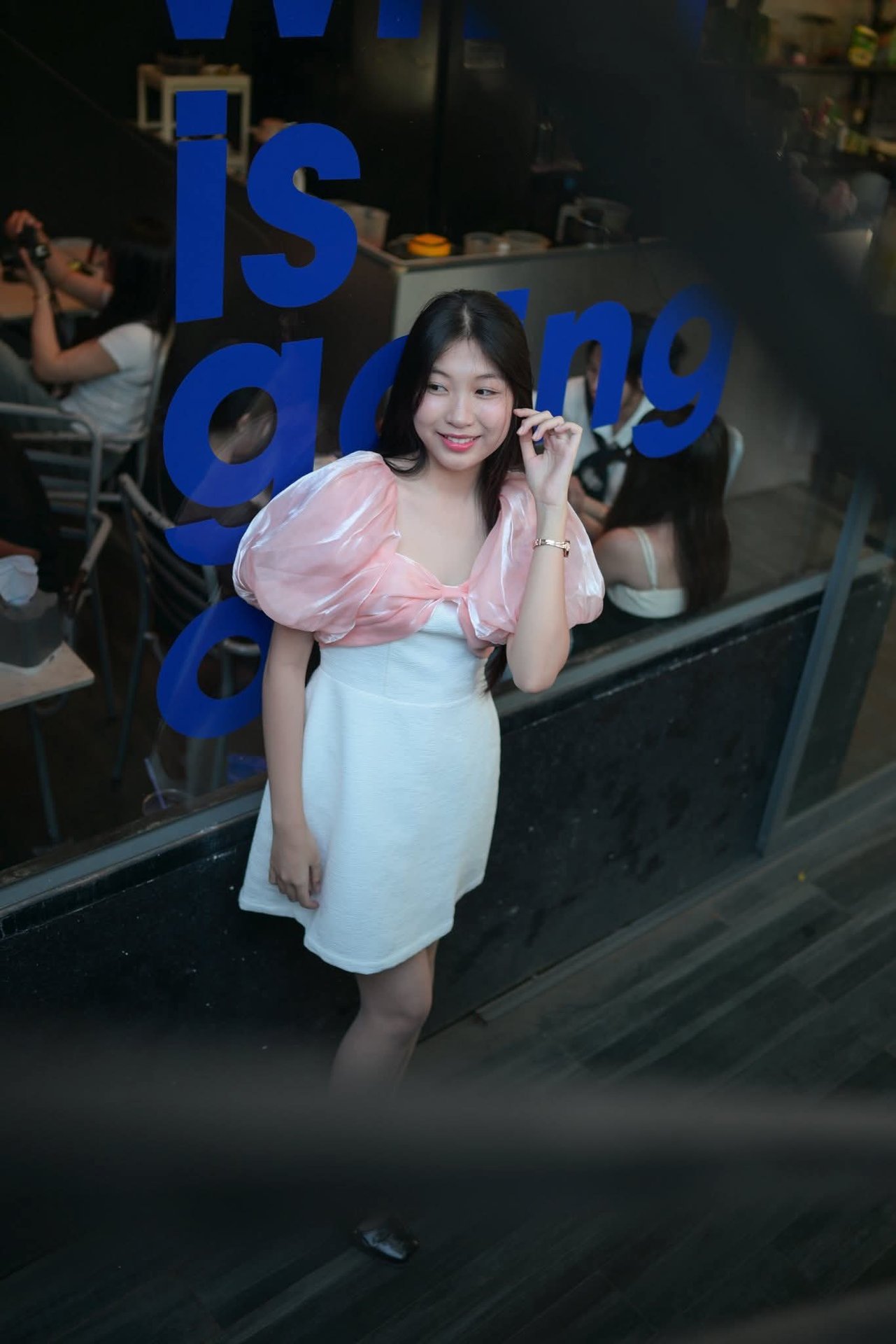Discover the radiant beauty of a young Vietnamese girl, exuding positivity with her bright smile. She appears gracefully in a modern outfit, featuring a pristine white dress paired with gentle pastel pink puffy sleeves, creating an elegant and feminine style. Her long, lustrous hair naturally enhances her gentle, East Asian charm. This photo not only captures a natural moment but also celebrates the youthful, modern beauty of Vietnamese women, making it suitable for fashion collections, lifestyle media, and showcasing the beauty of Vietnamese people.